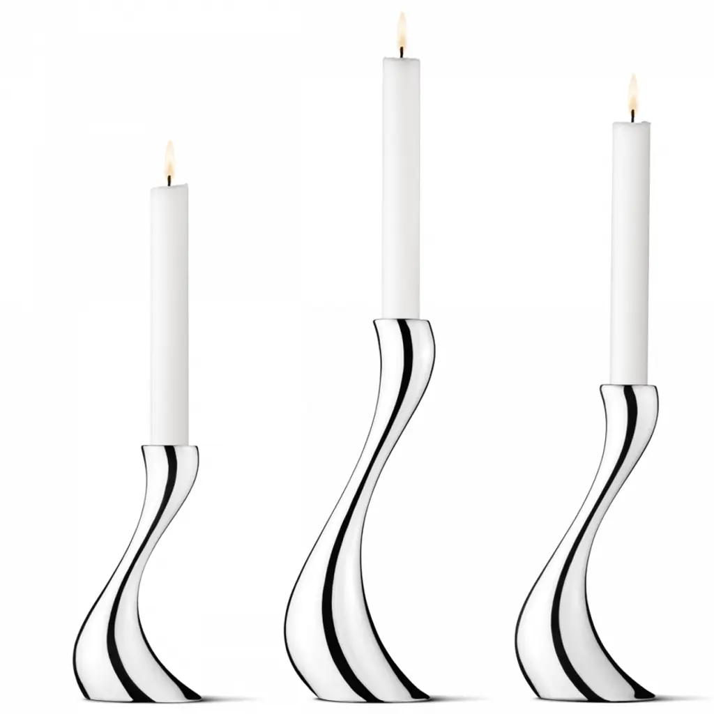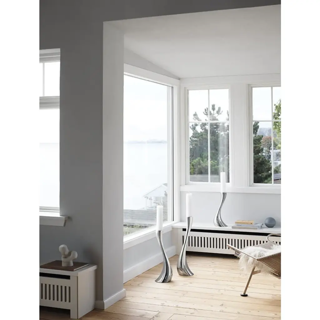 Georg Jensen's Cobra floor candleholder catches the eye with its height of 19.69 in (50 cm) and shine of mirror polished steel. The organic lines of the candleholders resemble melting wax – almost as if a classic candlestick had started to melt. Designed by Constantin Wortmann, Cobra collection is characterized by a swerving, dramatic appearance, and its strong curves create an impression of fast movement. Just like actual cobras, the members of the Cobra collection are imposing, striking and bold. With its mirror-polished steel surface and dynamic design, Cobra is a true design classic that adds a dramatic element to any interior.