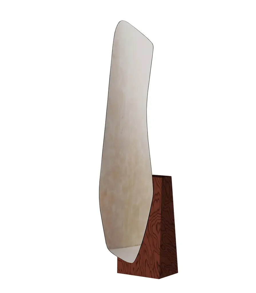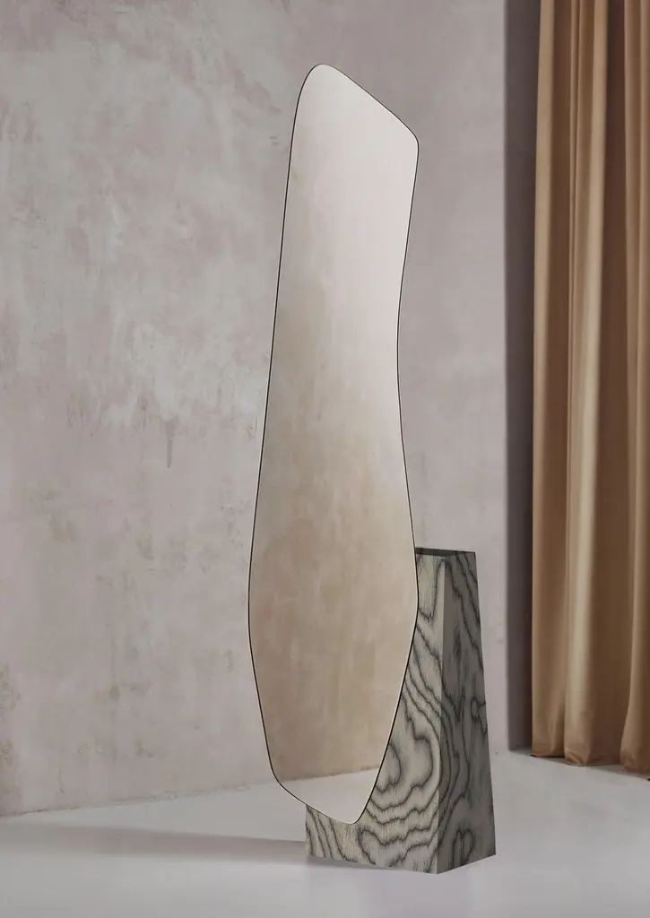 Brand: NOOMDesigners: Maryna Dague & Nathan BaranessDimensions (cm): H 170 cm, W 51 cm, D 20 cmType of Mirrors: Optiwhite, Black tint mirror, Copper tint mirrorMaterials for base: Veneered wood, Madrona wood veneer, Burned steel, Stainless steel / Hand brushed stainless steel, Brushed brass, Brushed copper, Oxidized copper, Black Marble Alanya, Travertino Chiaro Classic, White Marble Statuario, Green Marble Verde Ocean, Onyx."Lakes" is a nature-inspired collection of sculptural mirrors designed by French designers Maryna Dague and Nathan Baraness.The collection takes its name from the shorelines of lakes and aerial views of their sinuous shapes, represented in the design. The designers have emphasized the contrast between the fluid shapes of the glass and the straight lines of the mirrors' supports, made of slabs of wood, brass, oxidized copper, marble, onyx, and other attractive materials. The collection features five designs, including a floor mirror.
