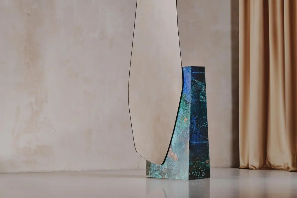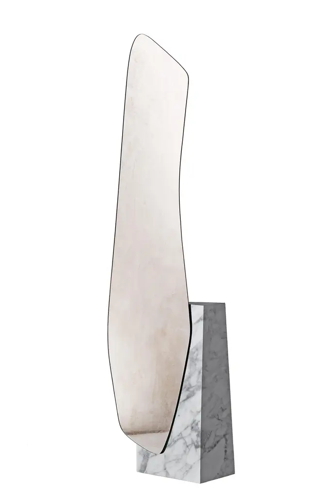 "Lakes" is a nature-inspired collection of sculptural mirrors designed by French designers Maryna Dague and Nathan Baraness.The collection takes its name from the shorelines of lakes and aerial views of their sinuous shapes, represented in the design. The designers have emphasized the contrast between the fluid shapes of the glass and the straight lines of the mirrors' supports, made of slabs of wood, brass, oxidized copper, marble, onyx, and other attractive materials.The collection features five designs, including a floor mirror.Brand: NOOMDesigners: Maryna Dague & Nathan BaranessType of Mirrors: Optiwhite, Black tint mirror, Copper tint mirrorMaterials for base: Veneered wood, Madrona wood veneer, Burned steel, Stainless steel / Hand brushed stainless steel, Brushed brass, Brushed copper, Oxidized copper, Black Marble Alanya, Travertino Chiaro Classic, White Marble Statuario, Green Marble Verde Ocean, Onyx.Note: The main picture of the listing displays Lake Mirror 5 with Black Marble Alanya Base and Optiwhite mirror.Dimensions (cm): H 170 cm, W 51 cm, D 20 cm.