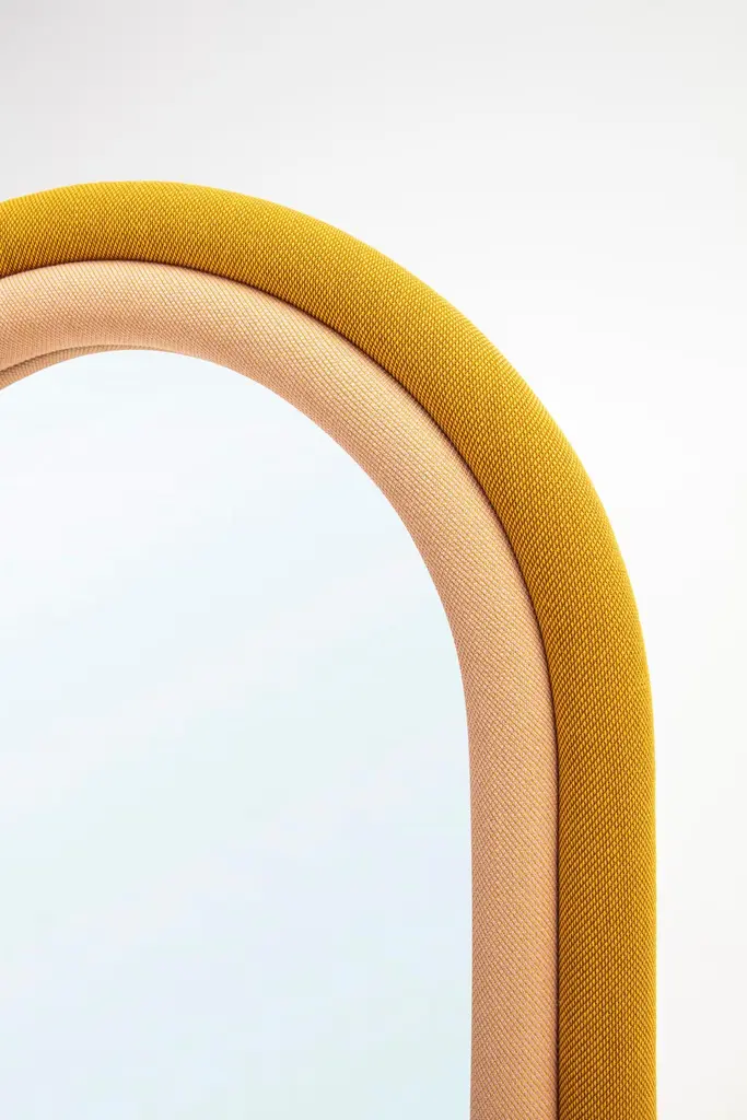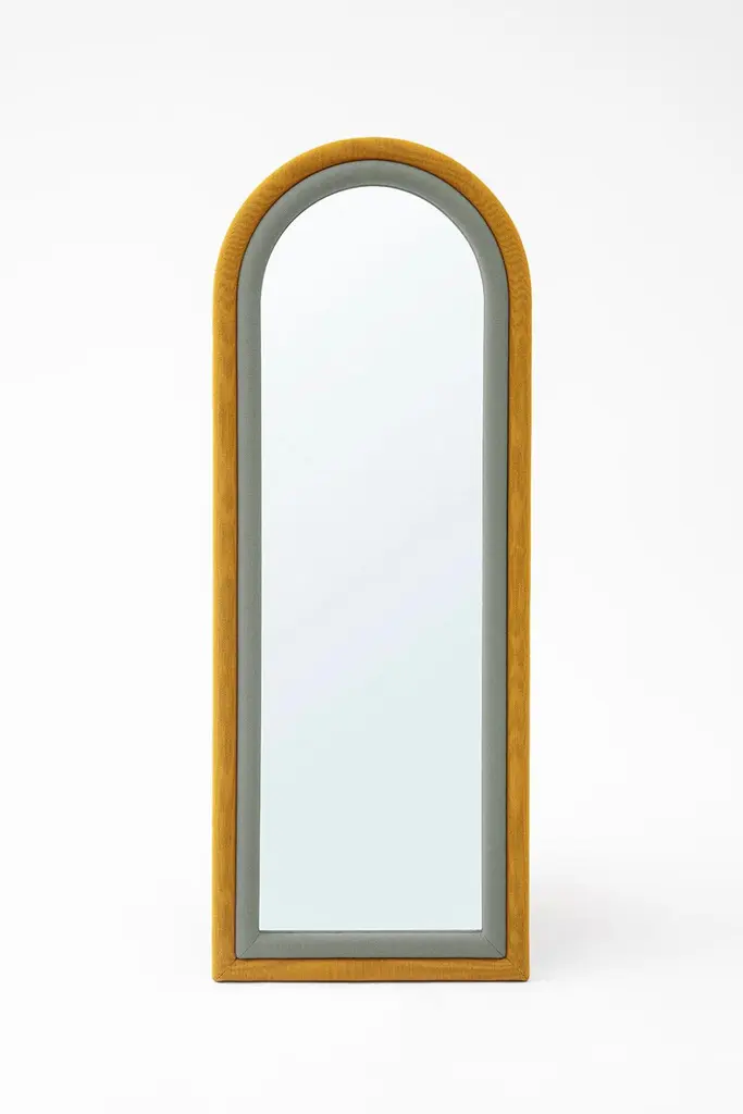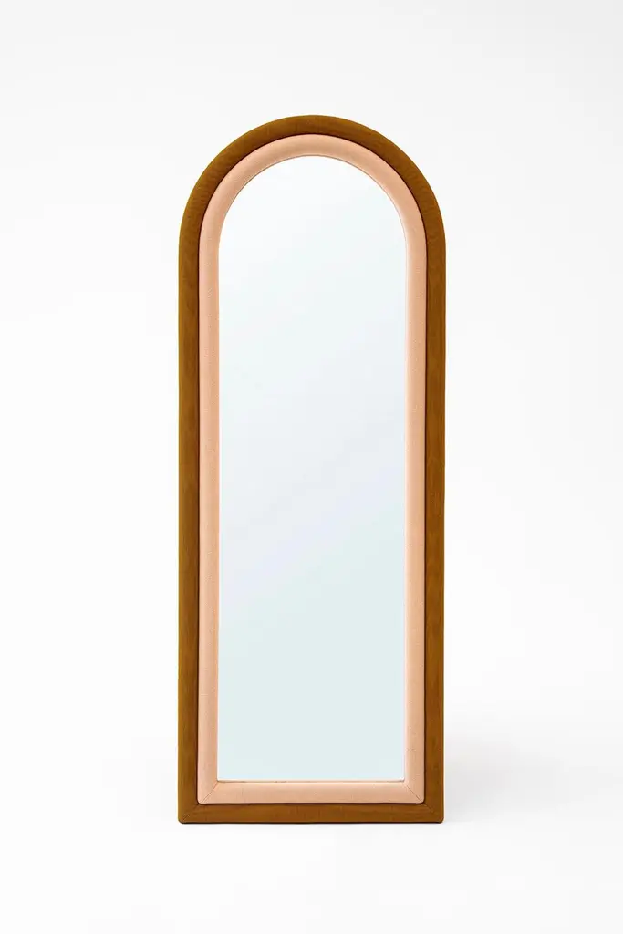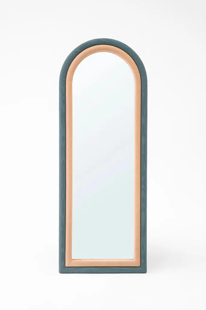 The floor version of the “Iris Mirror” has pink and mustard color upholstery wrapped around the arched shape. It can be hanged on the wall or stand by itself. It can be customized in fabrics and sizes as well.
