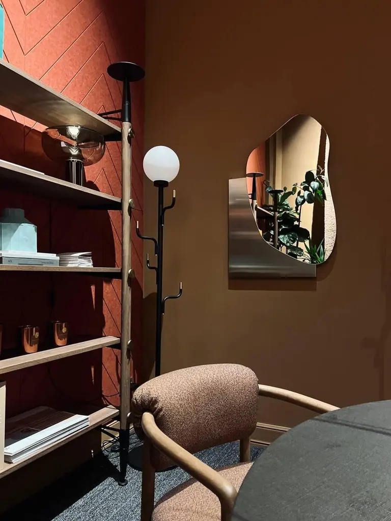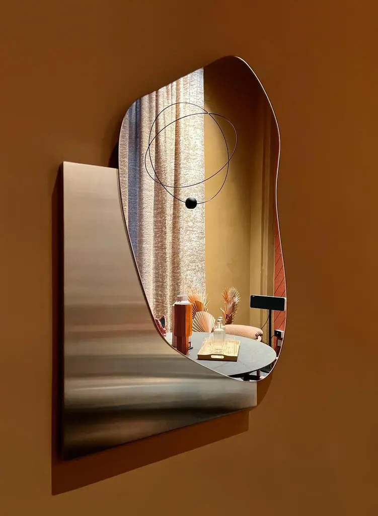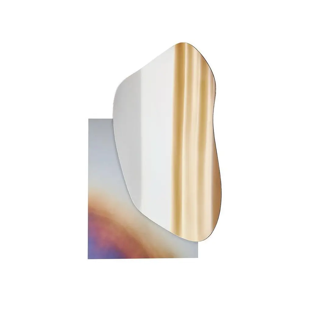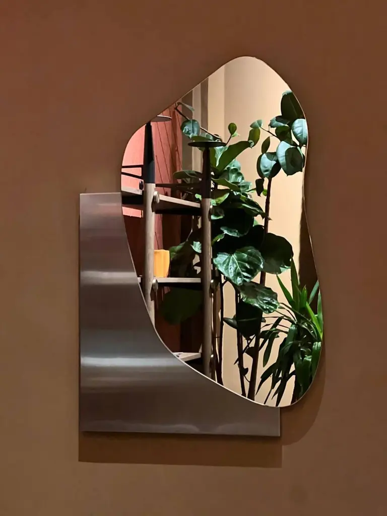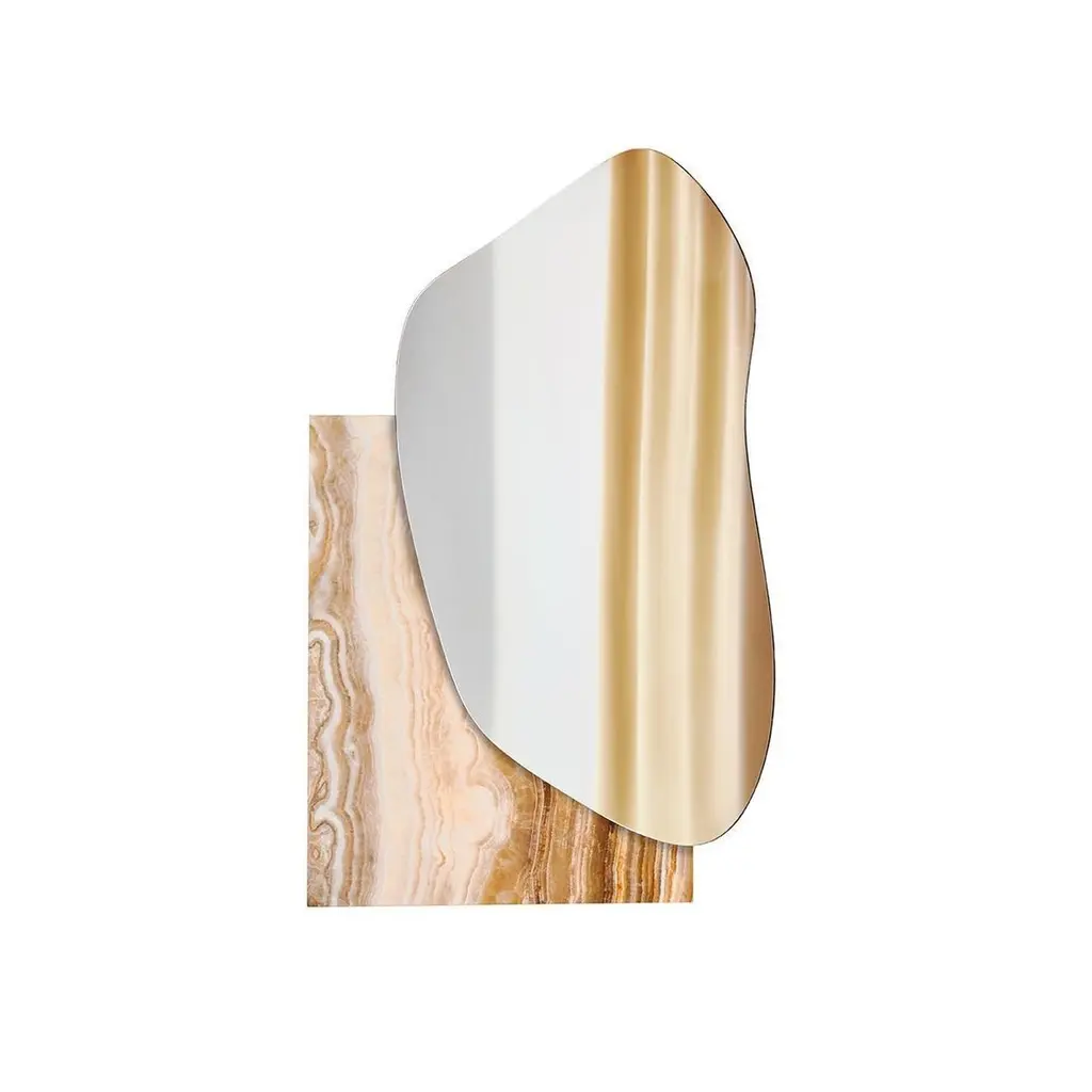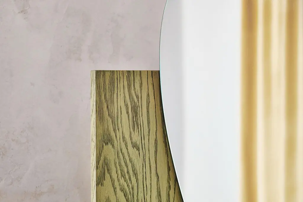 Brand: NOOMDesigners: Maryna Dague & Nathan Baraness.Type of Mirrors: Optiwhite, Black tint mirror, Copper tint mirror.Materials for base: Veneered wood, Madrona wood veneer, Burned steel, Stainless steel / Hand brushed stainless steel, Brushed brass, Brushed copper, Oxidized copper, Black Marble Alanya, Travertino Chiaro Classic, White Marble Statuario, Green Marble Verde Ocean, Onyx.Note: The main picture of the listing displays Lake Mirror 1 with Veneered wood base and Optiwhite mirror.Dimensions (cm): H 100 cm, W 67 cm, D 4 cm."Lakes" is a nature-inspired collection of sculptural mirrors designed by French designers Maryna Dague and Nathan Baraness. The collection takes its name from the shorelines of lakes and aerial views of their sinuous shapes, represented in the design. The designers have emphasized the contrast between the fluid shapes of the glass and the straight lines of the mirrors' supports, made of slabs of wood, brass, oxidized copper, marble, onyx, and other attractive materials. The collection features five designs, including a floor mirror.
