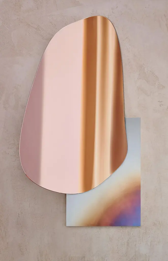 Modern Lake Wall Mirror by NoomDesigners: Maryna Dague & Nathan BaranessModel shown in picture:Number 3Base in burned steel and copper tint mirror"Lakes" is a nature-inspired collection of sculptural mirrors designed by French designers Maryna Dague and Nathan Baraness.The collection takes its name from the shorelines of lakes and aerial views of their sinuous shapes, represented in the design. The designers have emphasized the contrast between the fluid shapes of the glass and the straight lines of the mirrors' supports, made of slabs of wood, brass, oxidized copper, marble, onyx, and other attractive materials.The collection features five designs, including a floor mirror. Noom is a young, fast-growing design company from Ukraine that produces furniture, lighting, decor, and home accessories. They create sculptural and eye-catching design pieces that elevate any space, whether it is residential or commercial interior. Balancing between expression and function, NOOM is a place where design meets art. Combining traditional and modern manufacturing technologies, Noom aims to design functional and striking products that are "built to last". "Our objects lie between design, art, and craftsmanship," said the designers.