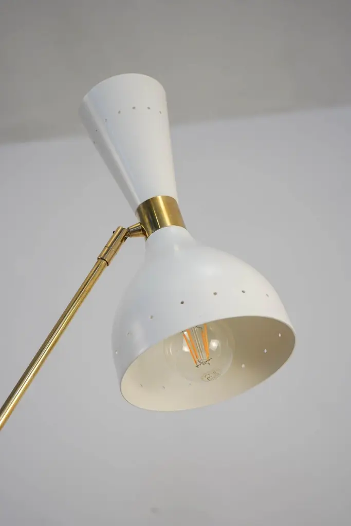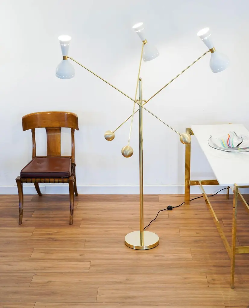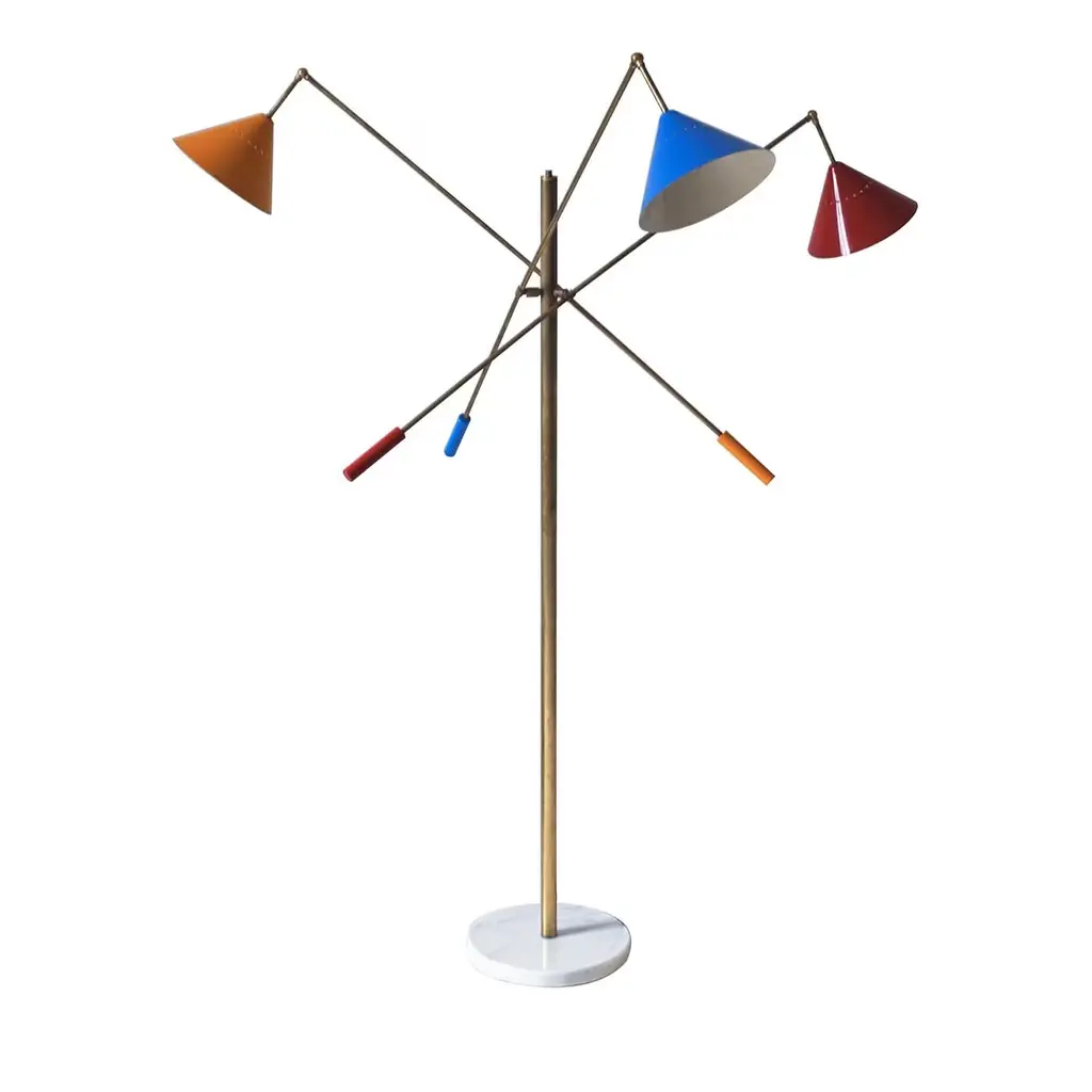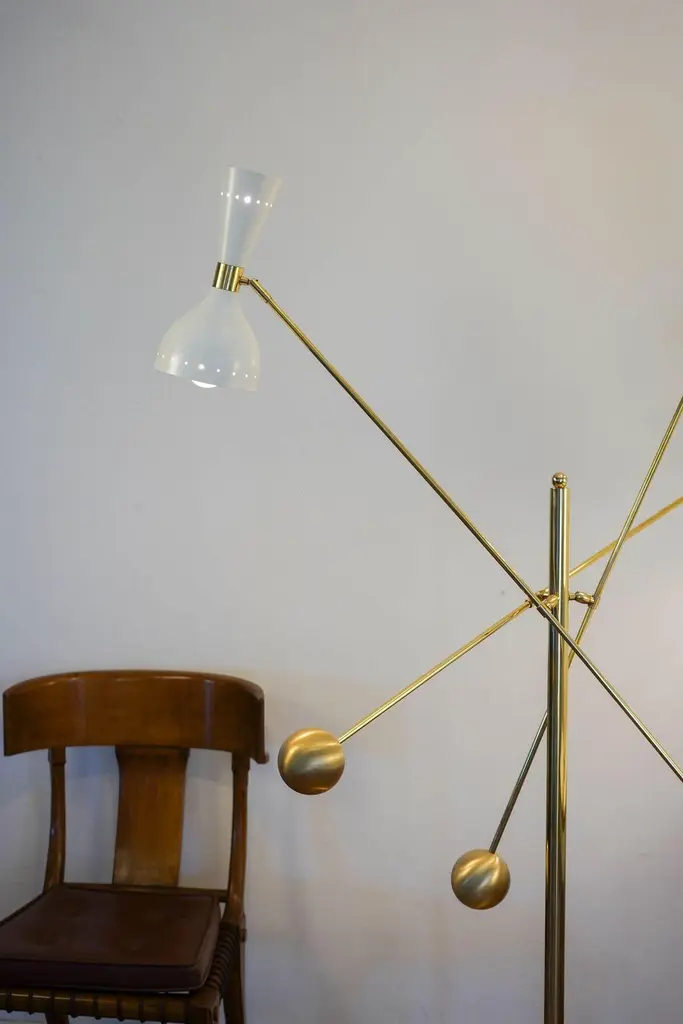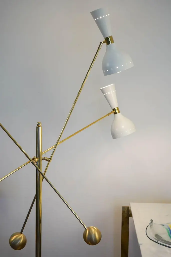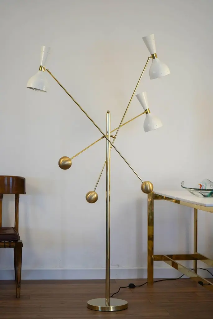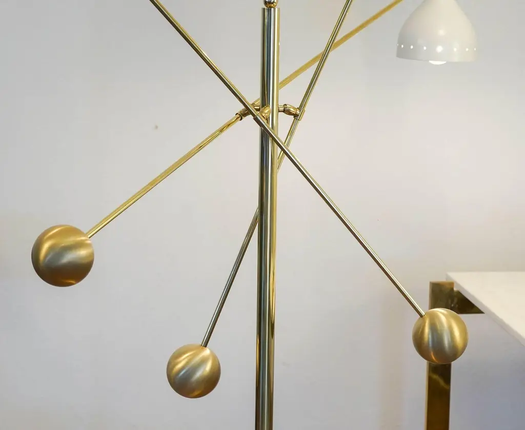 Elegant re-interpretation of the midcentury iconic three-arm floor lamp called Triennale.It carries the Giano twin shades, with a total of 6 lights. The downlight are for task light output while the uplight are creating an ambiance light.Solid brass spheres counterweight are balancing the movement of the arms.Everything is done with a passion for details and materials.Arms and body: Made in natural solid brass Each arm has brass cast brass counter-weight that is calibrated with sand to be in perfect balance.This floor lamp is current production made to order. Please write me for any special size requirement and color choices. RAL color for shades.Bulb requirement3xE26 (US) E27 (EU) base A15 or G16.5. Recommended half mirrored bulbs.3xE12 (US) E14 (EU) base B or G16.5
