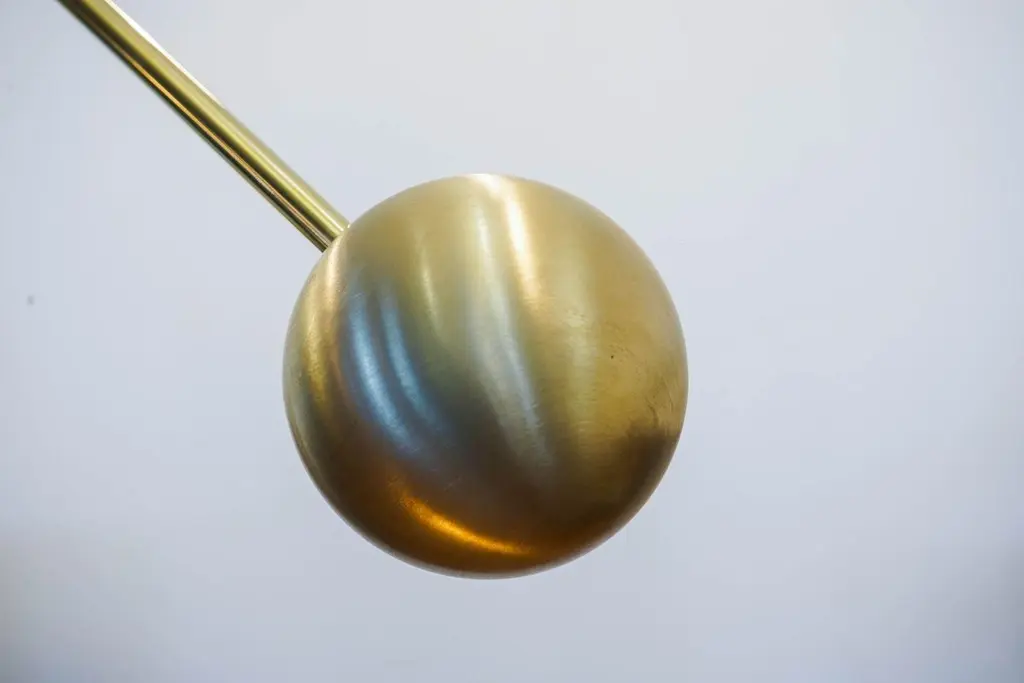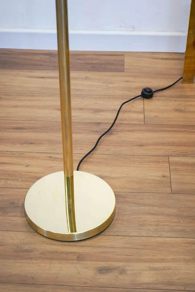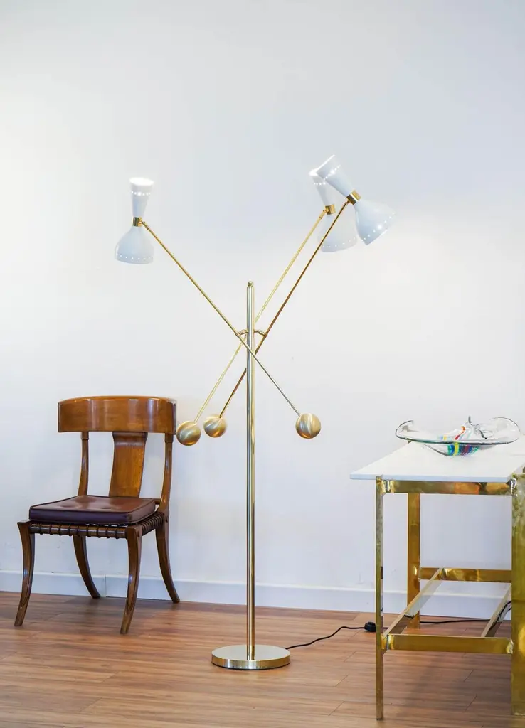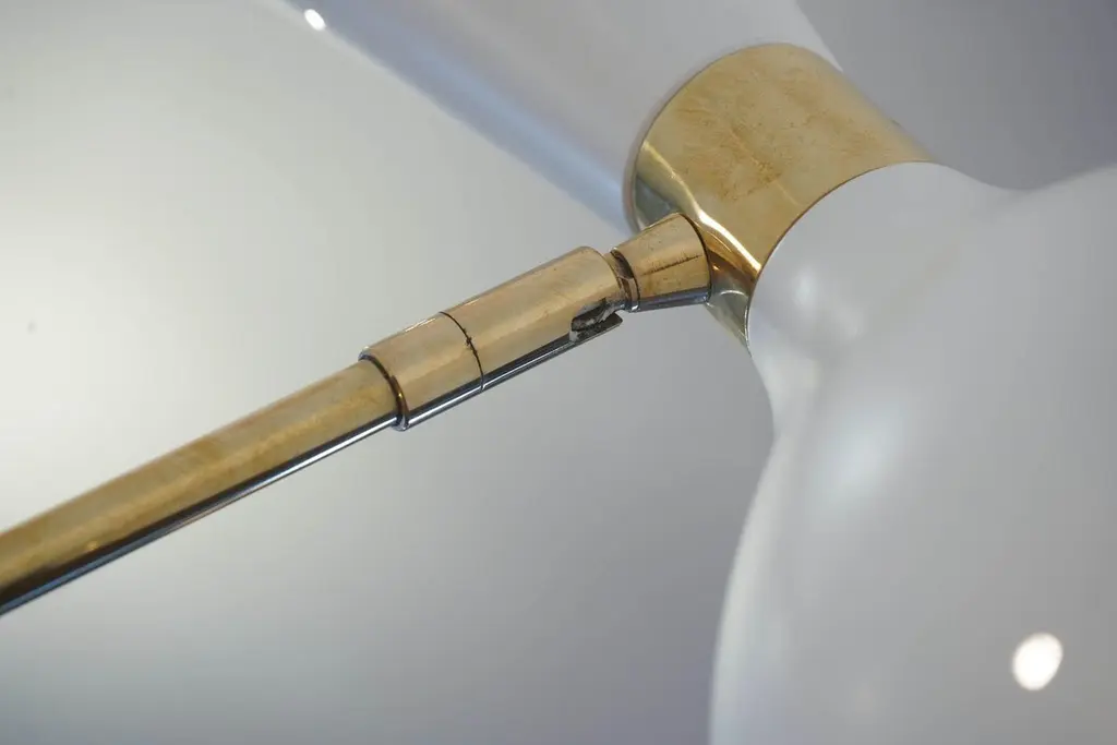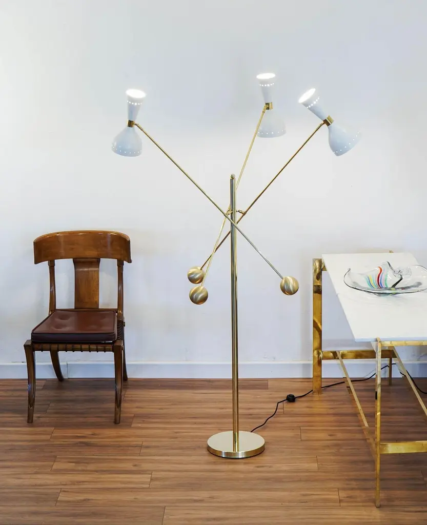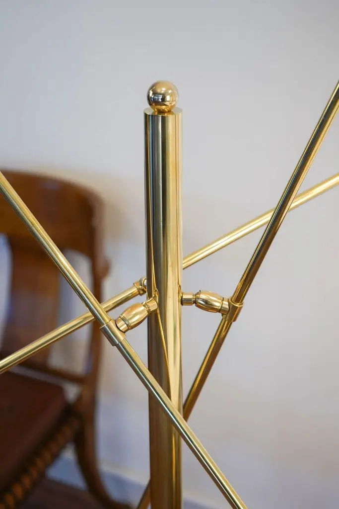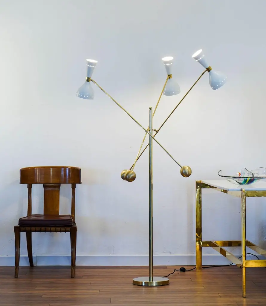 Elegant re-interpretation of the midcentury iconic three-arm floor lamp called Triennale.It carries the Giano twin shades, with a total of 6 lights. The downlight are for task light output while the uplight are creating an ambiance light.Solid brass spheres counterweight are balancing the movement of the arms.Everything is done with a passion for details and materials.Arms and body: Made in natural solid brass Each arm has brass cast brass counter-weight that is calibrated with sand to be in perfect balance.This floor lamp is current production made to order. Please write me for any special size requirement and color choices. RAL color for shades.Bulb requirement3xE26 (US) E27 (EU) base A15 or G16.5. Recommended half mirrored bulbs.3xE12 (US) E14 (EU) base B or G16.5