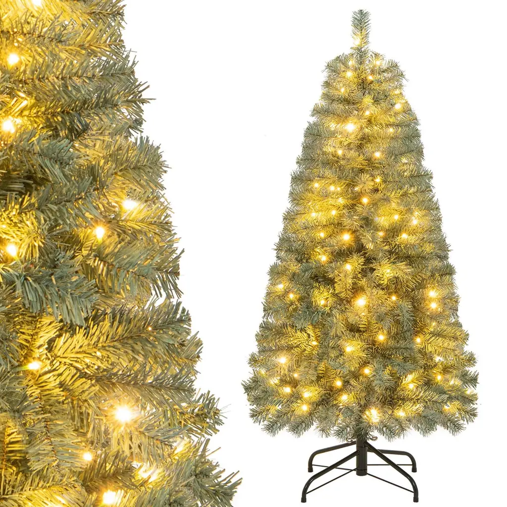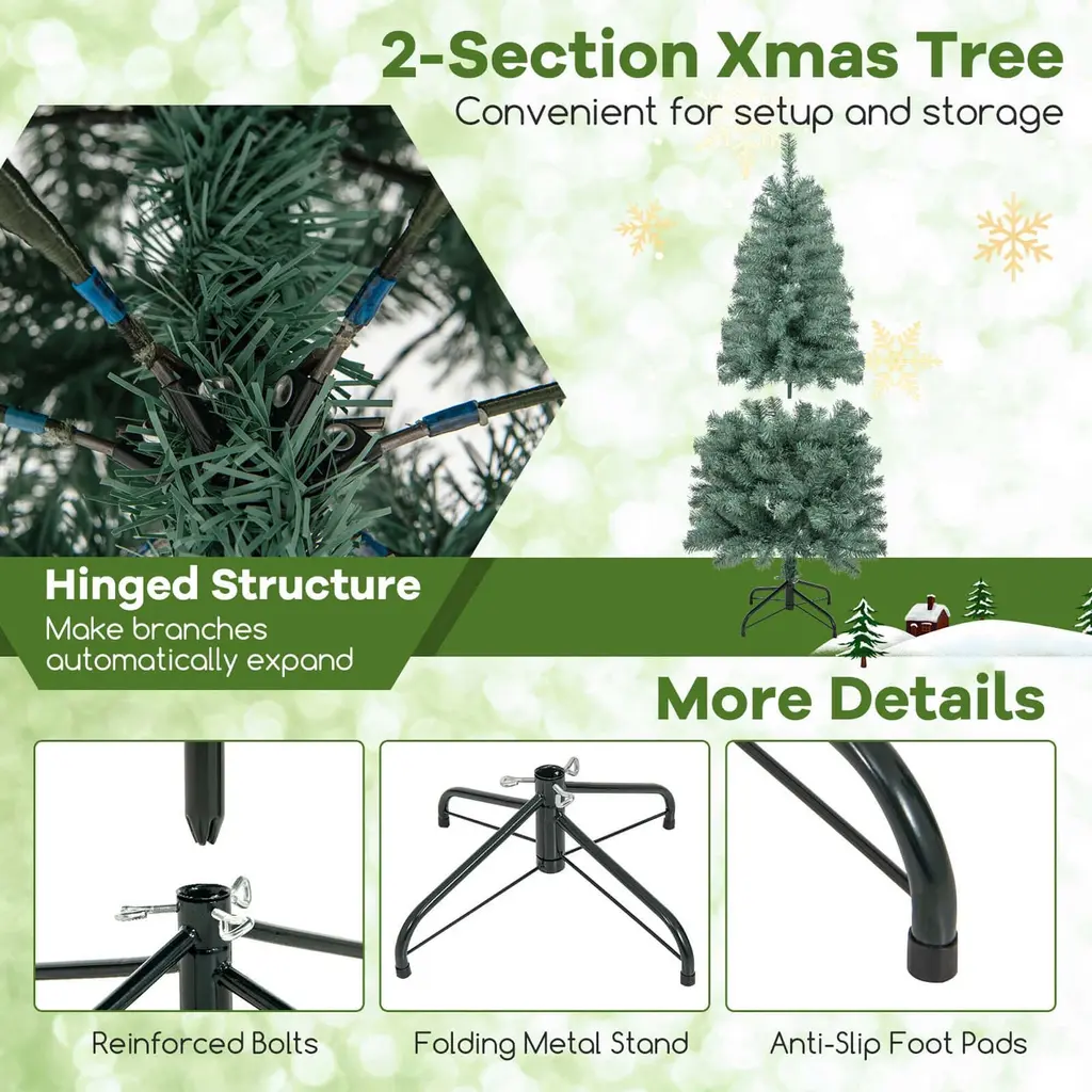 Experience the festive magic with the 4.5/6.5/7.5/9 ft Xmas tree that mirrors the beauty of a blue spruce. The Christmas tree features 256/556/724/1168 branch tips and is made of smell-free PVC. The distinct blue-gray color attracts your guests. Illuminate your space with 100/200/250/500 LED lights that can switch between warm white and colorful tones, offering 9 lighting modes, including C1 steady on, C2 steady on, C1 fade, C2 fade, change slow, C1 flash, C2 flash, change flash, and change twinkle. The 2/3/3/4-section Xmas tree is easy to set up, thanks to the hinged design and folding metal stand, complete with a pair of gloves for safety. The slim pencil shape of the decoration tree is ideal for your home, office, shop, school, and more. More details await your discovery. Merry Christmas!FeatureInspired by the real spruce tree, it is perfect for decorations in tight spaces Features 256/556/724/1168 branch tips that present a special blue tint 100% new PVC material ensures optimal durability and using safety 100/200/250/500 LED lights provide 2 color options, including warm white and colorful Light controller makes it easy to change the lighting modes Has a hinged structure to make branches automatically expand Convenient for setup and storage, thanks to the 3-section structure Folding metal stand with reinforced bolts offers reliable support Comes with anti-slip foot pads that protect the floor from being scratched Promotes the using safety with the UL-certificated adaptor Please note that ornaments are not includedSpecificationColor: Blue Material: PVC, Metal Tree Height: 4.5/6.5/7.5/9 ft Tree Width: 2.1/2.5/2.6/3 ft Diameter of Stand:16"/20"/21"/25.5" Number of Branch Tips: 256/556/724/1168 Number of LED Lights: 100/200/250/500 Number of Sections: 2/3/3/4 Net Weight: 6.5/12.5/15.5/26.5 lbs Package Includes: 1 x Christmas Tree 1 x Pair of Gloves 1 x User Guide