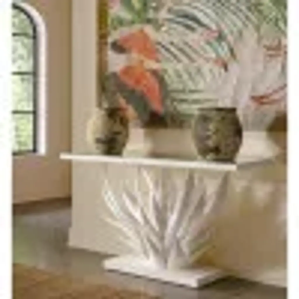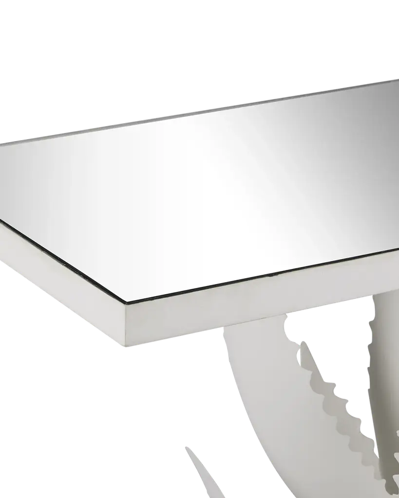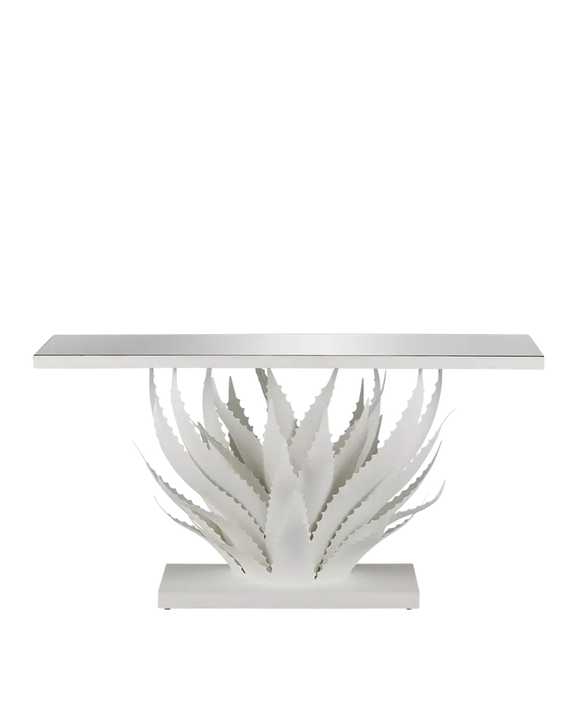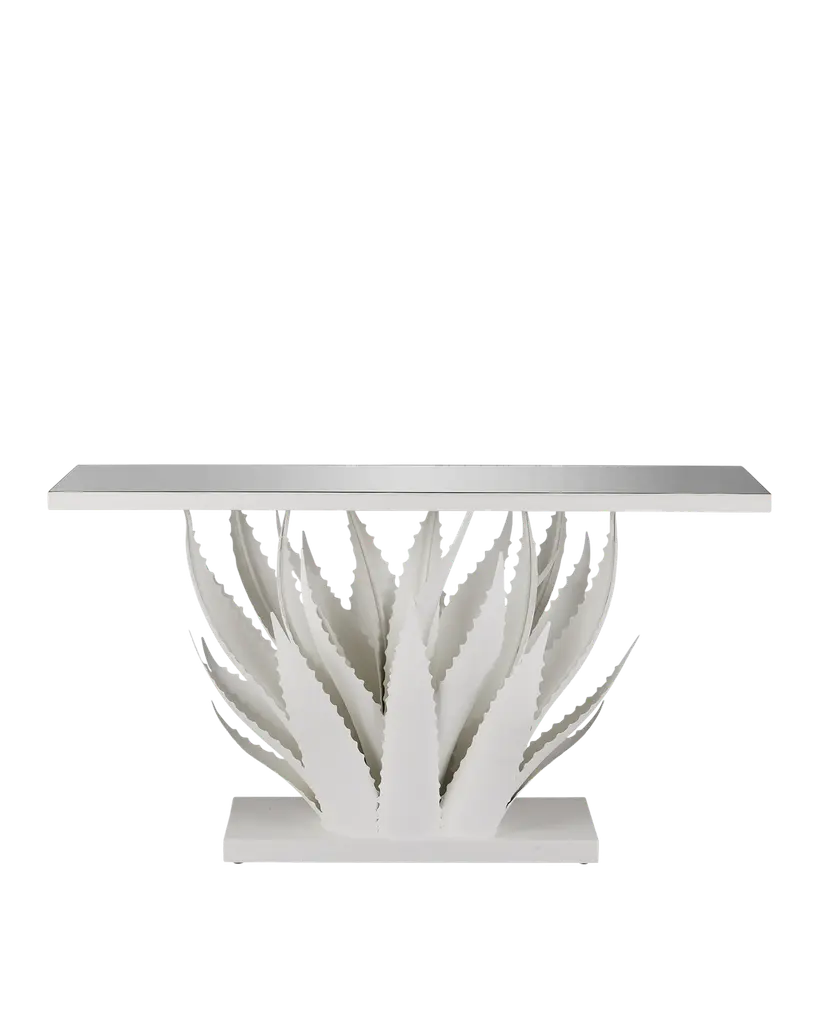 The Agave White Console Table was inspired by the flourishing plant of the same name, whose spiky, leathery fronds curl up from the ground just as the oversized leaves on this white console table do. “My love of the Agave plant, of which hundreds of varieties flourish in the Yucatan, has inspired me for many years,” says the table’s designer Marjorie Skouras. Her passion for the Yucatan peninsula, the surroundings in which she lives and through which she translates the flora and fauna into dynamic products in her studio, shines in this wrought iron table covered in a crisp gesso white finish with a mirrored top. Wipe clean with a soft, dry cloth or static duster. Always avoid the use of harsh chemicals or abrasive cleaners as they may cause damage to the item's finish. Due to the use of natural materials, handmade craftsmanship, or hand finishing, expect some color variances. Hand crafted pieces may have slight size differences.