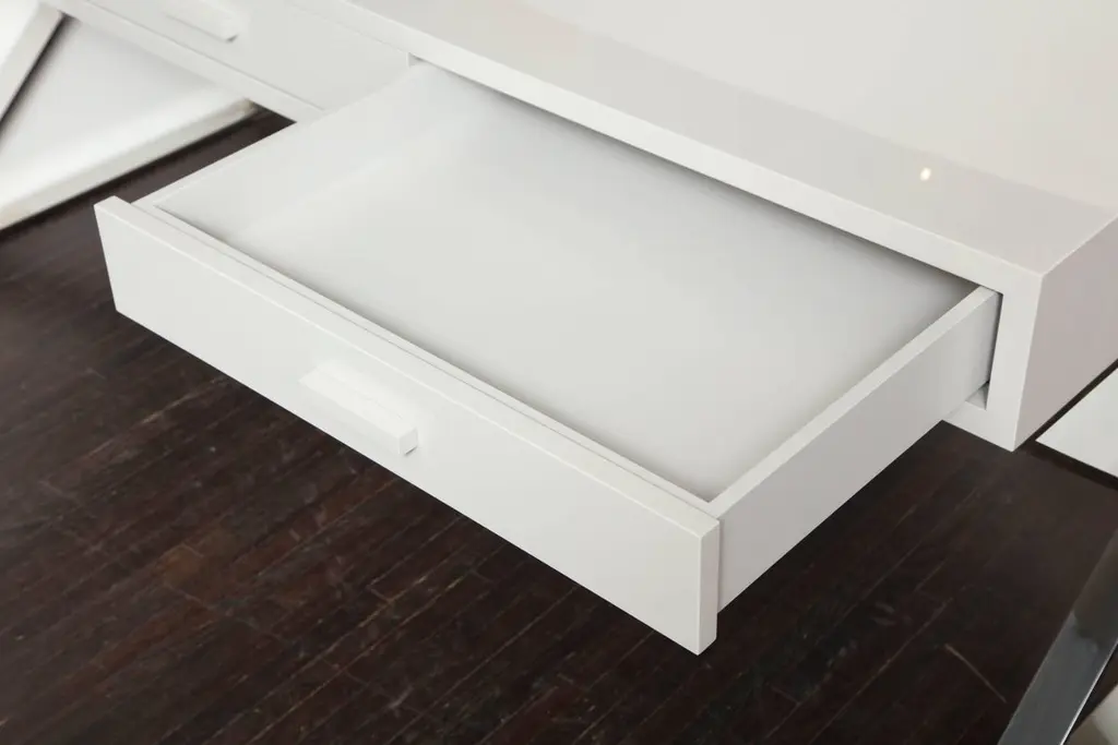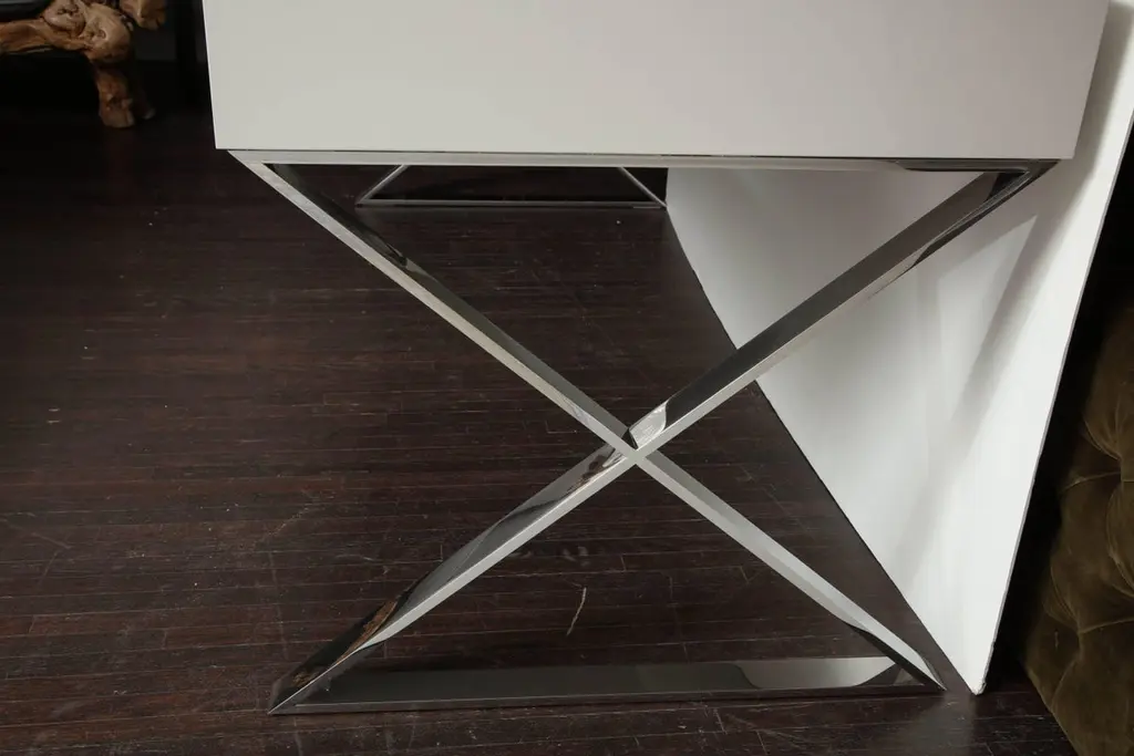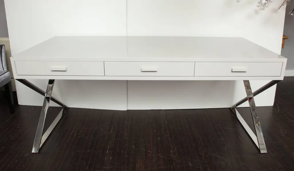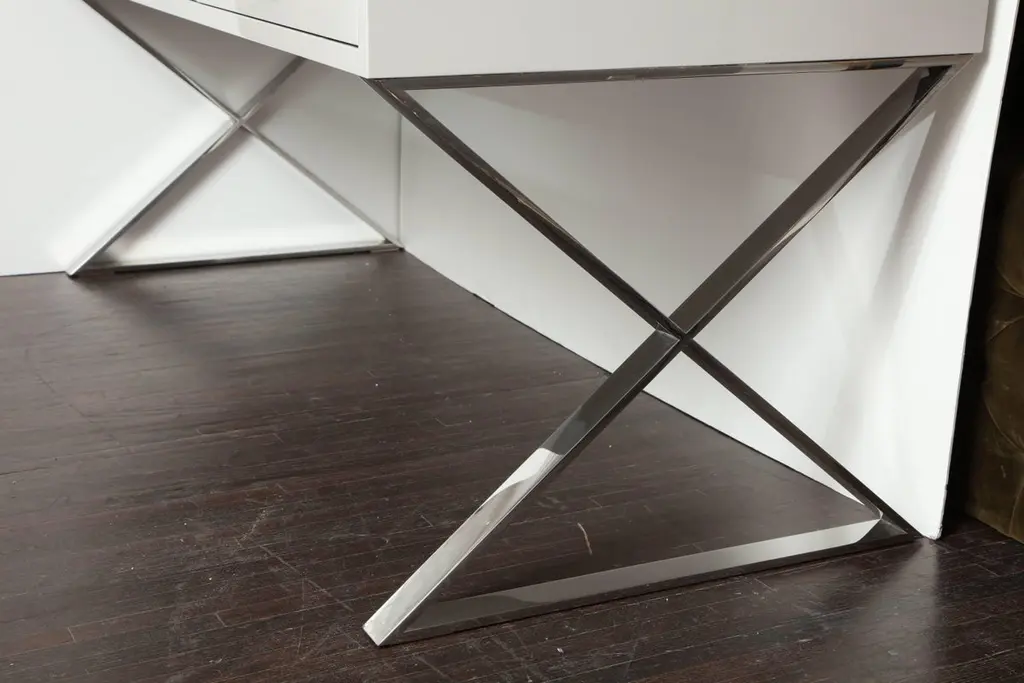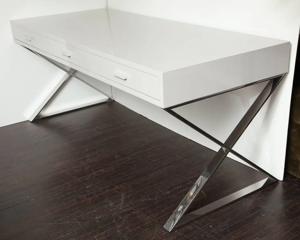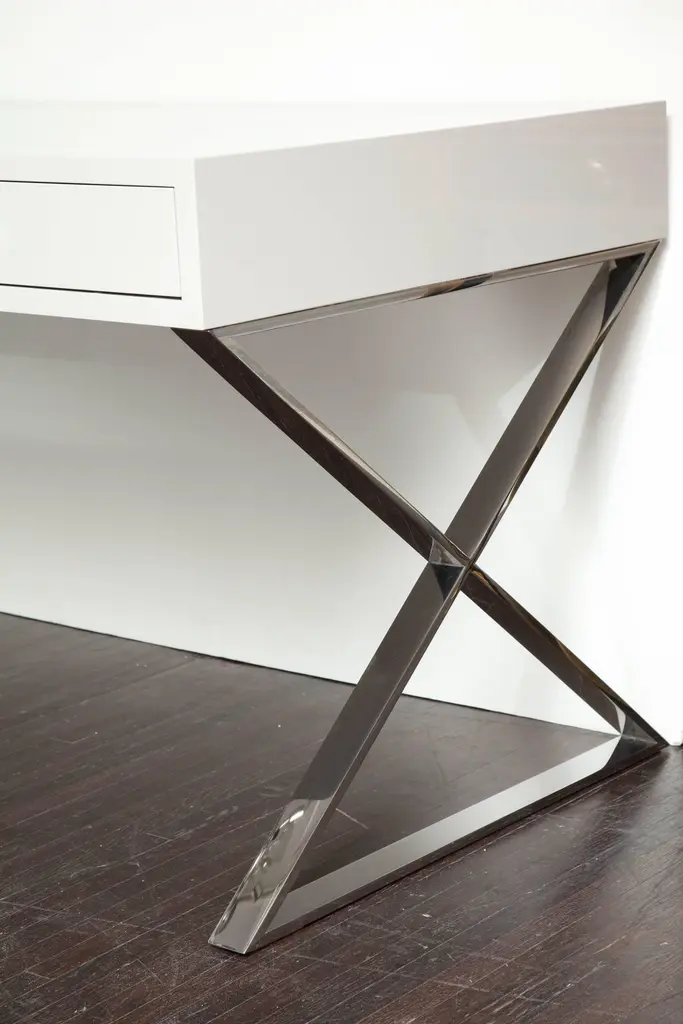 Custom oversized high gloss lacquer desk with mirrored stainless steel X band legs. Customization is available in different sizes, finishes and colors.