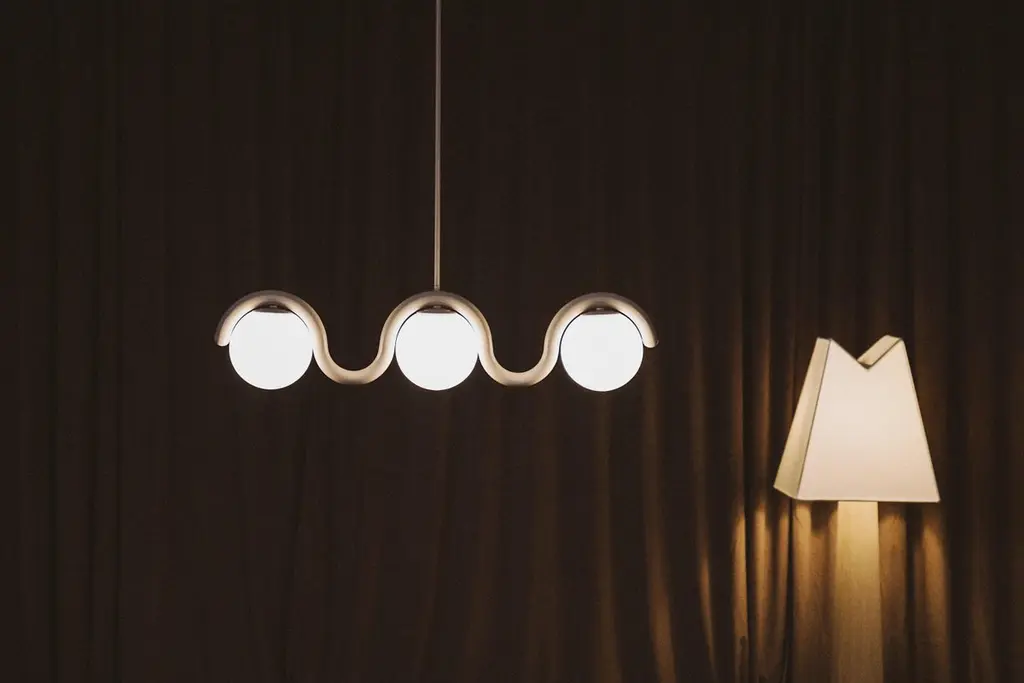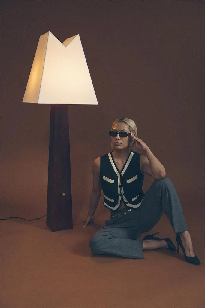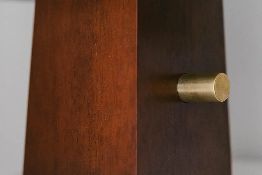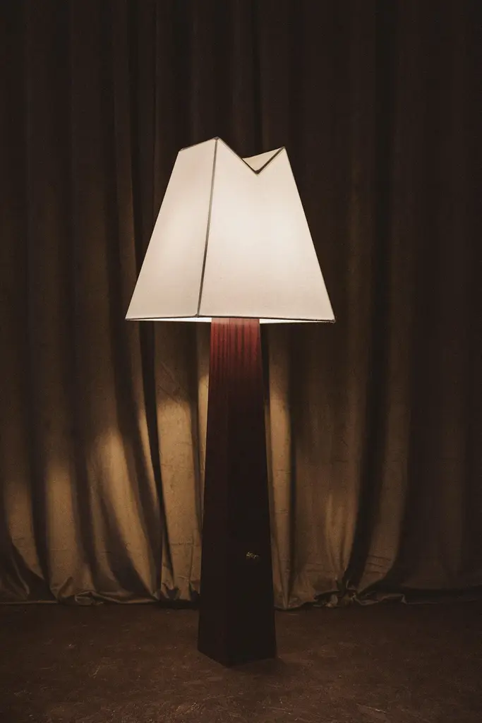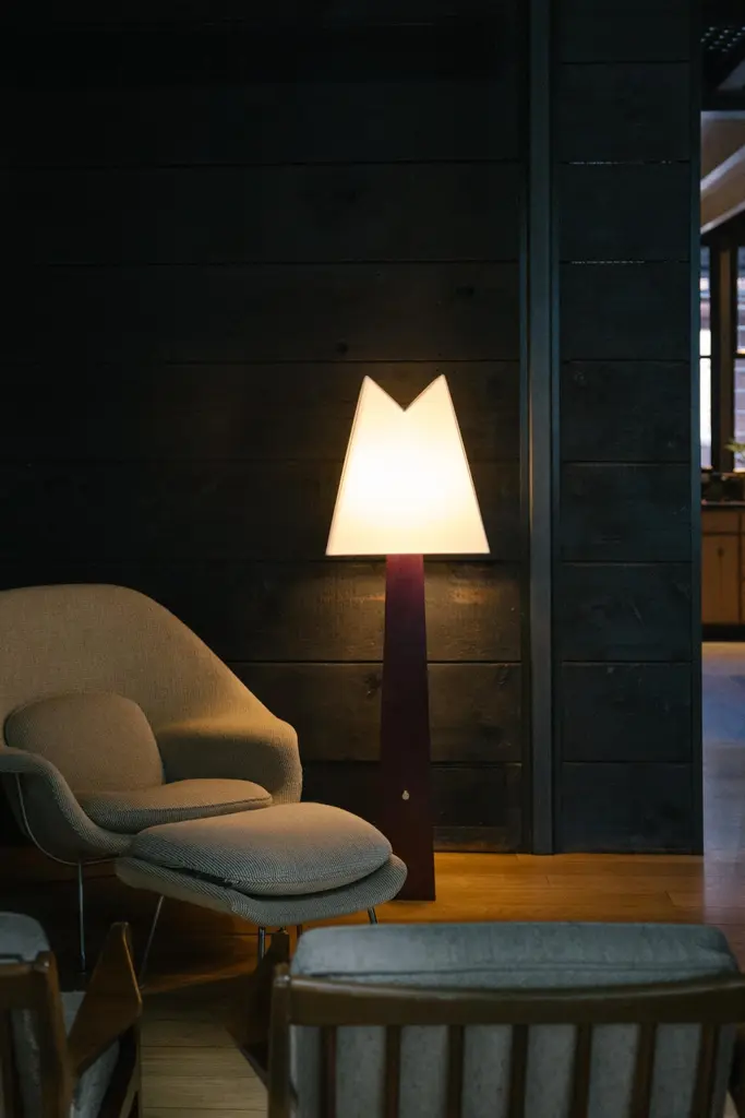 Born of nostalgia, the Alpine Lamp echoes natural forms and mountainous contours. The natural wooden base grounds the piece in earthy materials, evoking the altitude of Utah forests; the “V” of the lampshade mirrors the notch in Lone Peak, a mountain that the town of Alpine, Utah sits beneath. The Alpine Floor Lamp can be dimmed with a brass knob, allowing for a customizable lighting experience. The shade is held in place by a magnetic connection on the base of the lamp, making its removal easy. The top of the lampshade is enclosed, creating a warm, even diffusion of light. The wooden base can easily be customized in wood species, lacquer color and finish, and sized to fit your project's styling needs. Made to order at the highest level or craft and care in Brooklyn, NY. Astraeus Clarke was founded by partners Chelsie and Jacob Starley and launched in 2022. Their unique skills and vision brought them from out West in their home state of Utah to New York City to start their own creative studio. All Astraeus Clarke pieces are handmade in Brooklyn, NY.