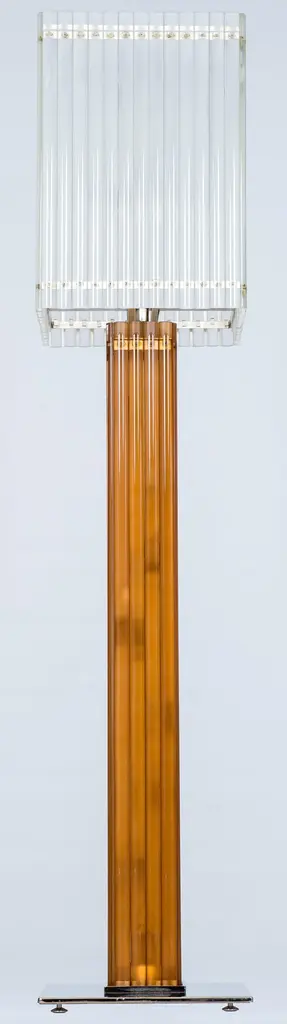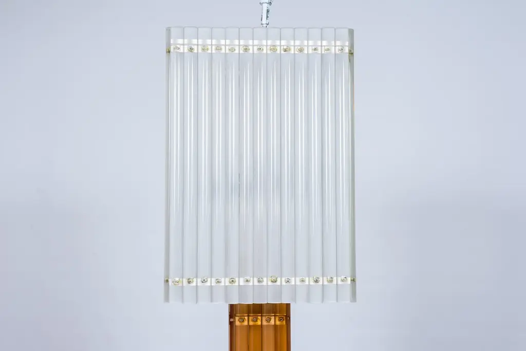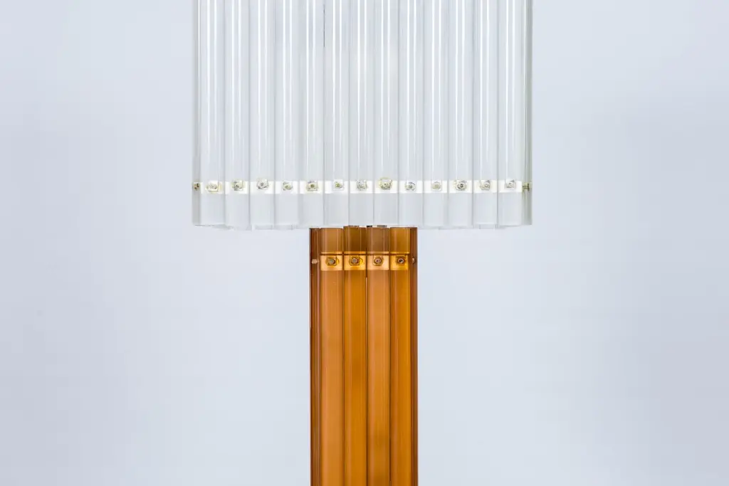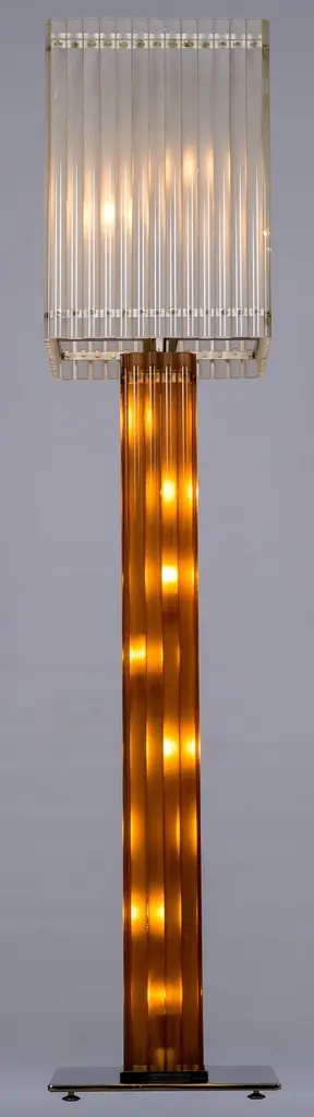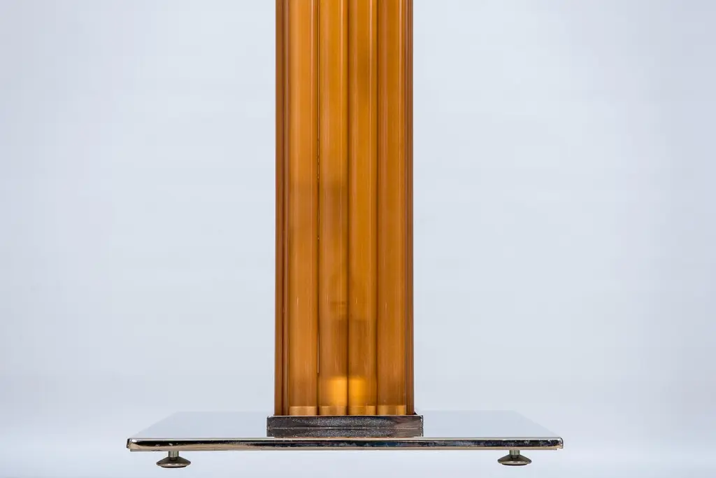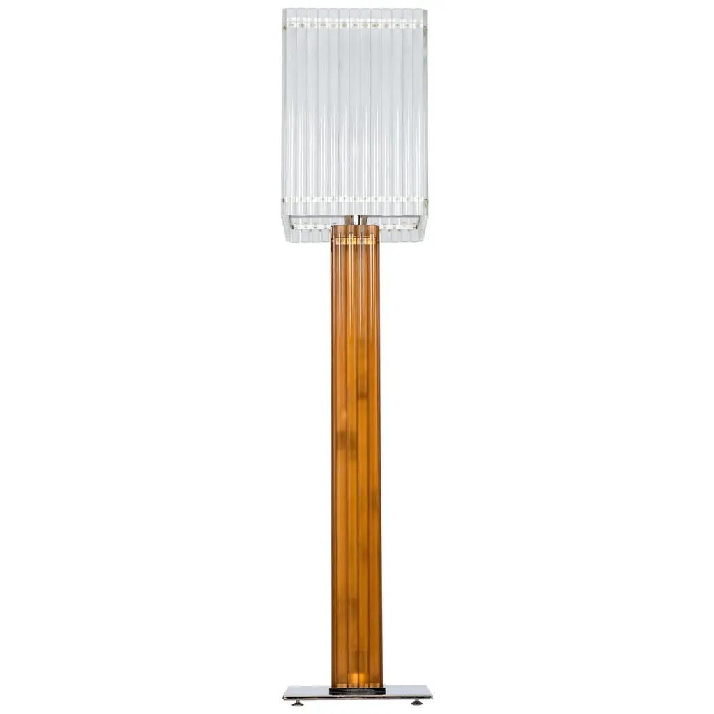 Pair of Murano glass deco floor lamp in transparent and amber color Modern Italy.This is a pair of Murano glass deco floor lamp in sandblasted transparent and sandblasted amber color, Italy.This astonishing pair of Murano glass floor lamp is made of two larger geometrical elements in two different colors and proportions. The two elements enact an enchanting interplay of colors and shapes when the light is switched on.A square mirror surface holds a 51-inch column made of 16 semi-circular amber glass rods. This column sustains a larger cuboid shape made of 52 semi-circular sandblasted glass rods. The amber column contains 7 lights, while other 6 lights are placed on the upper part, inside the sandblasted “head”. Chrome frame inside the lamp.The pair is in excellent condition as documented in the attached pictures. This work of art can be customized upon request, according to your needs and desires. Customization is available for color, shape, size and materials.Price is intended to be for the pair, the two floor lamps, if the customization is consistently varying price might vary accordingly. This is a turnkey lamp: the cost of the professional rewiring (based on your country’s specifications) is our courtesy.