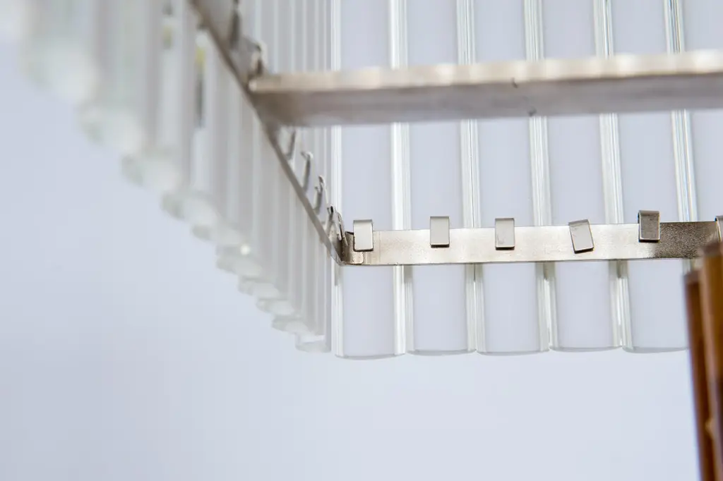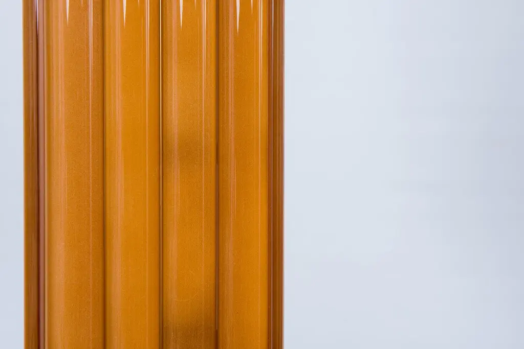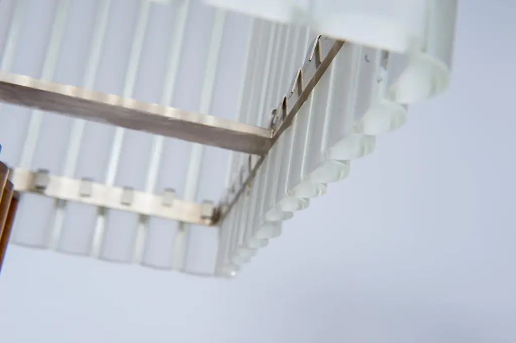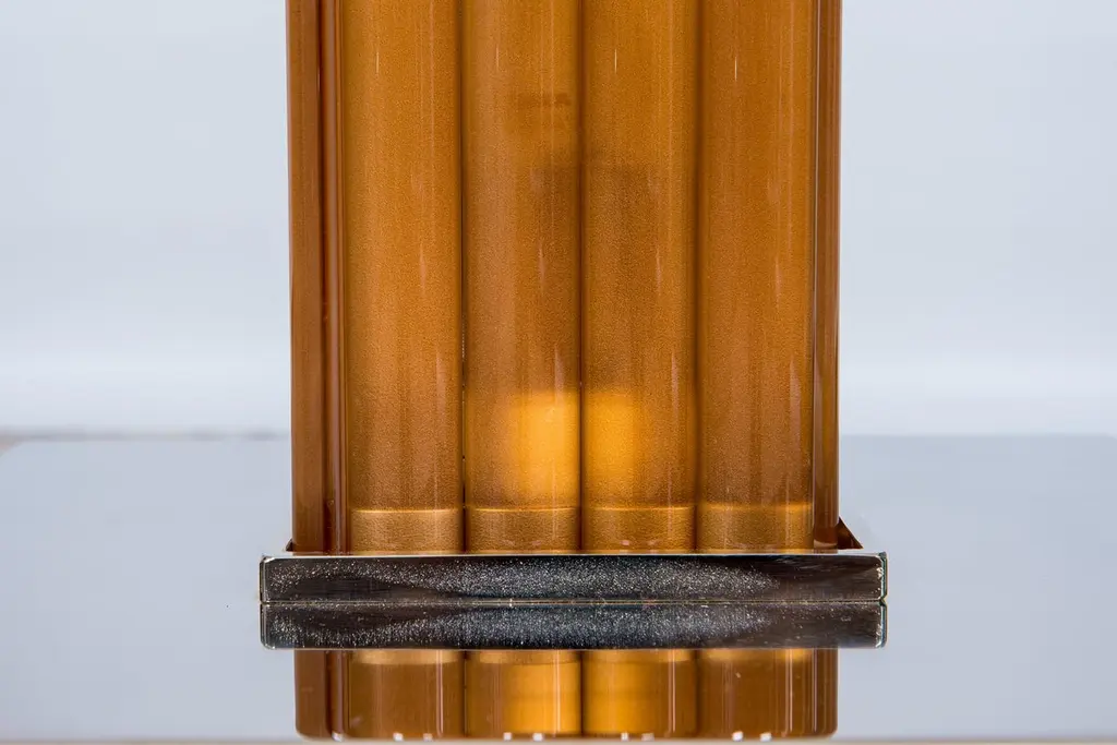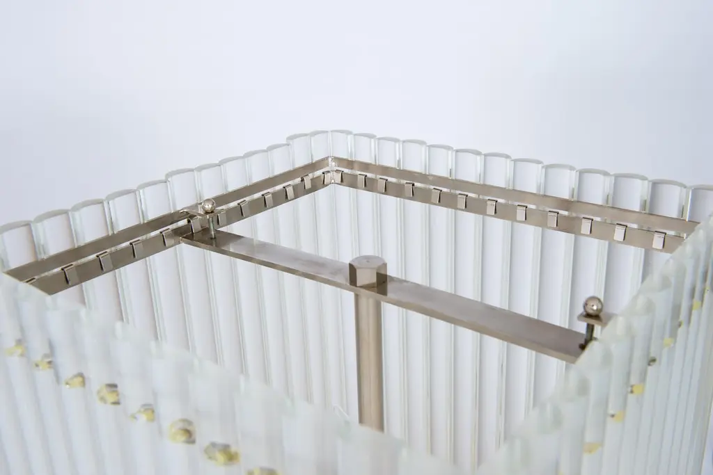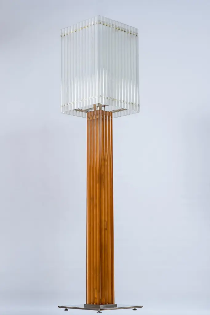 Pair of Murano glass deco floor lamp in transparent and amber color Modern Italy.This is a pair of Murano glass deco floor lamp in sandblasted transparent and sandblasted amber color, Italy.This astonishing pair of Murano glass floor lamp is made of two larger geometrical elements in two different colors and proportions. The two elements enact an enchanting interplay of colors and shapes when the light is switched on.A square mirror surface holds a 51-inch column made of 16 semi-circular amber glass rods. This column sustains a larger cuboid shape made of 52 semi-circular sandblasted glass rods. The amber column contains 7 lights, while other 6 lights are placed on the upper part, inside the sandblasted “head”. Chrome frame inside the lamp.The pair is in excellent condition as documented in the attached pictures. This work of art can be customized upon request, according to your needs and desires. Customization is available for color, shape, size and materials.Price is intended to be for the pair, the two floor lamps, if the customization is consistently varying price might vary accordingly. This is a turnkey lamp: the cost of the professional rewiring (based on your country’s specifications) is our courtesy.