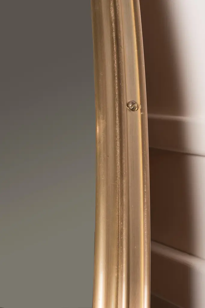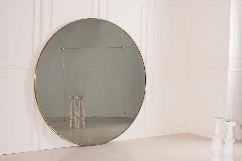 Pescetta presents its collection of contemporary customizable mirrors. With brass frame, window pane look and brass studs these mirrors replicate the idea of early 20th century Art Deco style mirrors. They suit both modern spaces which need a touch of elegance and very classical rooms which needs a wall decoration. They can be hanged in both directions or kept on the floor as floor mirrors. Each mirror is a unique handmade piece, characterized by Italian quality and taste.Lead time 20 business days.Worldwide shipment within 2 weeks.Price here refers to a mirror with following characteristics:Frame size and shape: diameter 180 cm - 70"Brass frame: double profileBrass finishing: aged effectMirror panels: window look with studsMirror: classicAccessories: rounded studsFeel free to design your own mirror! Many details are customizable:FRAME Frame size and shape: squared, rectangular, oval, rounded, hexagonal, octagonal.Brass frame: simple profile or double profile.Brass finishing: shiny or aged effect (little bit darker)Mirror panels: unique glass panel or window look ( with studs or profiles)Mirror: classic, aged effect, beveled, smoked or bronze.Accessories: studs, hangers (to transform the mirror into a coat rack), lights.MIRRORSa) Classic: normal silver color mirror. b) Smoked: Smoke grey (cold effect) distortion of reflected colors. c) Bronze: Bronze (warm effect) distortion of reflected colors. d) Black and white: Classic silver base and several small spots. Most used one, light distressed effect, clear vision, no distortion of reflected colors. e) Black and white / Bronze: bronze base and several small spots. Warm bronze dis-tortion of reflected colors. f) Silver: strong distressed look, silver base with large spots as per mirrors from 18th century. Blurred vision in the complex. g) Saturn: medium distressed look, silver base and several large light spots. Reflected colors are darker in complex. h) Antique Venetian: several light spread big spots which gently turn reflected colors into powder pink tone. Low distressed look.