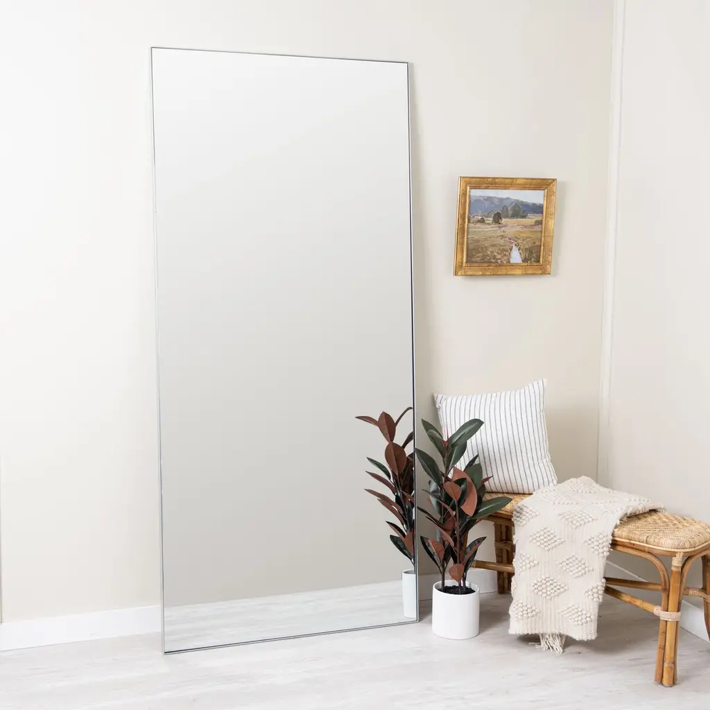 With its slender frame, this floor mirror is sophisticated in its simplicity, while its size—six-and-a-half feet by three feet—ensures it makes a strong statement. Can be hung horizontally or vertically.