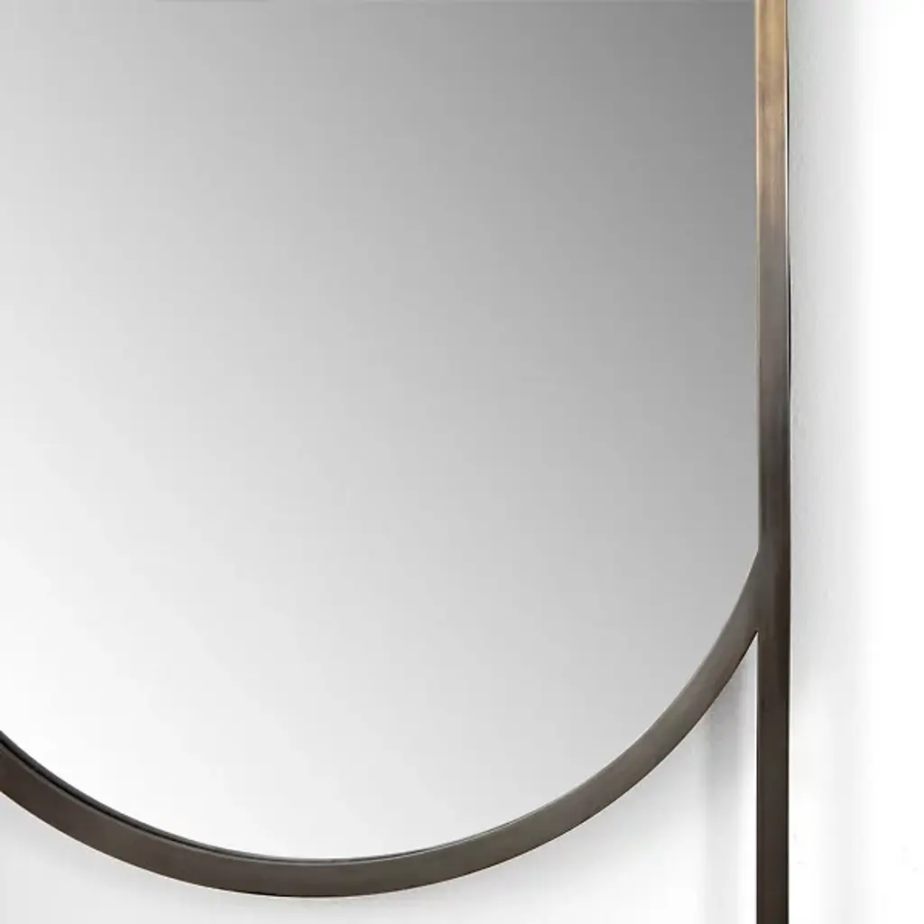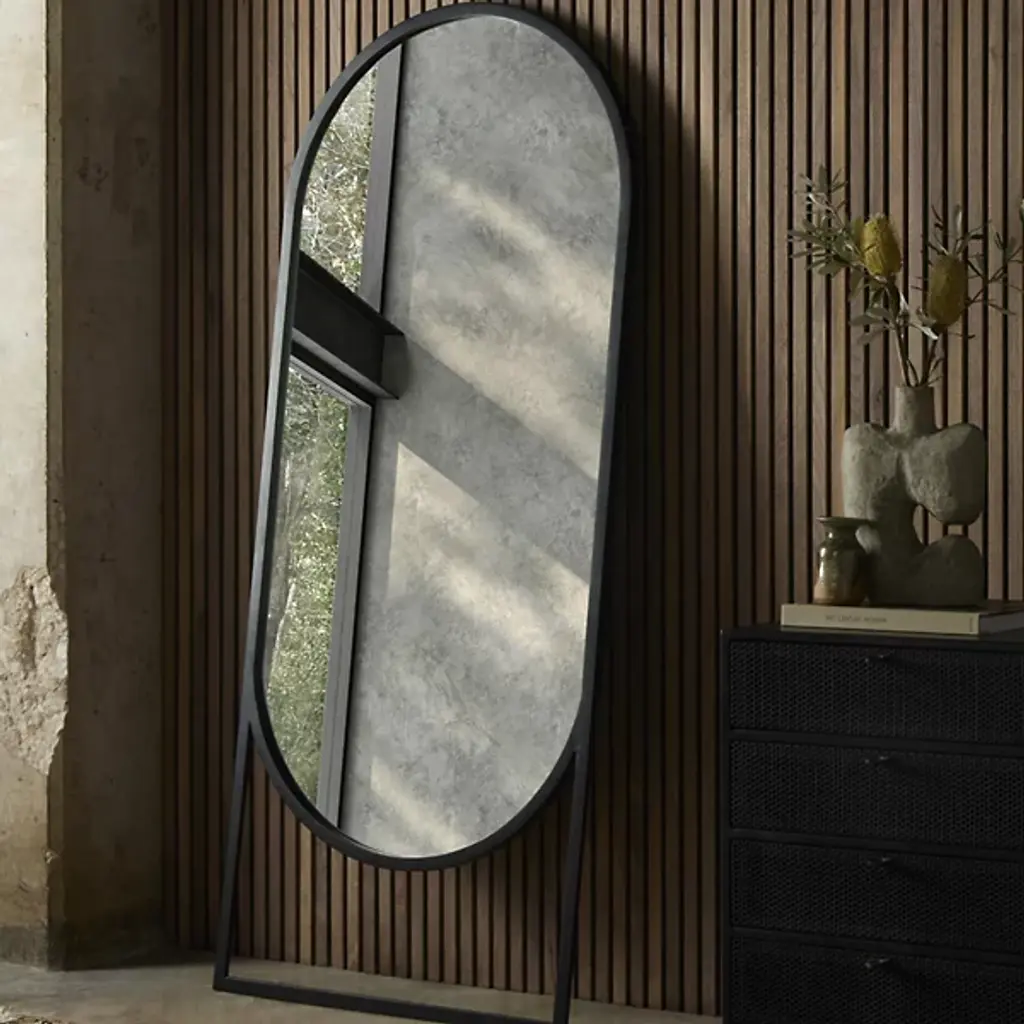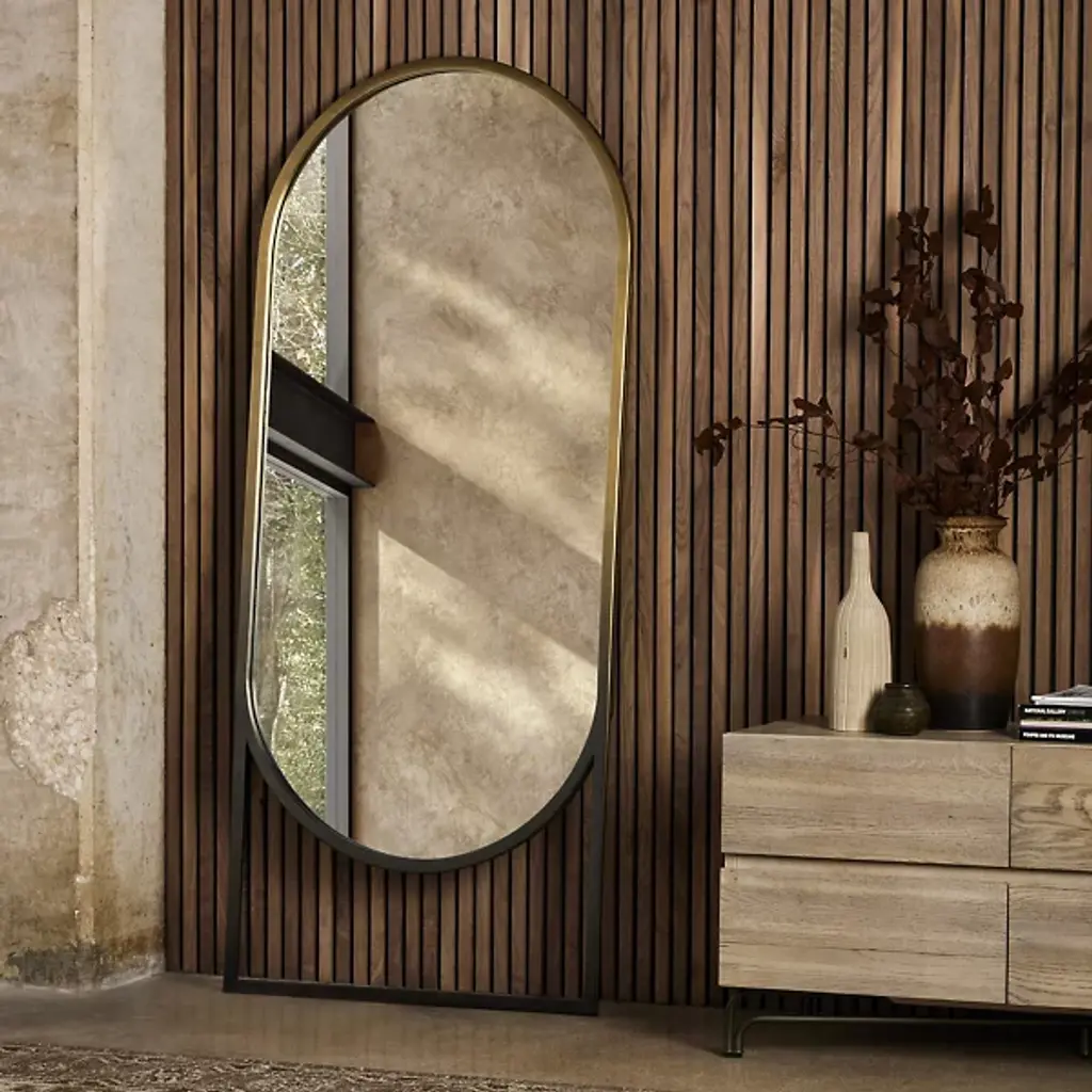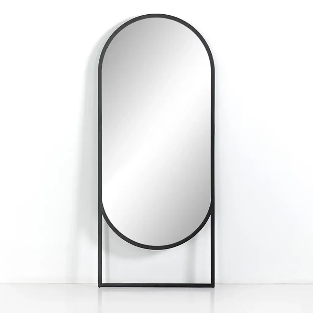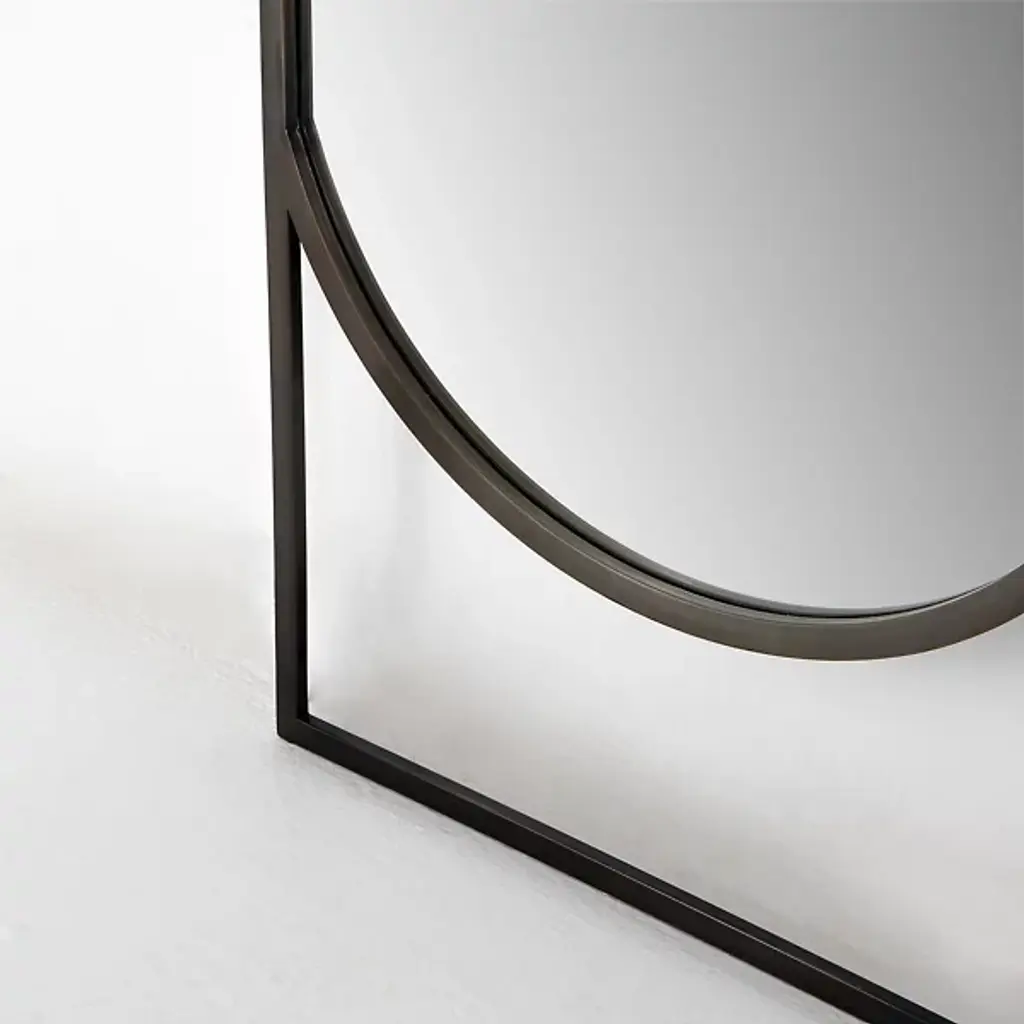 Take a closer look with the Dawson Floor Mirror from Four Hands. This floor mirror is elegantly designed in an ovular shape and composed of sturdy iron. Its framework maintains an open, linear profile to keep the mirror nicely cradled as it rests on your floor. This rustic modern piece can be used in a variety of contemporary settings, including living rooms, bedrooms, and more. A reliable D-ring mechanism adds stability.