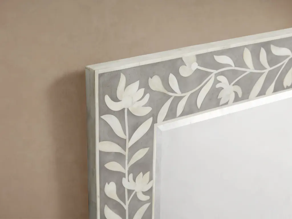Handcrafted in collaboration with artisans in the remote city of Udaipur, India, our Divya Floor Mirror is inspired by traditional designs. Mosaic floral motifs, reminiscent of jasmine blossoms, are created from individually placed bone inlays.