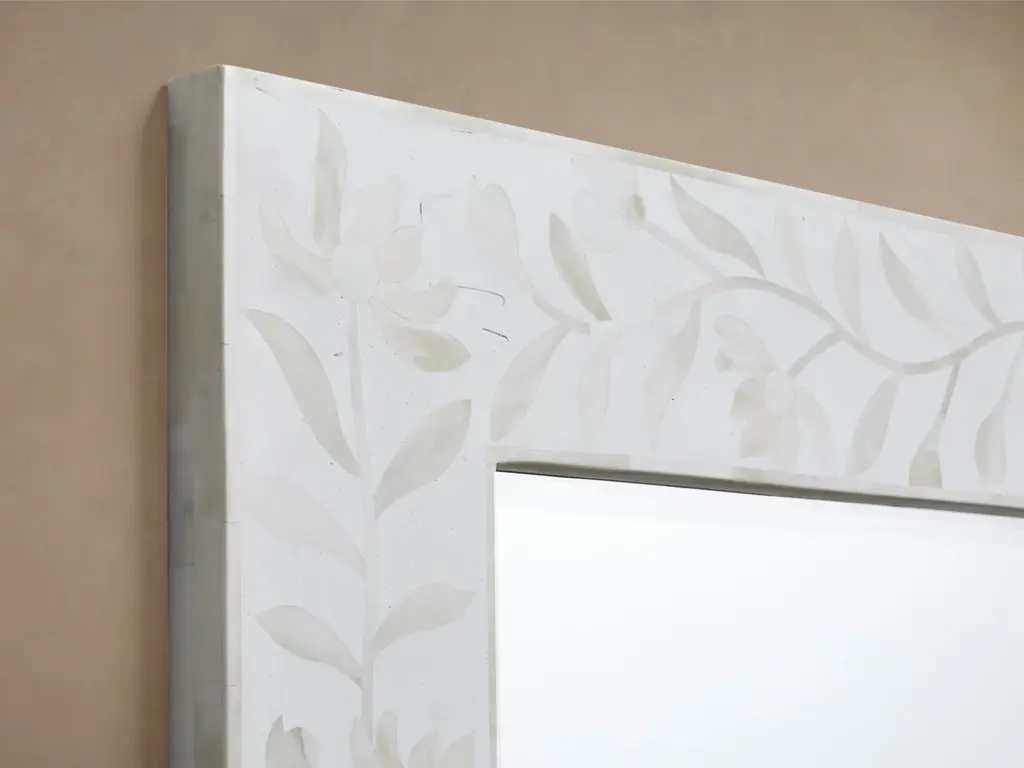 Handcrafted in collaboration with artisans in the remote city of Udaipur, India, our Divya Floor Mirror is inspired by traditional designs. Mosaic floral motifs, reminiscent of jasmine blossoms, are created from individually placed bone inlays.