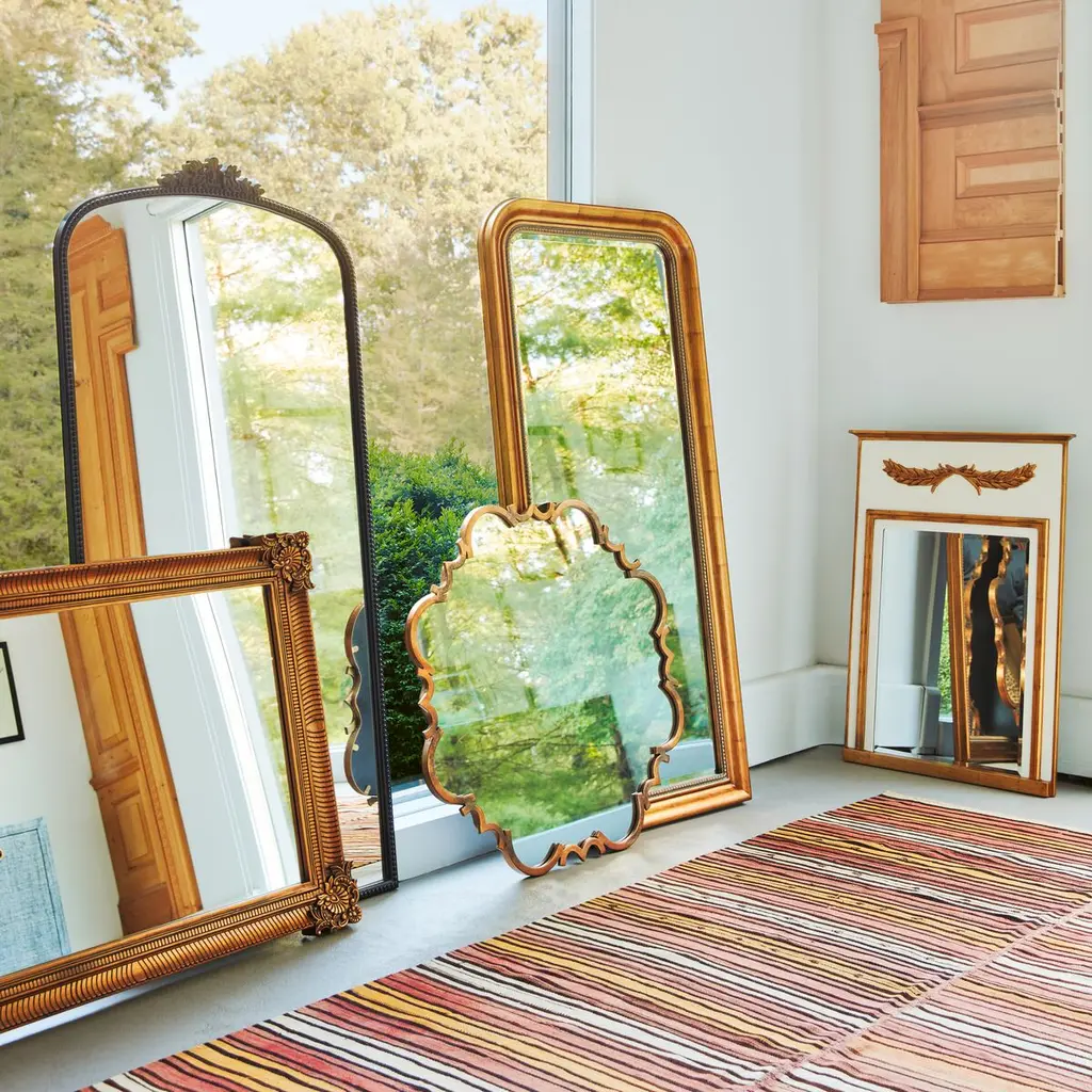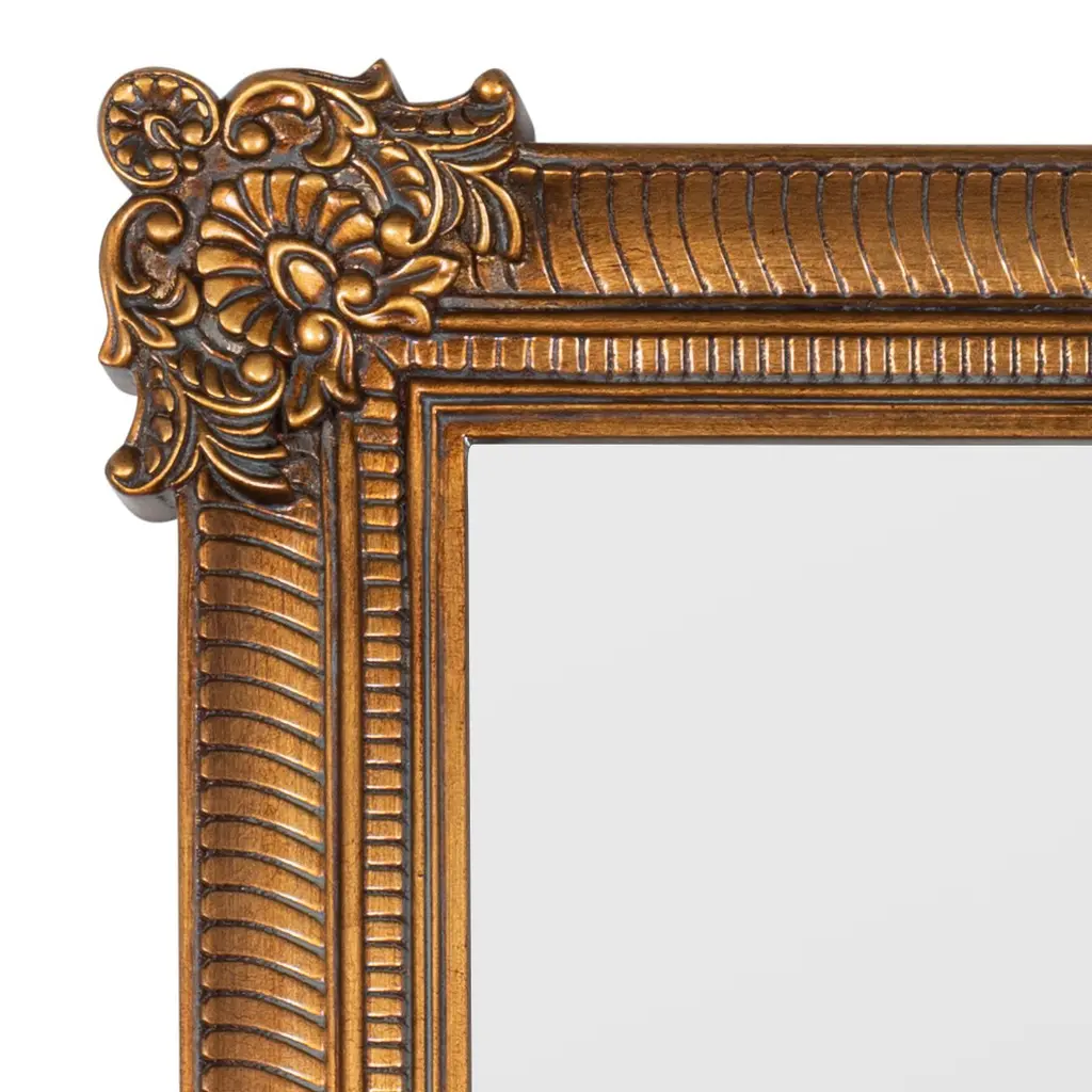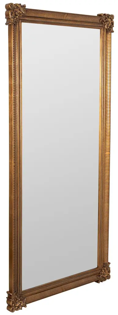 Exclusive to One Kings Lane: The epitome of Old World stateliness, this floor mirror's ornately detailed frame boasts the warm gold finish of a treasured family heirloom. Wherever you place it, it's certain to command attention. Also available in wall size.One Kings Lane brings you a line of furniture and decor designed by us and available only here. In keeping with our distinctive aesthetic, the pieces range from classic to contemporary and are available in a gorgeous variety of handpicked fabrics, finishes, and hardware.