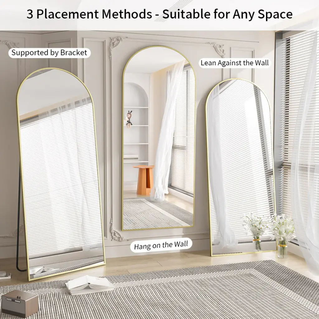 Enhance your living space with our stunning Full-length Floor Mirror. This shatterproof mirror is designed with a sleek aluminium frame, perfect for any room in your home, from the living room to the bathroom, the entryway to the bedroom. Choose from two elegant colours to complement your decor seamlessly.Experience a diamond-like HD mirror effect, offering exceptional clarity and enhancing the natural beauty of your surroundings.Our floor mirror features a premium arched-top frame, adding a touch of sophistication and luxury to your space. The slim design of the frame adds a classic touch while maintaining durability and sturdiness.Crafted from high-quality aviation aluminium alloy, this mirror frame is resistant to rust, moisture, and oxidation, ensuring its longevity and pristine appearance over time.Safety is our top priority. That''s why our mirror is made with premium explosion-proof membrane glass, providing you with peace of mind while delivering crystal-clear images. This special glass ensures that even if the mirror is accidentally damaged, it will not shatter into dangerous shards.Versatility is key with our home mirror. It can be easily leaned against the wall, free-standing in any room, or hung vertically and horizontally for a chic and personalized touch to your decor. Whether it''s a bathroom mirror, stand-alone bedroom mirror, living room standup mirror, dining room wall-mounted mirror, or even a floor-length mirror in your cloakroom or home gym, this versatile piece will elevate any space.
