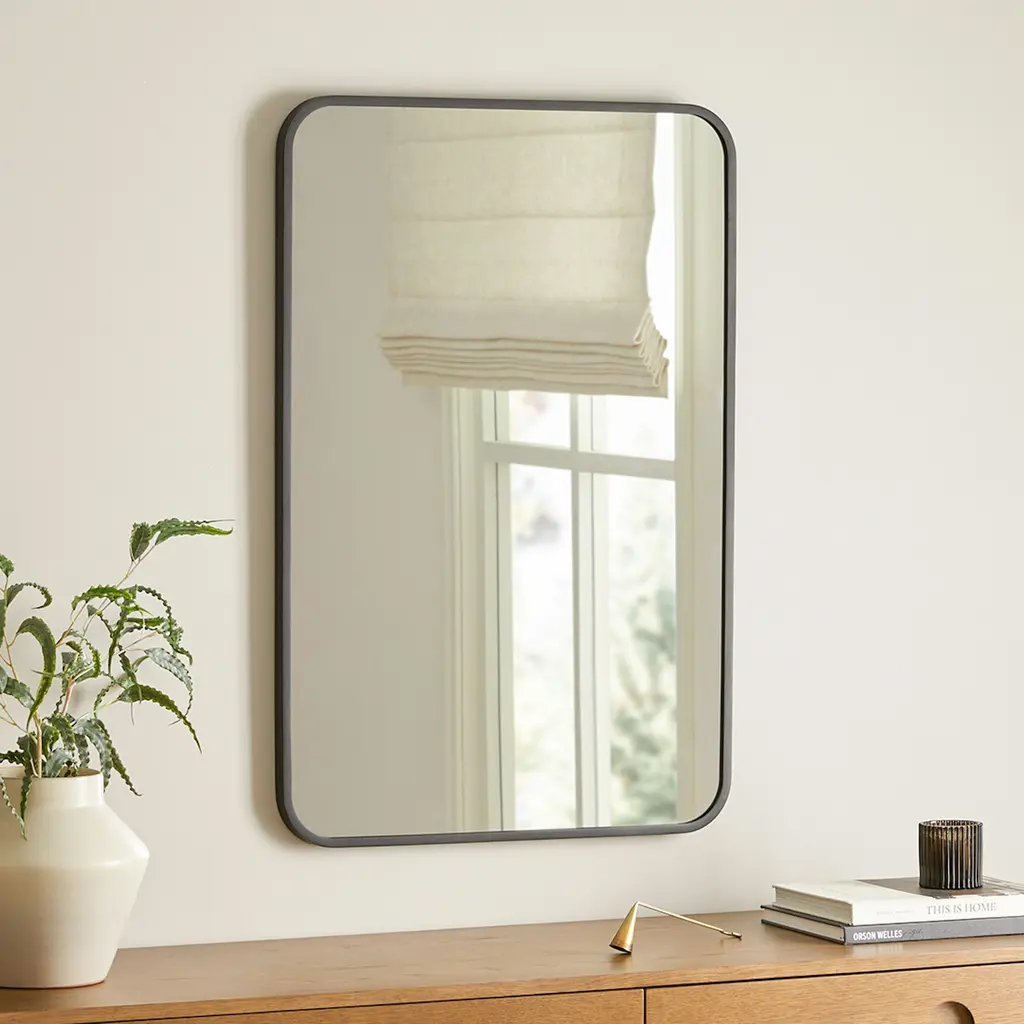 Edged with a slim black band, this minimalist floor mirror curves a subtle arch of modern elegance. The mirror, a Crate and Barrel exclusive, leans on the wall for effortless chic. With its black-finished stainless steel frame, the arched floor mirror is an understated essential in any room and is safe to use in bathrooms. Group with our Edge round, capsule, and rounded rectangle floor and wall mirrors in silver, brass and black to create an intriguing geometric display.
