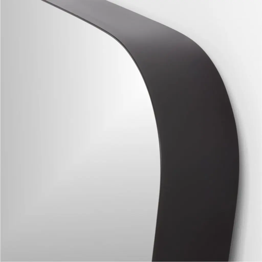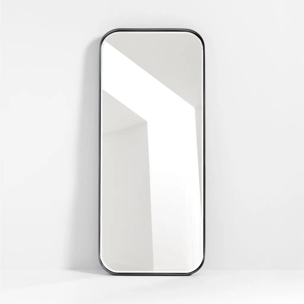 Our bestselling Edge mirror collection gets a new dramatic depth. Edged with a wide black band, this minimalist floor mirror curves a rounded rectangle. The mirror leans on the wall for effortless chic, or can be hung for a more graphic presence. With its deep black-finished stainless steel frame, the mirror has a bold impact while brightening the space. Group with our other Edge mirrors in contrasting or coordinating shapes and finishes to create an intriguing geometric display.