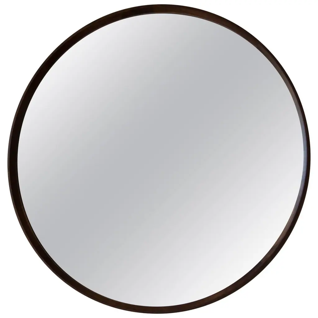 Edged with a slim brass band, this minimalist wall mirror curves a modern and elegant circle. Its reflective beveled glass creates a subtle series of concentric circles with delicate style. With its brass-finish stainless steel frame, the round wall mirror is an understated essential in any room and is safe to hang in bathrooms. Group with the arch, rounded rectangle, capsule and smaller round wall and floor mirrors in brushed nickel, brass and gunmetal of our Edge collection to create an intriguing geometric display.