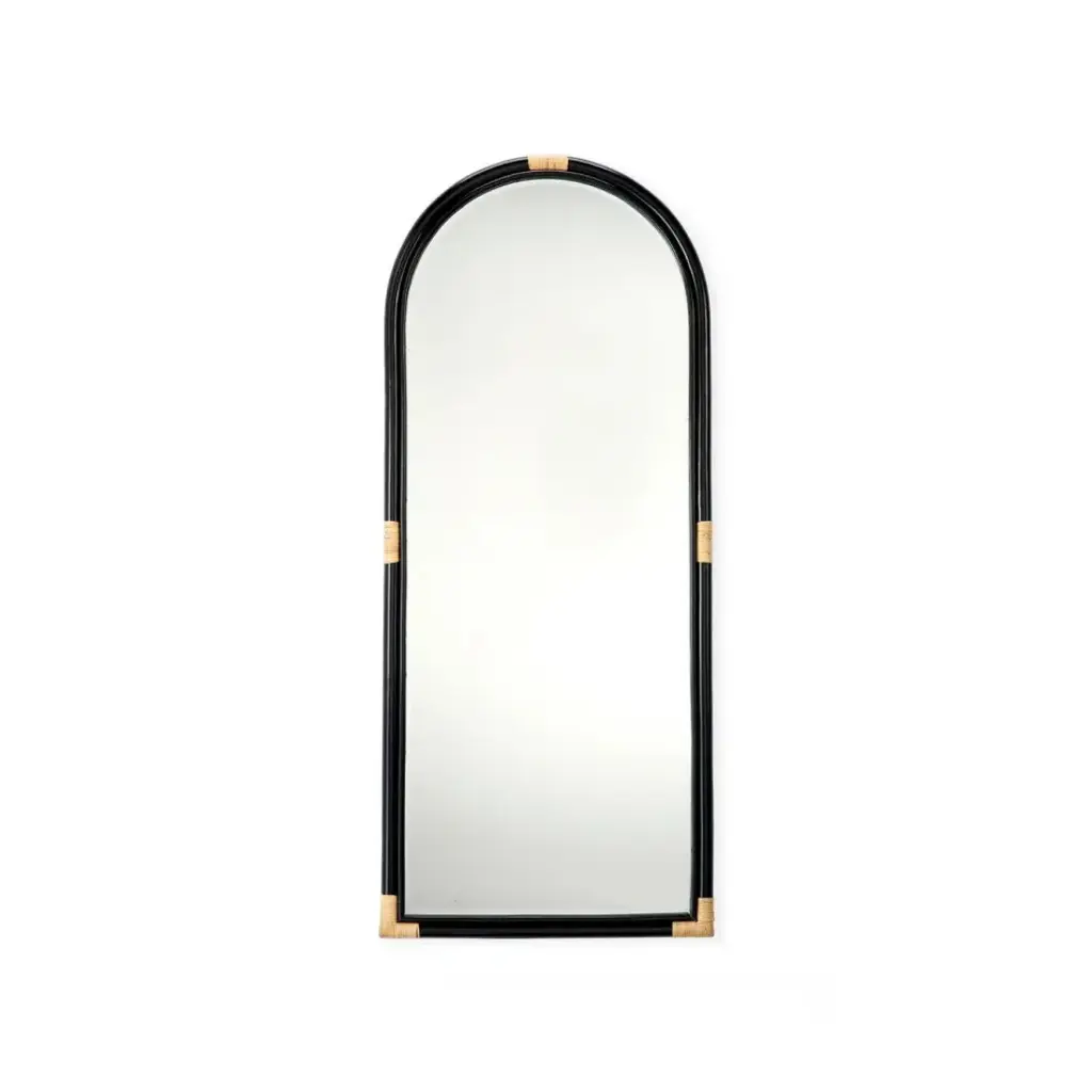 Edged with a slim band of solid walnut, this minimalist floor mirror curves a subtle arch of modern organic elegance. A Crate and Barrel exclusive, the mirror leans gracefully, and the clean-lined frame puts all the focus on the reflective glass it surrounds. With its richly hued wood border, the arched walnut floor mirror is an understated essential in the bedroom or closet. Group with our Edge round, capsule, and rounded rectangle wall mirrors in metals and woods to create a mixed-material display.