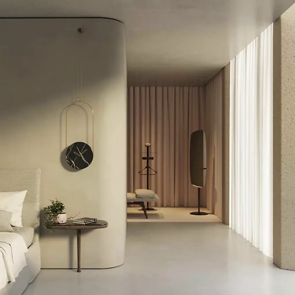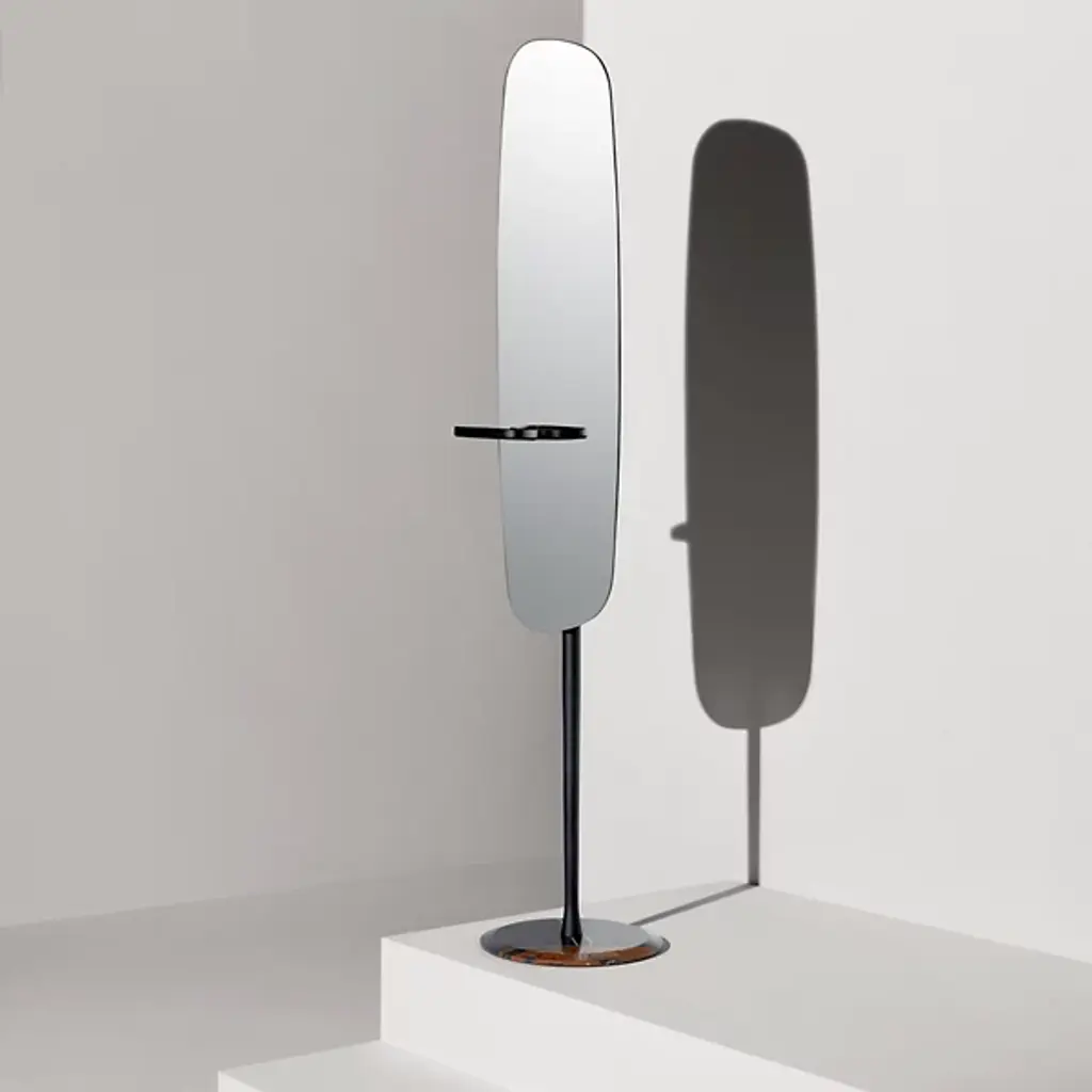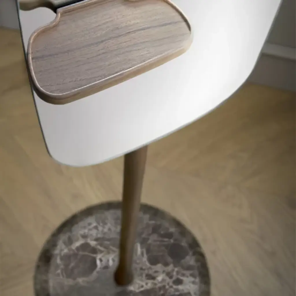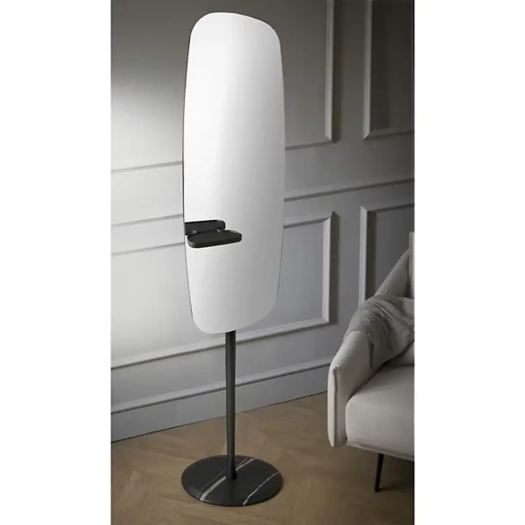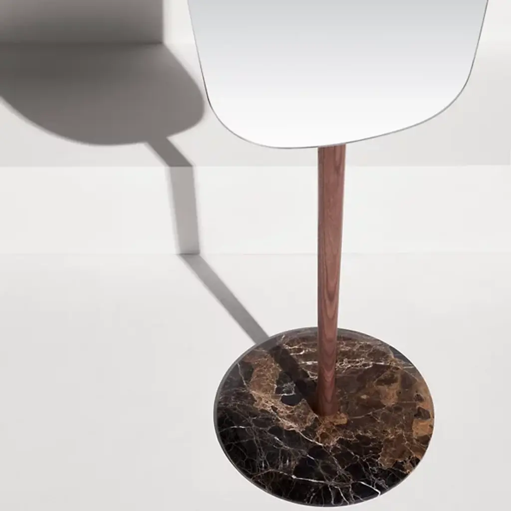 The Espejo Standing Floor Mirror by Nomon lends an artful accent to any home. Designed by Andres Martinez and Stefano Bigi, this piece features an asymmetrical mirror with rounded corners, giving it an organic quality. This natural element is continued with the use of a marble base and solid wood shelf affixed to its glass, creating a piece that is both beautiful and functional.