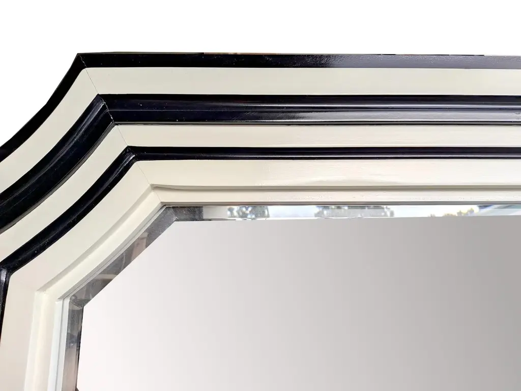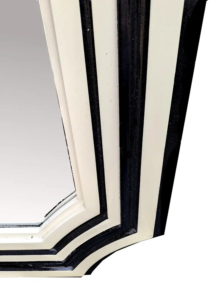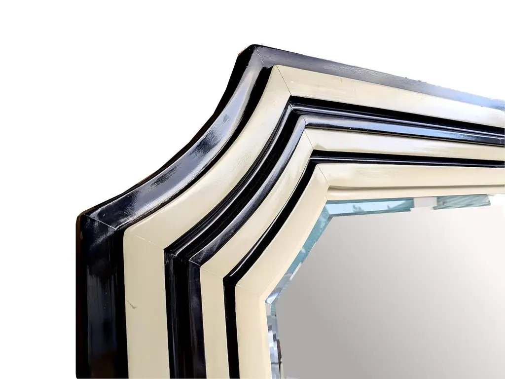 Every once in awhile I am blessed with a truly unbelievable find. This art deco style floor/ pier mirror, along with 6 others just like it, were acquired from the historic "Breakers Hotel" in Long Beach California. The Breakers hotel was originally opened in 1926, enduring many ups and downs throughout its rich history reopened after a four year close in November of 2024. This mirror exuding a refined elegance through its bold geometric design. The frame, constructed from lacquered resin and wood holds a bold beveled mirror. The black and white color palette, a characteristic of the Art Deco movement, offer a sense of modernity and order, while reinforcing its timeless appeal. This mirror would serve as a bold focal point in any space, enhancing both light and the perception of depth in a room. The mirror will look great in a hallway , over a console or anywhere. This striking mirror measures 52"W x 72"H including the frame.
