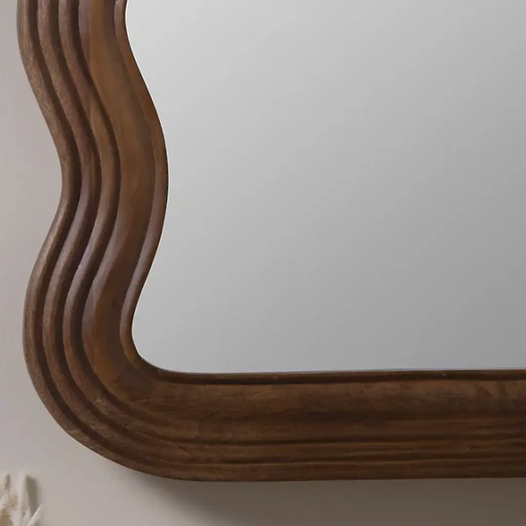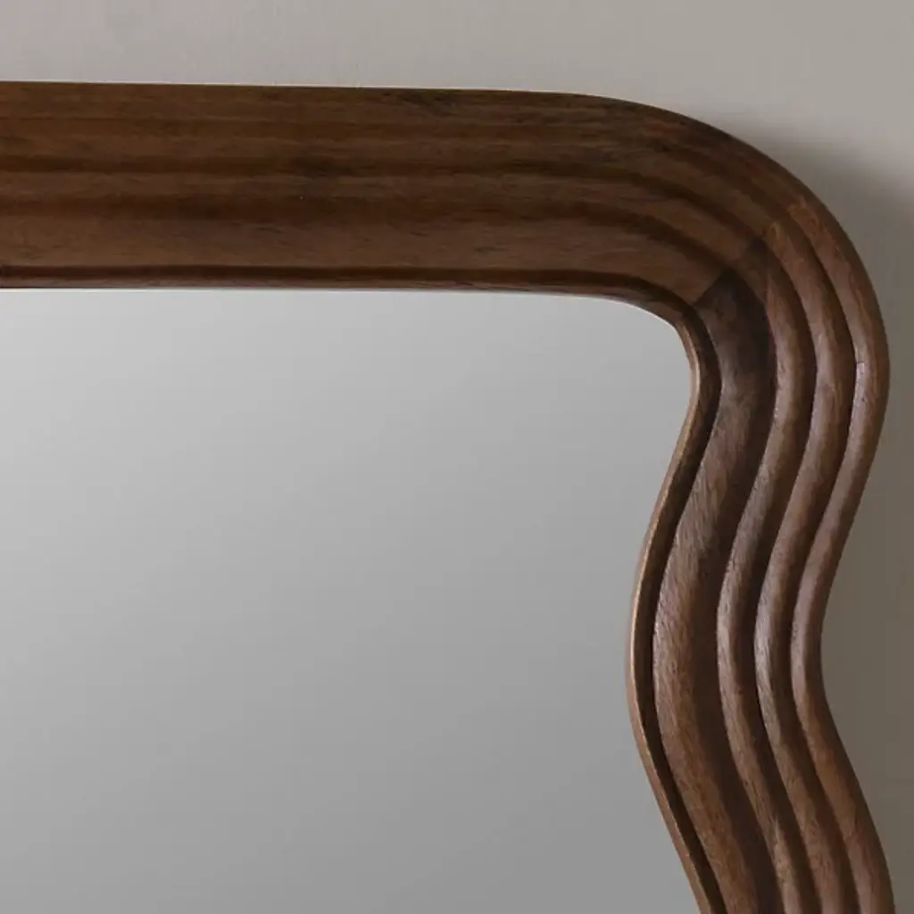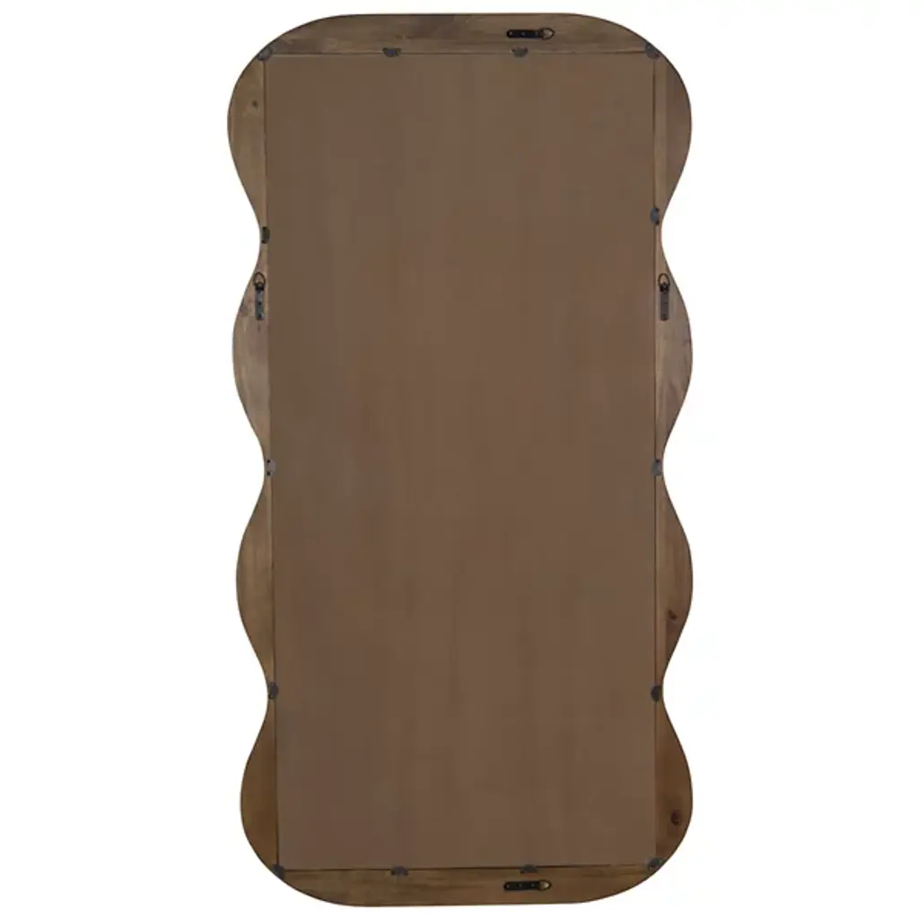 The Frances Floor Mirror from Cooper Classics combines rustic modern design with artistic flair. Its wavy wood frame, finished in a rich walnut tone, adds warmth and visual interest to any space. Perfect for making a statement, this full-length mirror enhances light, depth, and style, elevating your home decor effortlessly.