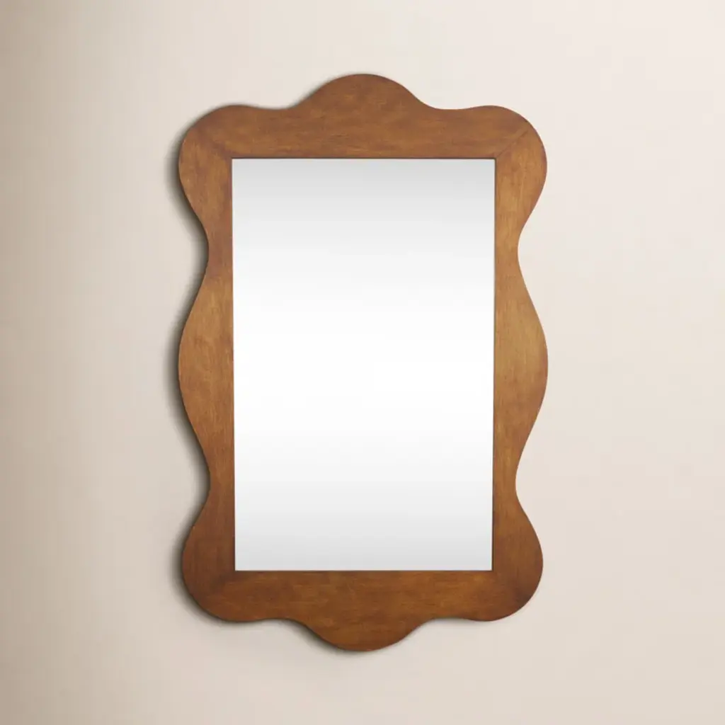 The frame's warm finish complements this mirror's undulating silhouette. Whether you hang it in a bedroom, in an entry, or just about anywhere else in your home, it's certain to command attention.