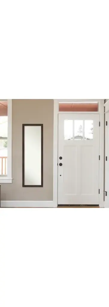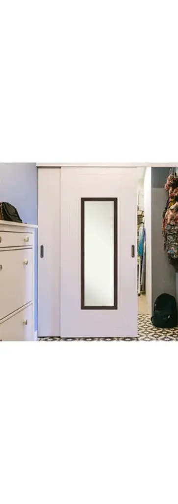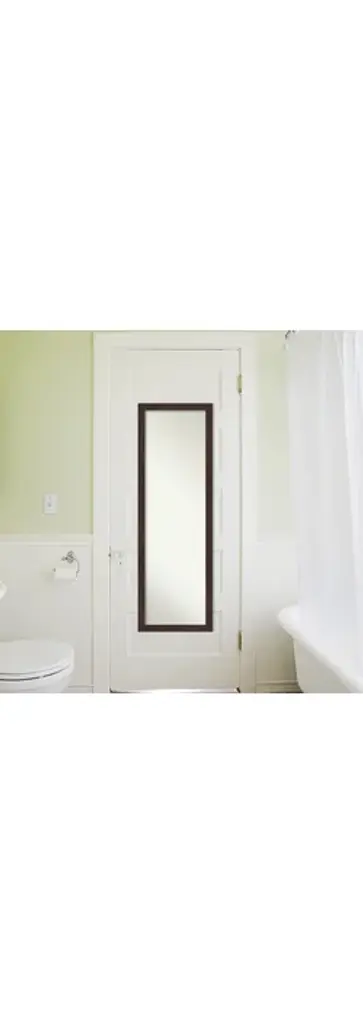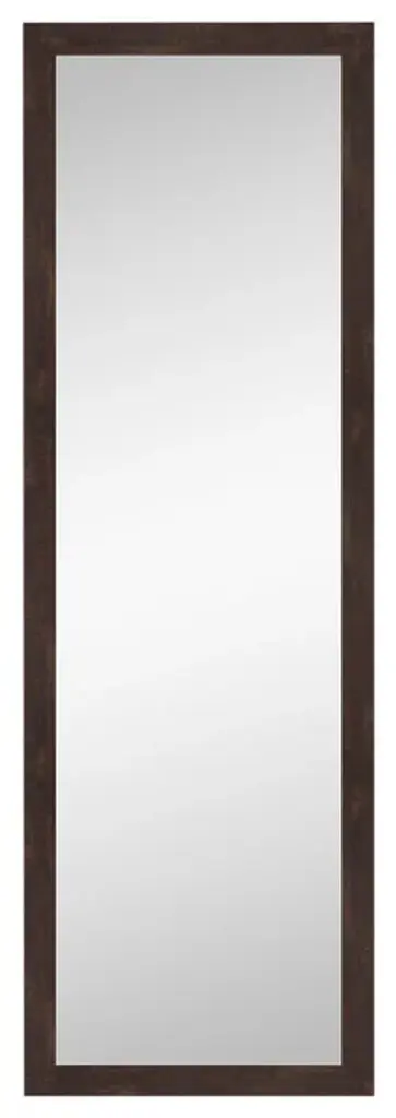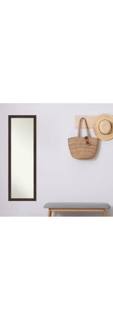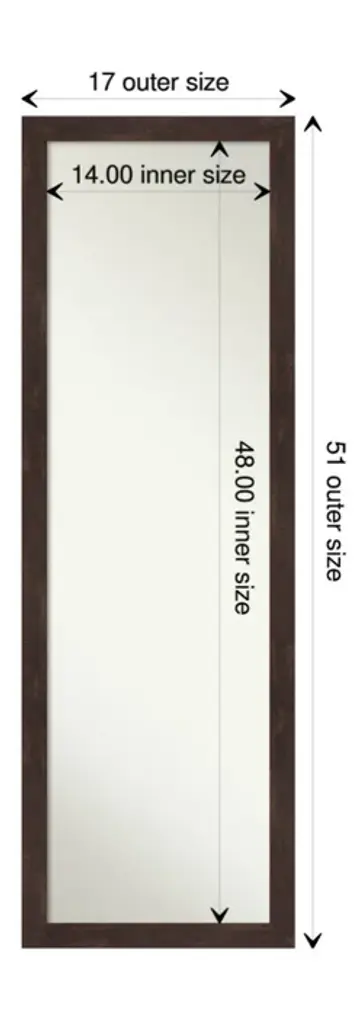 This 100% real wood, full-length Non-Beveled Mirror framed in the Fresco Dark Walnut frame, complements your decor without the need for unsightly over-the-door brackets. Individually made using traditional custom framing techniques, it has the quality you would expect from your local frame shop. It holds its value with premium finishing that can be appreciated up close. Our On The Door Mirror has two hooks to hang directly on your door or wall without additional anchors or brackets. Hang it on the back of a closet, bedroom or bathroom door, or on the wall as a standard full-length mirror.Features:MIRROR DETAILS: This mirror features premium glass for a clear, undistorted image and has a non-beveled surface to maximize the viewing area. The overall size of this full-length mirror measures 16.5 x 50.5 inches, including the frame. Its reflective area measures 14 x 48 inches. The mirror works perfectly as a door mirror, full-size mirror, or large mirror on the wall.WOOD FRAME DETAILS: The Fresco Dark Walnut frame is a walnut brown distressed flat panel frame with the look of a wood plank floor. Outer edge has a matte brown finish. The frame is 1.5 in. wide and stands 0.75 in. off the wall.NO OVER-THE-DOOR BRACKETS: This full-length mirror hangs directly on any door without unsightly over-the-door brackets.HASSLE-FREE HANGING: Each mirror has durable D rings attached to the back along with 2 hanging hooks and nails to tap directly into your door or wall. The D rings hang easily on each hook without additional anchors or brackets. Our nail and hook combination works well on traditional walls, solid doors, and even hollow core doors.PROTECTIVE BACKING: This mirror is finished with a solid surface backing to ensure stability and prevent moisture and dust buildup.ASSEMBLED IN THE USA: Each piece is assembled to order in Madison, WI USA.FOR HOME OR COMMERCIAL USE: Because of our attention to detail and focus on artistry, architects, interior designers, and homeowners alike choose this mirror to create beautiful living spaces.