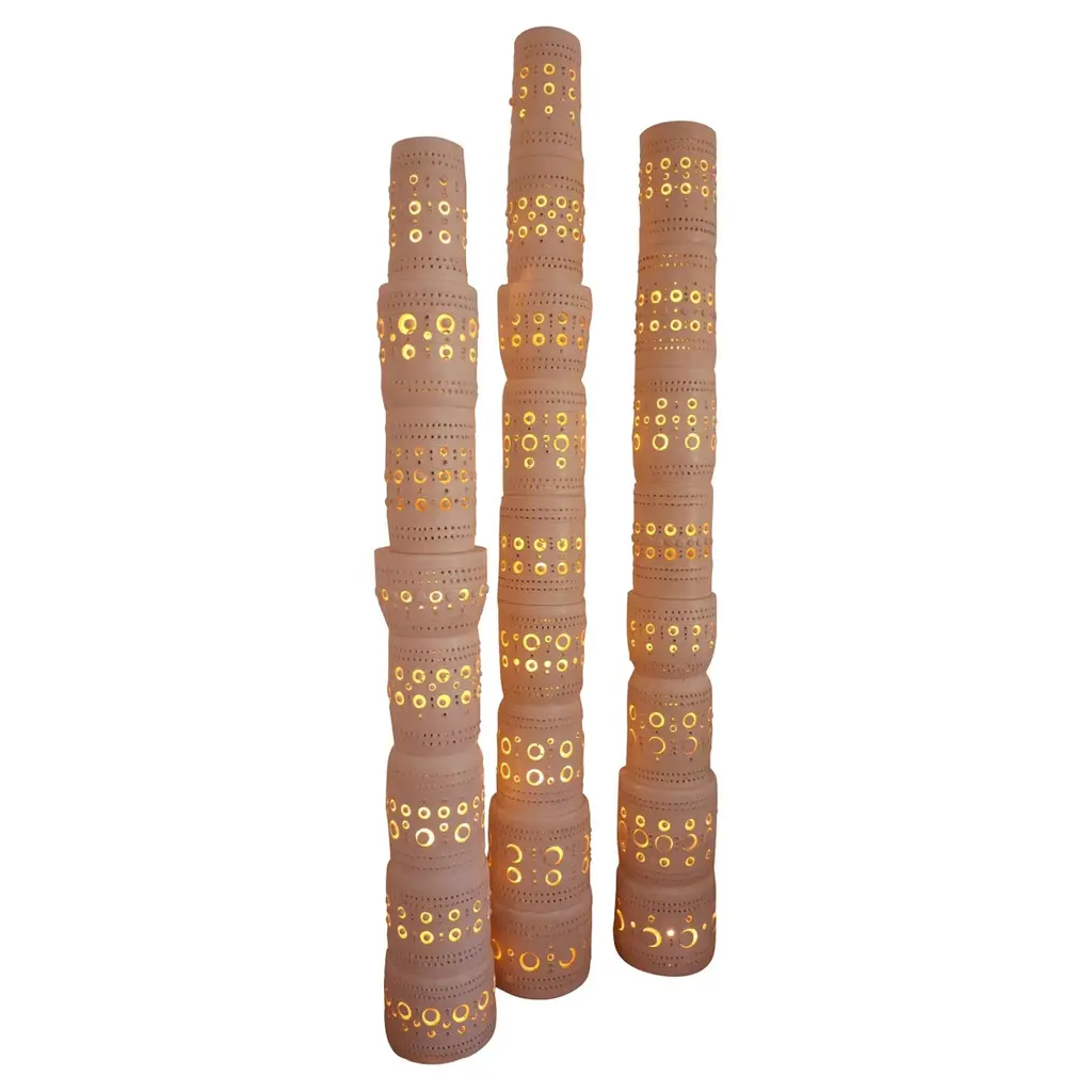 Iconic Georges Pelletier TOTEM in enameled ceramic, floor lamp bringing to your space an amazing light experience when the night falls, and a stunning sculptural presence during the day. Approximate dimensions height 159 cmGeorges Pelletier (1938) is a great contemporary artist exploring the fields of ceramics and lighting since the 1950s.Born in Brusels in 1938. At the tender age of 12 he enrolls in the École du Pioulier, founded by Célestin Freinet and located in Vence in the South of France. Here he learns free and modern art and discovers drawing and ceramics. During this period Pelletier starts showing solidarity and relief based on the principle of equality. This formation lends him a unique artistic identity. Georges Pelletier arrives to Paris in 1953 and continues with his drawing studies at l’Académie Charpentier meanwhile he still frequents Fernand Léger’s workshop. He enrolls the school of Métiers d’Art in 1955. Pelletier deepens into the world of ceramics during his time at Claude Pantzer’s workshop and the Potiers d’Accolay where he meets Raphael Giarusso with whom he will later share a work studio for over a year.“Drawing is the starting point of everything. I started design at the same time as ceramics at l’école Freinet. It’s an art that has allowed me to address my creations.” Pelletier opens his first studio in Paris in 1961. He is quickly signed up by Maison Bobois (now known as Roche Bobois), which spread and sold his light creations until 1973.Later on, Pelletier moves to Cannes where he continues his work on the conception of ceramic items, lamps, mirrors and other sculptures inspired in the 1960s. Besides, he also displays his work in the Consortium, Dijon Contemporary Art Centre in France.In the 1980s, he started to produce his famous Totems and Suns, these pieces has allowed the rediscovery of this bold artist whose creative genius brings light to the world’s most beautiful homes.The work of Georges Pelletier is presented by Galeria Tambien, a gallery that focuses on art, ceramics and design from the 1950s to present days, it is located in the town of Santa Gertrudis de Fruitera right in the middle of Ibiza island.