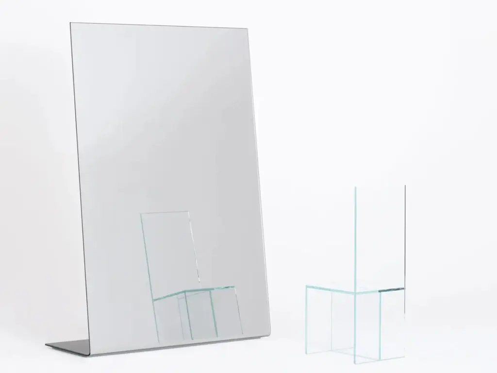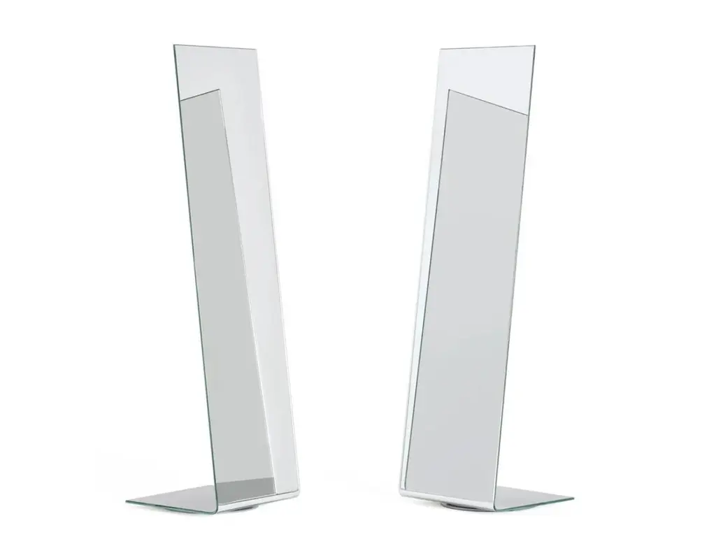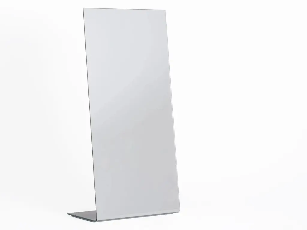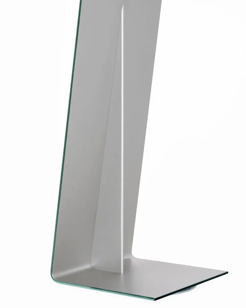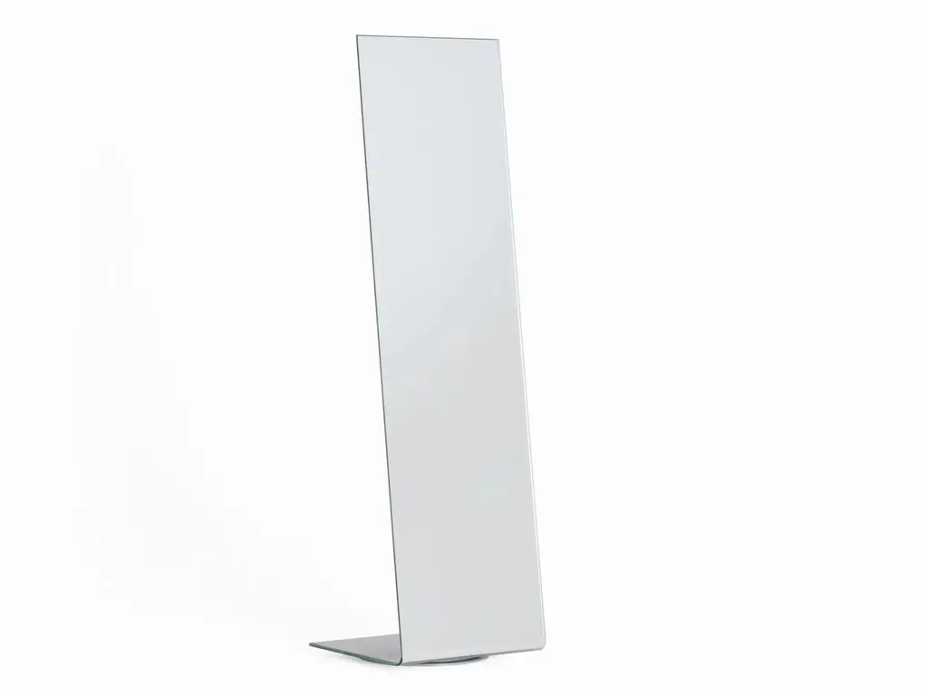 Free standing floor mirror made from 12 mm extra clear curved and manually silvered glass. The vertical edges are embellishd by a unique bullnose edge polishing. On the back, finished with a silver-grey lacquering, there is a discrete reinforcement which stiffens the glass panel. It is available in three different widths, with a removable counterweight which gives stability. The narrower version (code IMI01) has a swivel base.Not available custom made.DIMENSIONS:• Small: 50×45×174 cm• Medium: 85×45×173 cm• Large: 120×45×173 cmPrice refers to the small version.