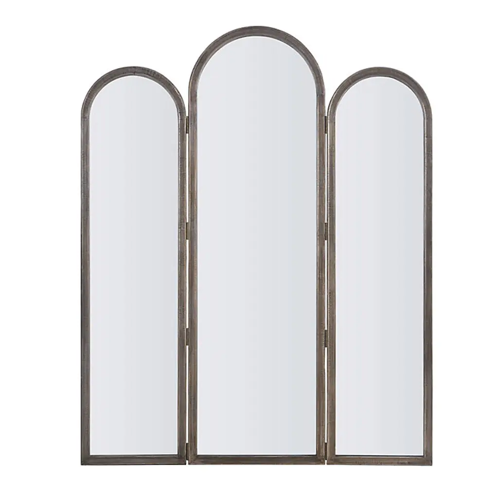 A fairytale mirror come to life! Our magical Glinda Tri-Fold Mirror makes any lucky girl who peers inside feel like a princess. The grandly scaled, triple-arch frame is hand crafted of mango wood and finished in an antique metallic wash for a silvery golden glow. This full-length dressing mirror is designed to stand on the floor of your bedroom or closet, and is fully finished on the back in matching metallic wash to look beautiful from every angle. Glinda Tri-Fold Mirror features: