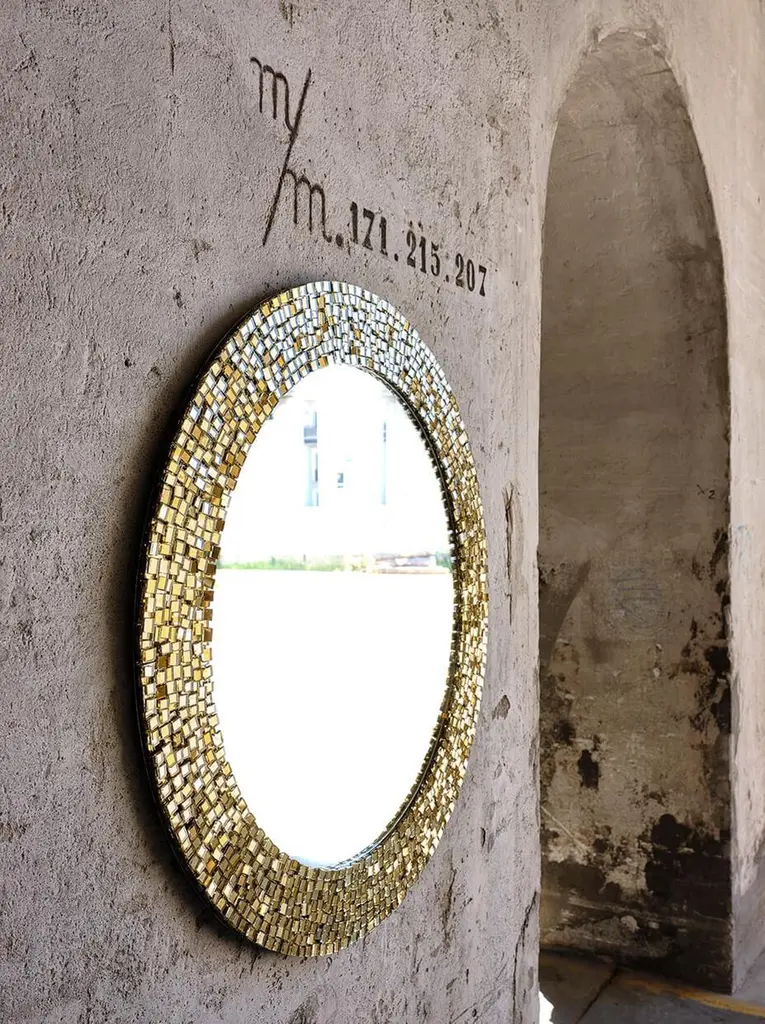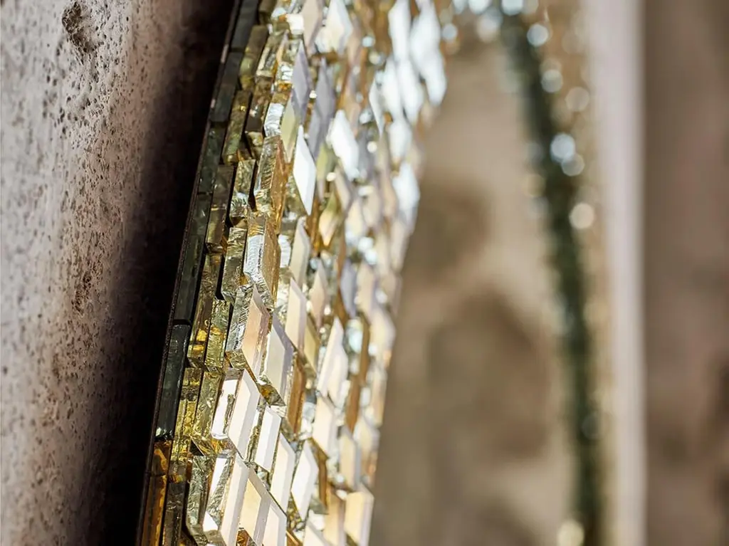 Gold Sovrapposto round mirror by Davide MedriMaterials: mirror, glass mosaicDimensions: D 100 x H 100 cmAlso available in silver, other sizes and square shape.Davide Medri was born in Cesena on August 7th 1967 and graduated at the Academy of Fine Arts in Ravenna, the Gino Severini State Mosaic Institute and the Albevainer Professional Mosaic School.After various artistic experiences, with the meeting with the Dilmos gallery in 1997, the first furnishing accessories in mirror mosaics were created. Today's portfolio includes, in addition to glass mosaic mirrors: tables, floor lamps, wall lamps and works of art.The manufacture is completely handmade inside the laboratory in Cesena. Every single piece of glass is cut and fixed by hand guaranteeing high quality, each artistic element is unique in its design and can be tailor-made in any size.Davide Medri's works of art have been successful in terms of market, press appreciation and recognition by architects and interior designers in Italy and abroad.
