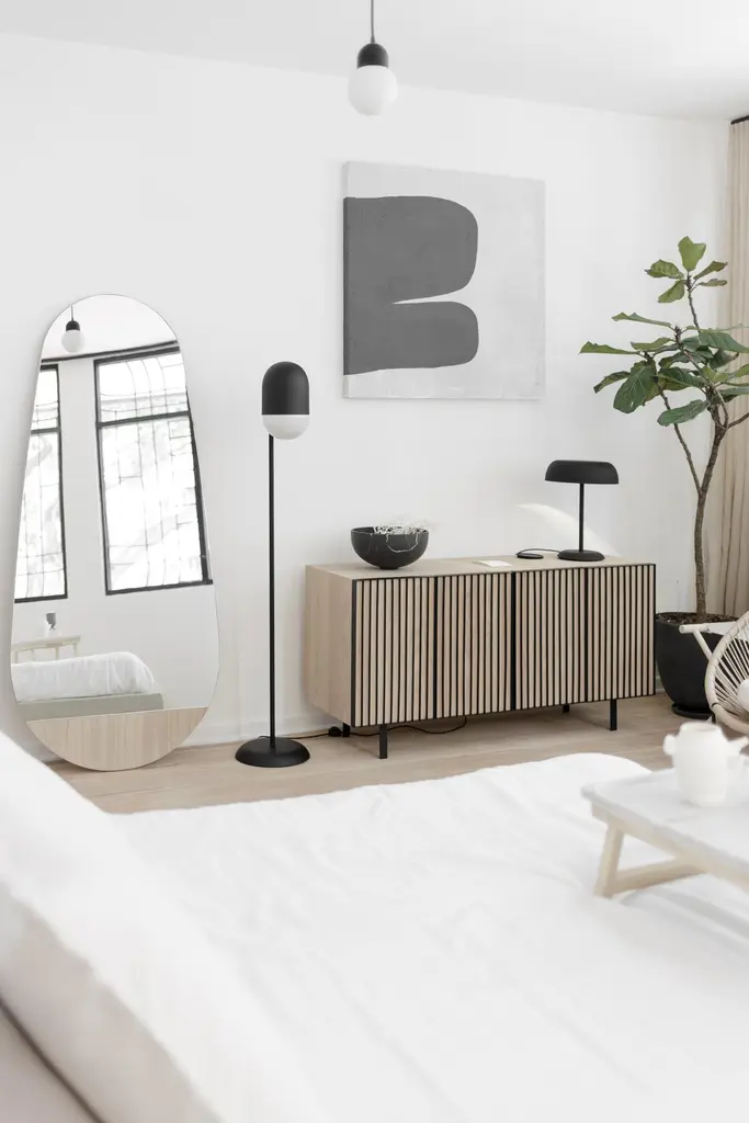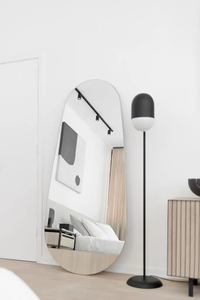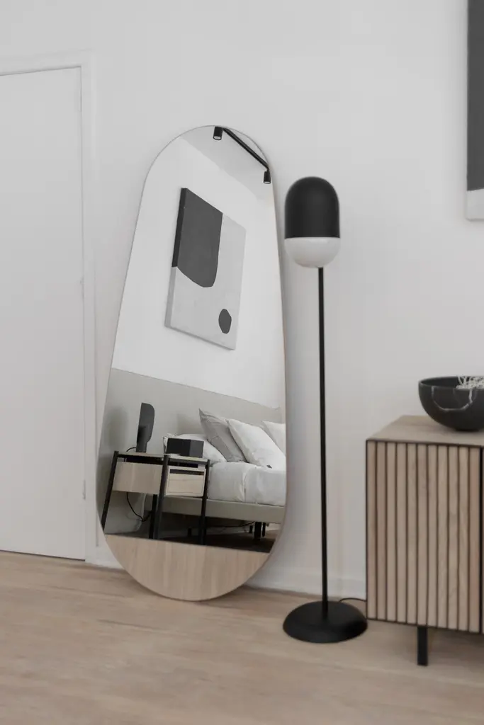 The Gota Mirror follows an organic shape with a stripe at the bottom intended to lift it off the floor. This unique mirror is double-faced and mounted on a wood veneer base. Its fluent shape gives a creative touch to any environment. Production time: 6-8 weeks for items without marble / 13-14 weeks for marble pieces. Shipping +10 additional business days. Casa Quieta uses natural materials such as woods, stones, fabrics etc. These materials may vary in tone, veining, and cavities due to their natural origin. This is part of the inherent beauty of materials and is not considered a flaw. Due to the artisan nature of our production process, there is a +/- 3mm measurement tolerance.