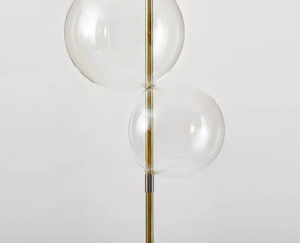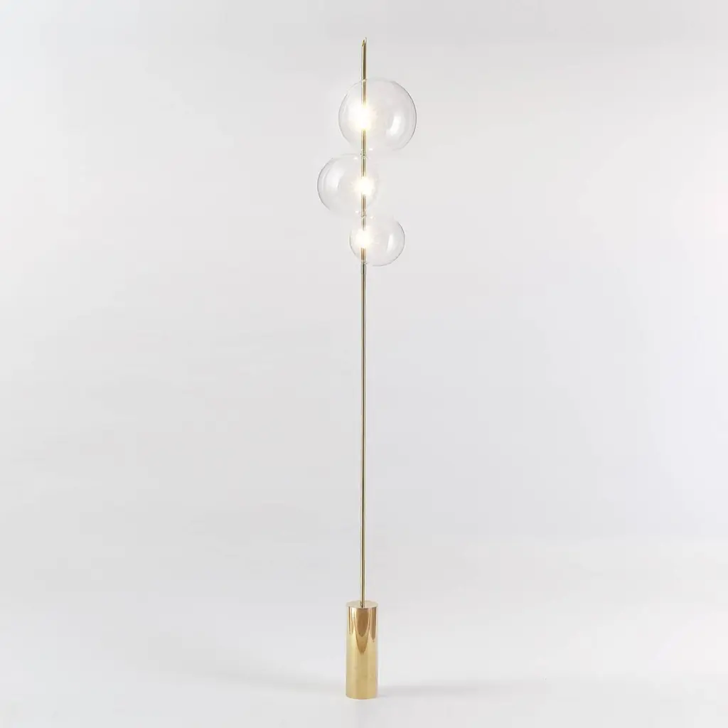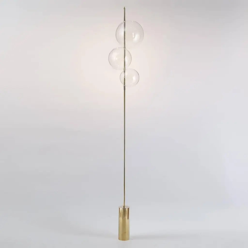 Inspired by pieces of Hail, Grandine Three Lights Mirrored Brass is a Minimal Contemporary Floor Light composed of three touching Handblown Glass Orbs, positioned to give the impression of balls of ice that have melted together to form one Solid, Transparent Piece.This lamp has one LED light source in each Glass Globe housed inside the rod. The base is Brass and contains the transformer. It is available in various finishes. Please refer to us for detailed photos of the finishesThe brass is unsealed and will patina gracefully over time.Lacquered finish available upon request.Dimensions: H 79” • 10” • 11”, H 200cm • 29cm • 25cm weight: 22lb • 10kgLed light type: proprietary 24vcc led • two x 3w • one x 5w • 2700k supply: 100-240v 50/60hzLight control: in line on-off switchMaterials: machined brass, handblown glassGrandine is finished and assembled by hand in our studio in Italy. Each piece is made to order and customizations are available.Dimmer along the cable available upon request.