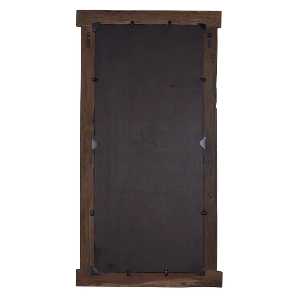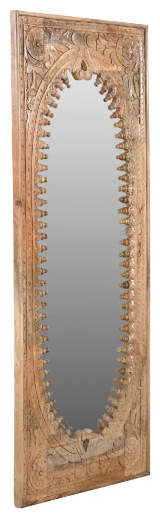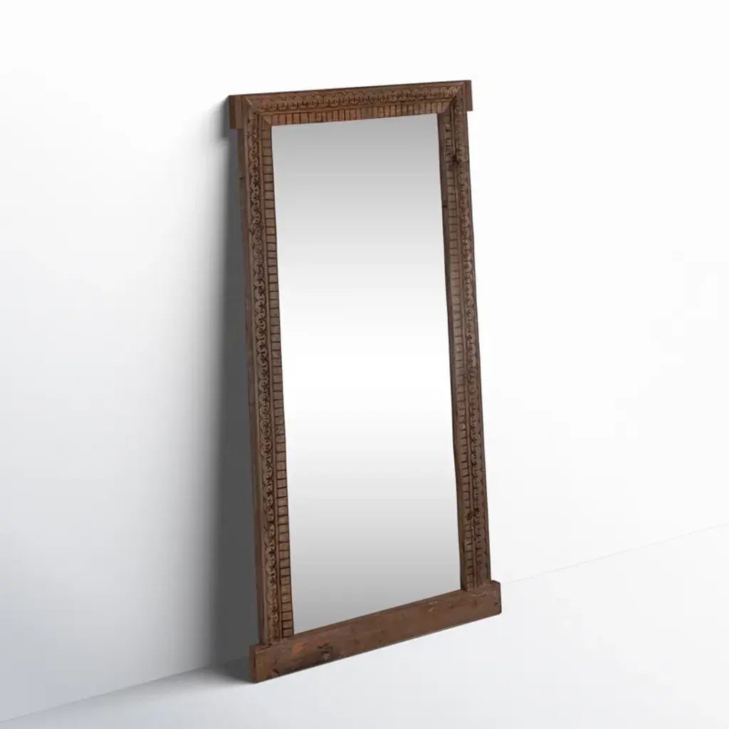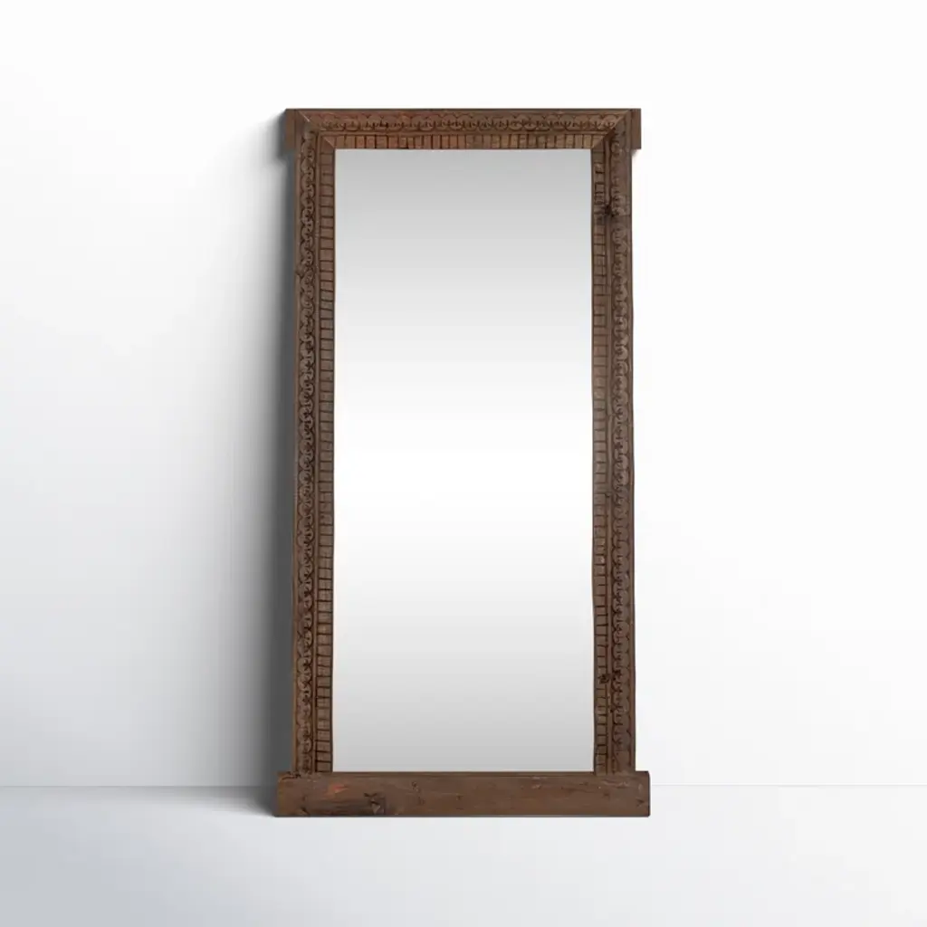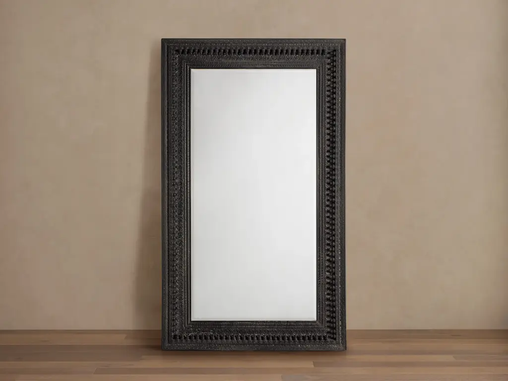 Cool-toned pine frames this large-scale floor mirror, softening the look with slightly curved interior corners. A simplistic molding overhang detail along the top and bottom offers a visual structure, finished with petite bun foot details.