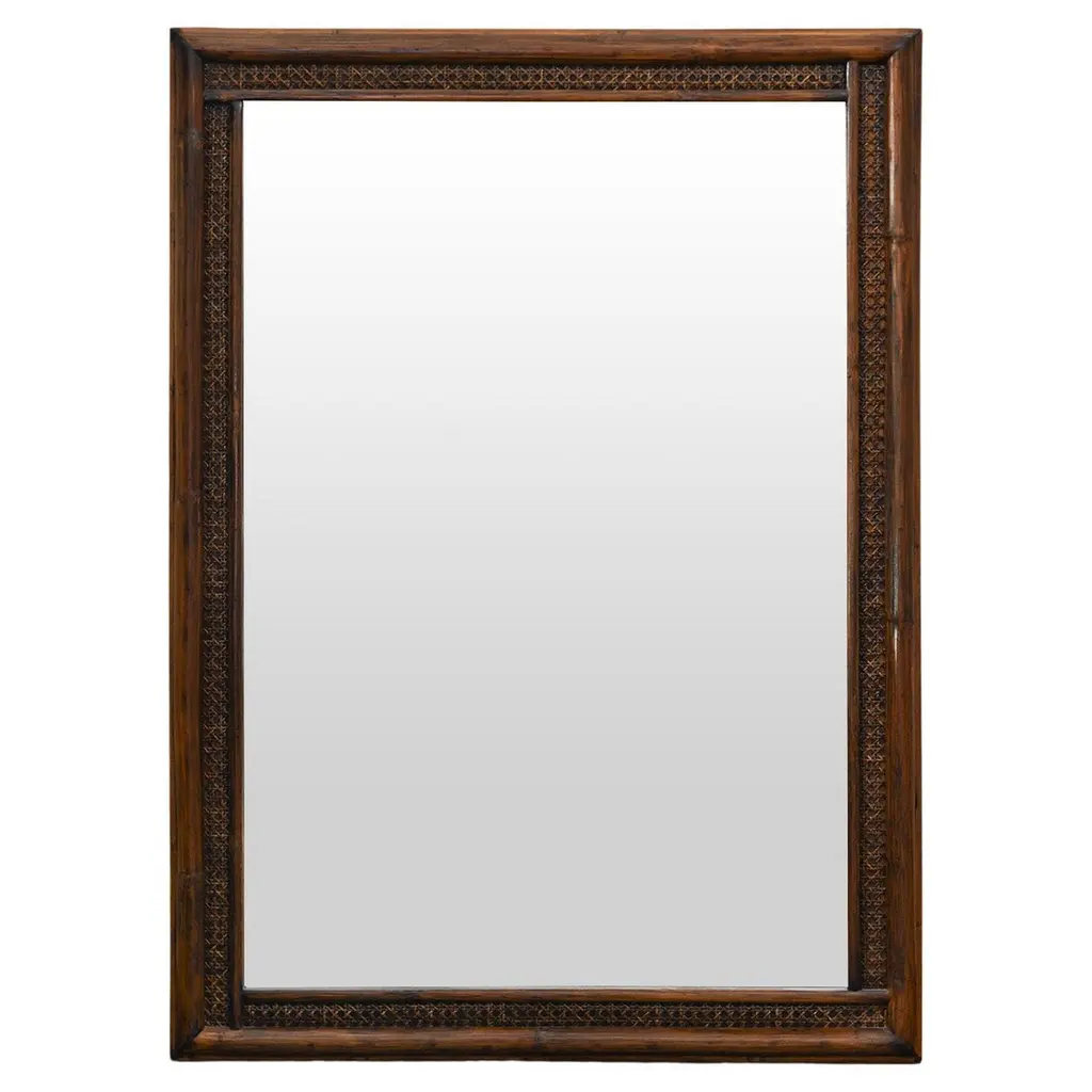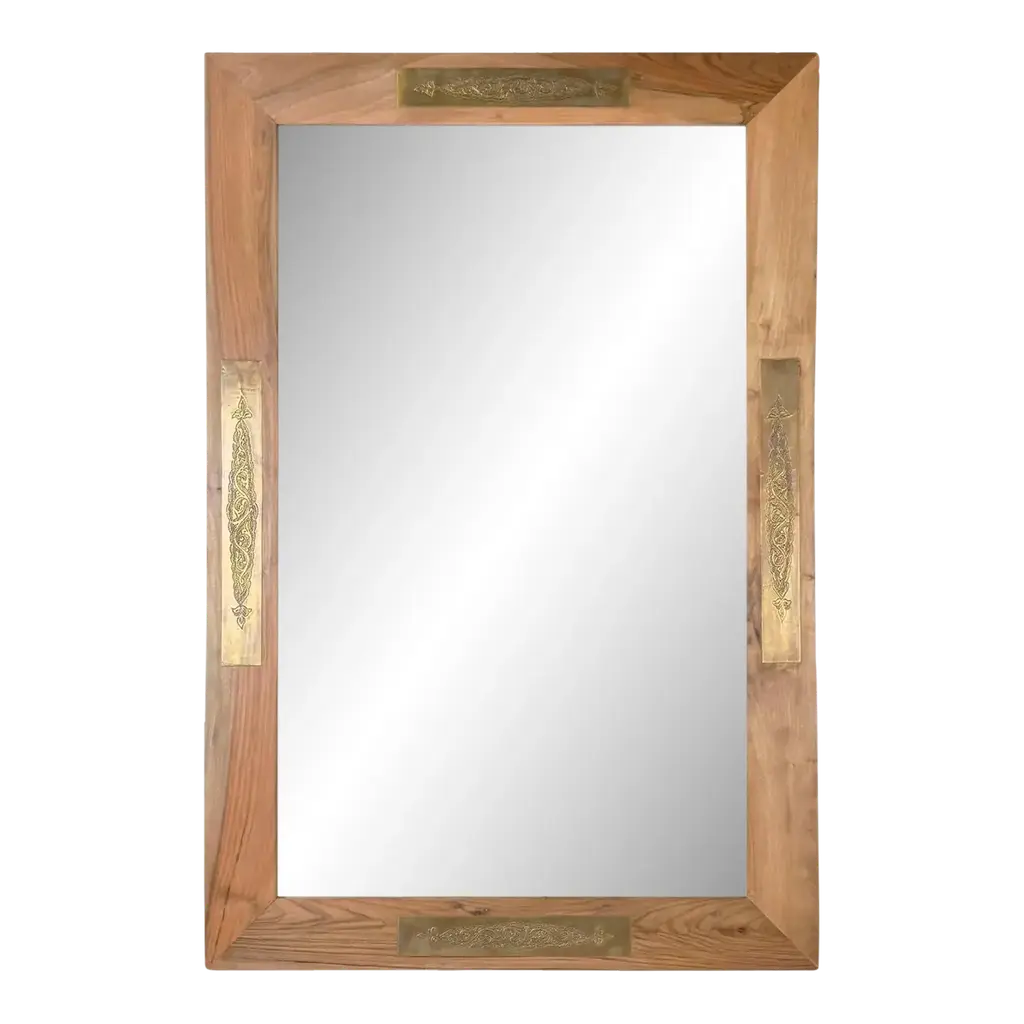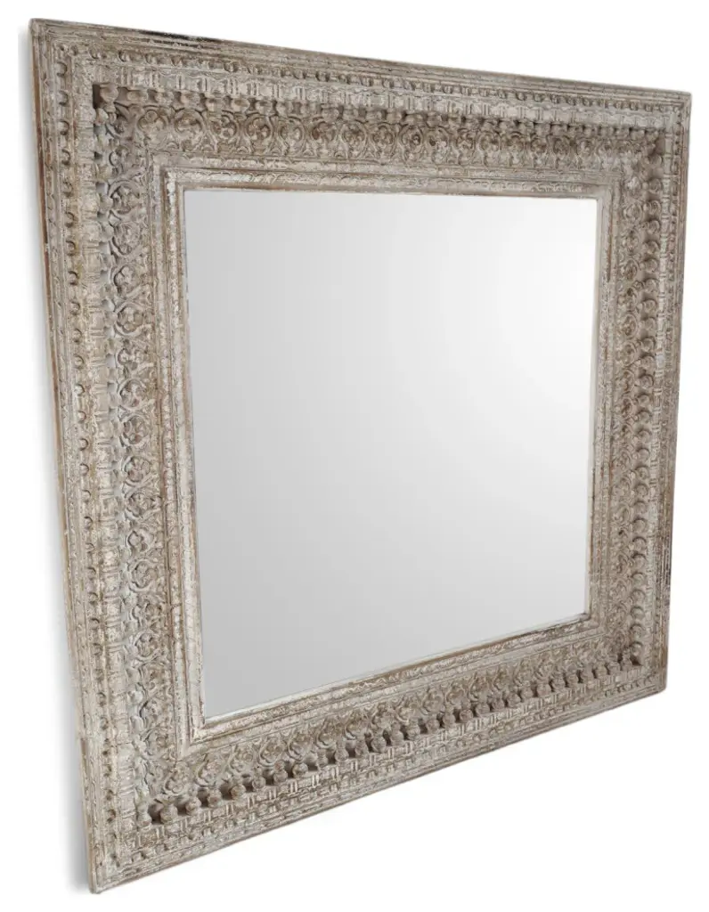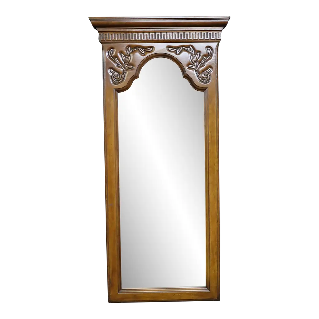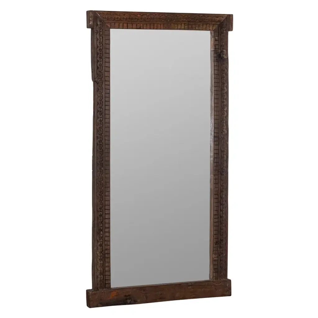 Cool-toned pine frames this large-scale floor mirror, softening the look with slightly curved interior corners. A simplistic molding overhang detail along the top and bottom offers a visual structure, finished with petite bun foot details.