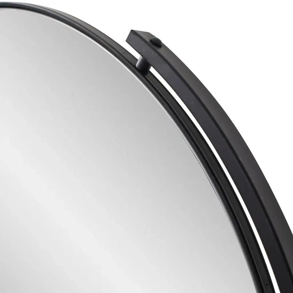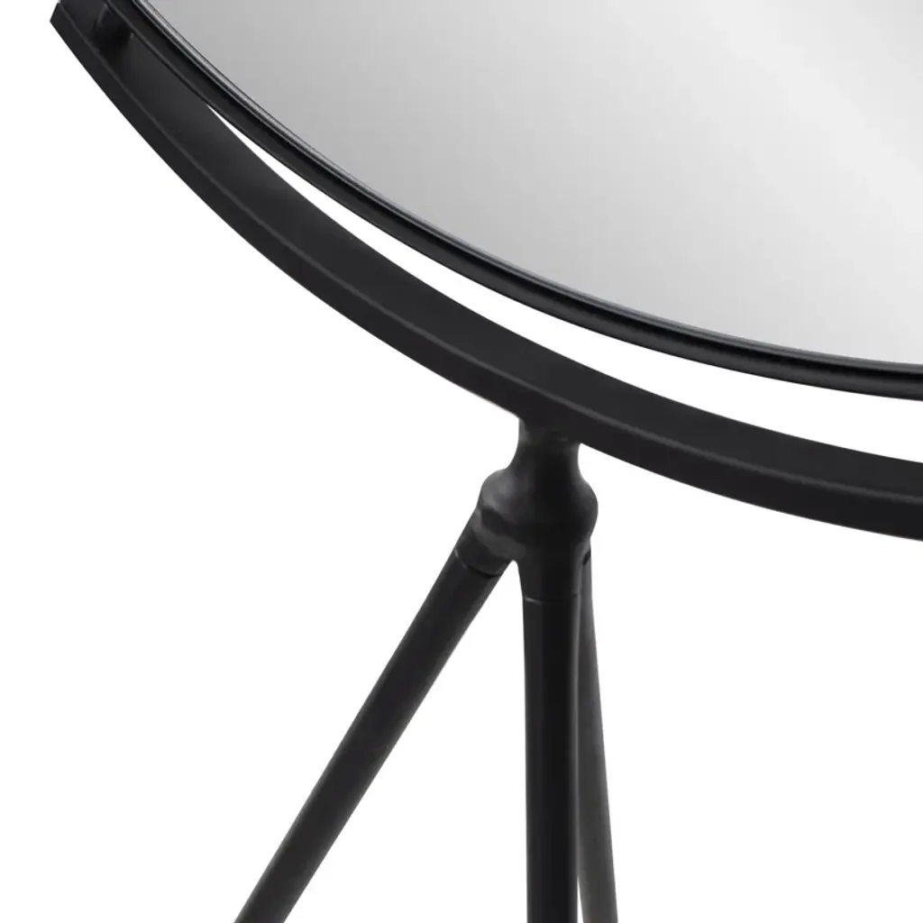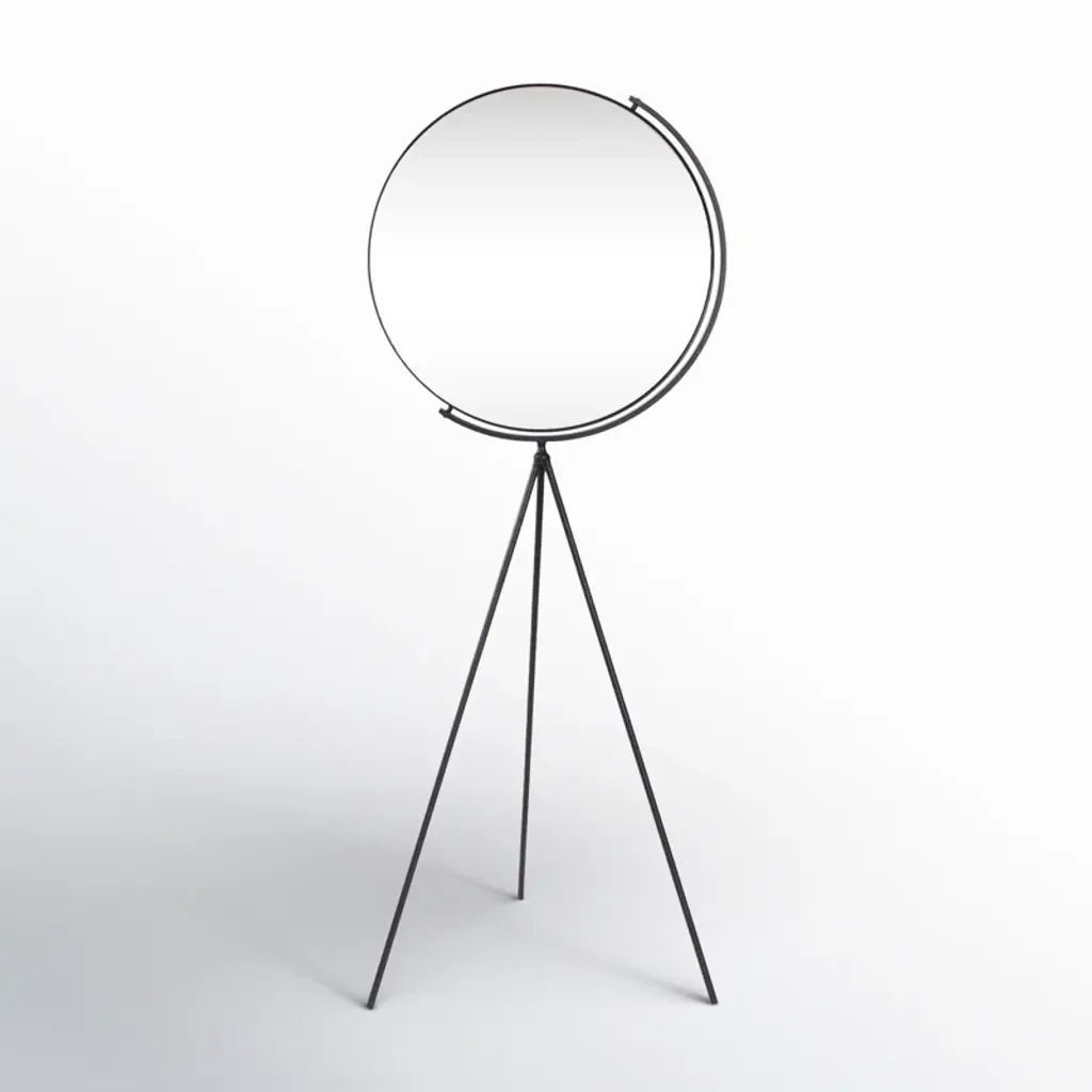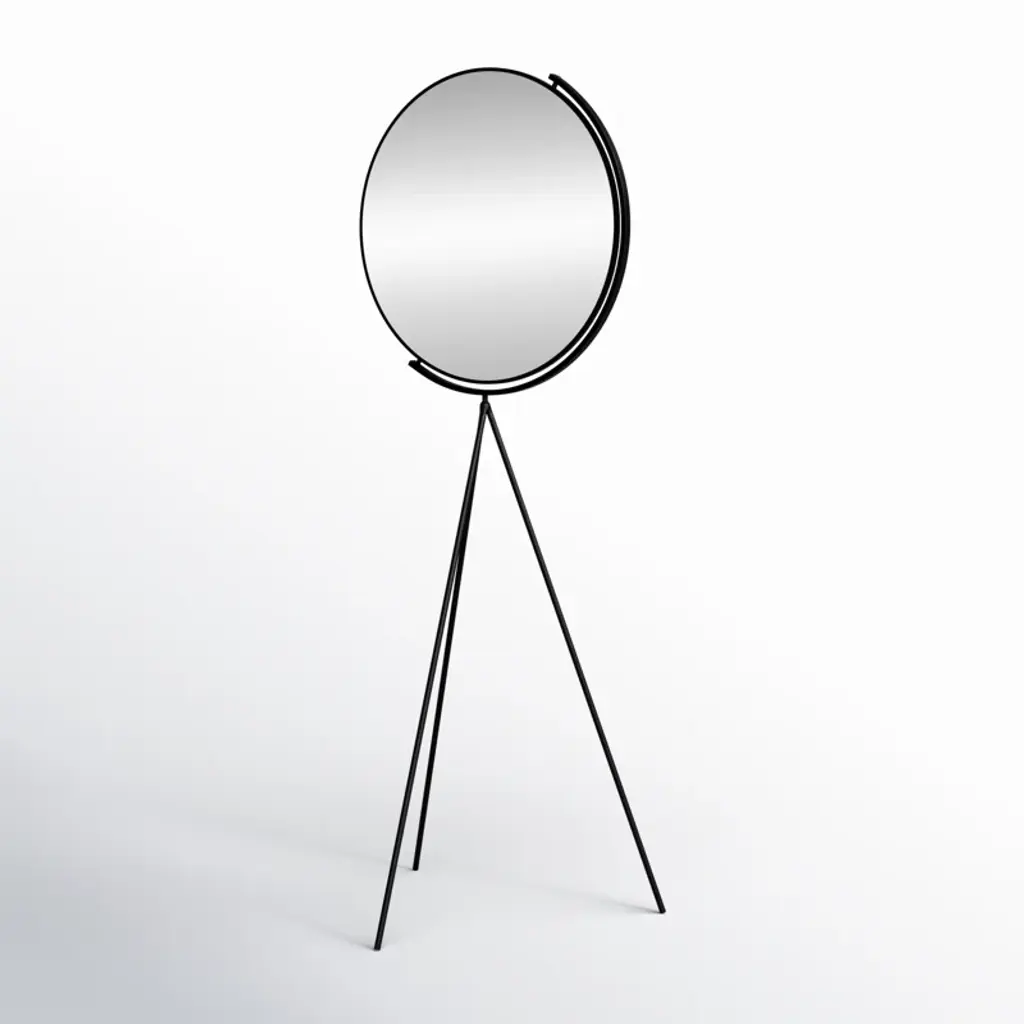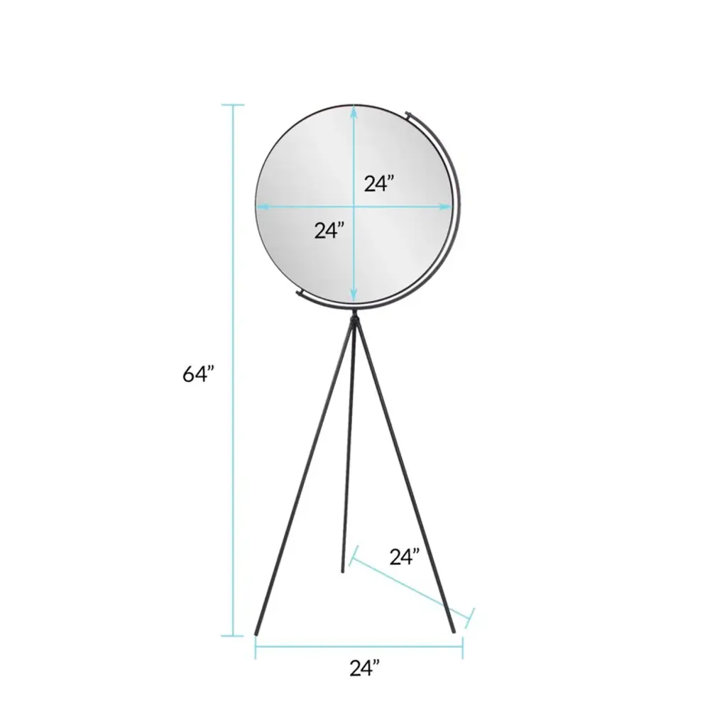 A sophisticated statement piece with its simple and sleek design, this floor mirror features black metal legs supporting a large round mirror face. This unique design adds versatility and intrigue to the mirror, making it both practical and stylish.