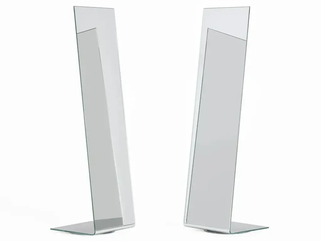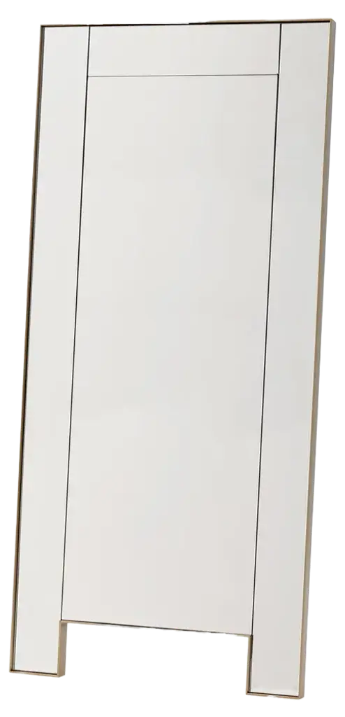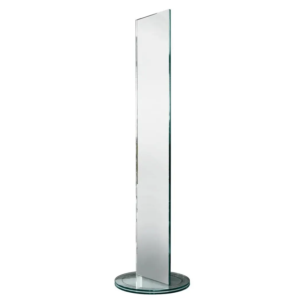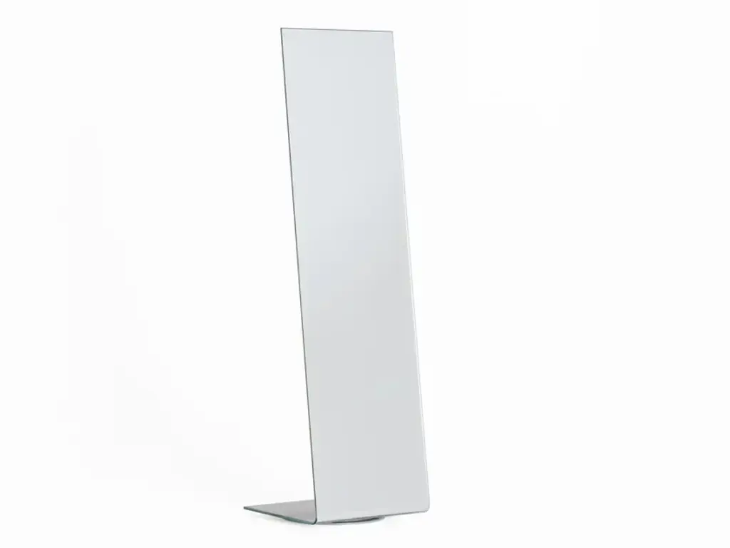 I MIRROR is a free standing floor mirror made from 12 mm extra clear curved and manually silvered glass.The vertical edges are embellished by a unique bullnose edge polishing.On the back, finished with a silver-grey lacquering, there is a discrete reinforcement which stiffens the glass panel.It is available in three different widths, with a removable counterweight which gives stability.The narrower version (code IMI01) has a swivel base.
