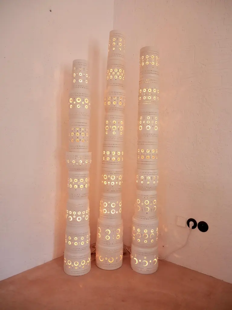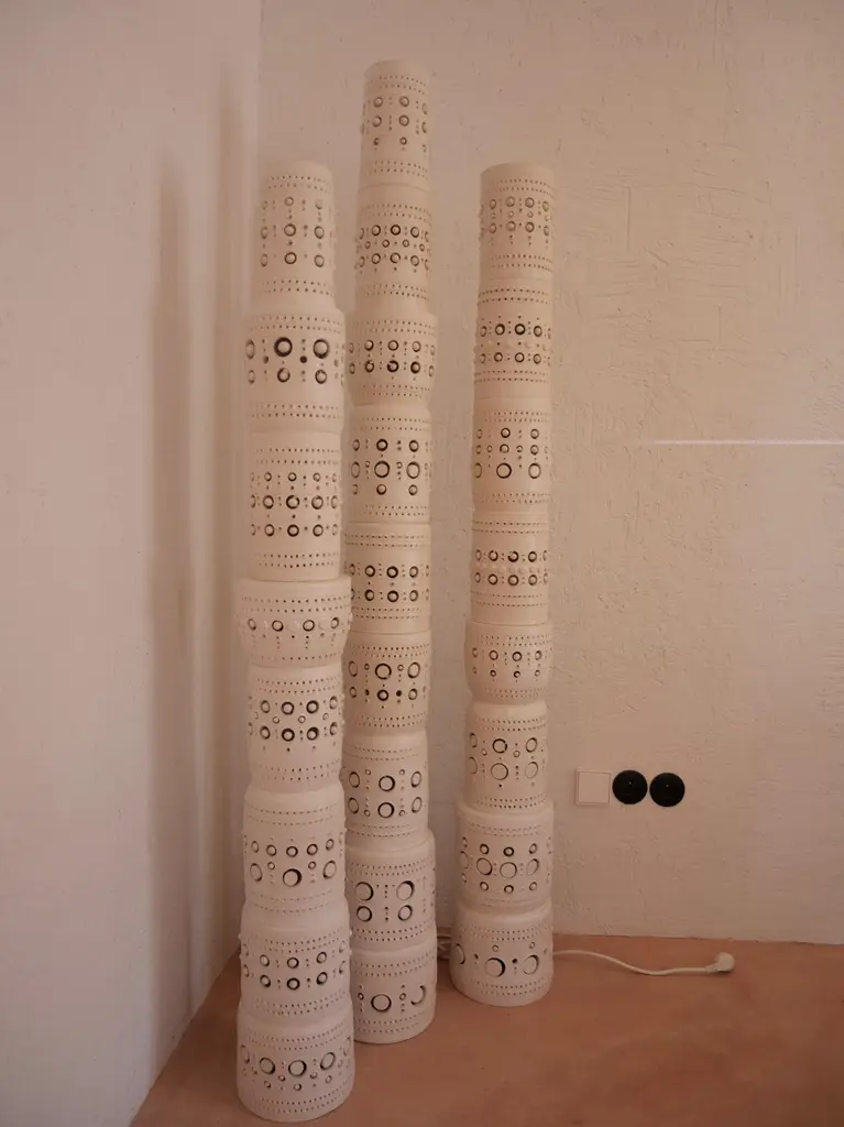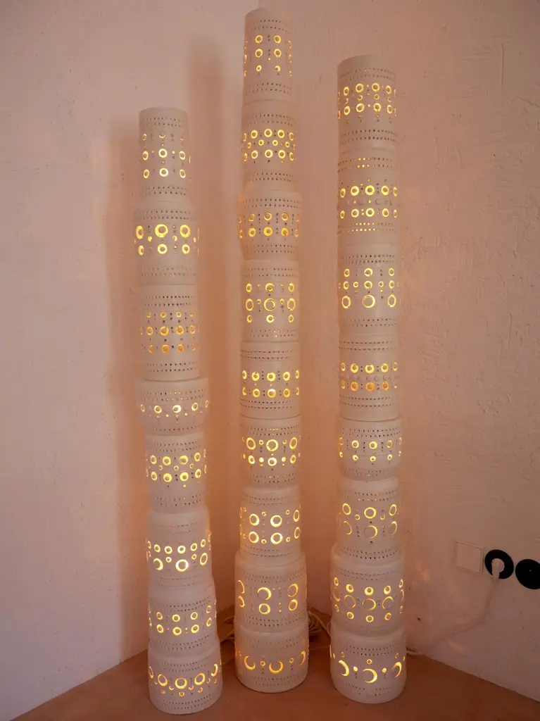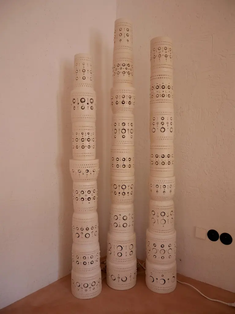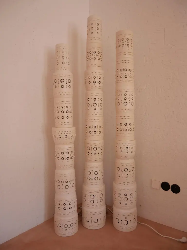 Set of 3 white TOTEM in enameled ceramic, floor lamps set bringing to your space an amazing light experience when the night falls, and a stunning sculptural presence during the day. Approximate dimensions height 155-165 -180 cm approximate.Georges Pelletier (1938) is a great contemporary artist exploring the fields of ceramics and lighting since the 1950s.Born in Brusels in 1938. At the tender age of 12 he enrolls in the École du Pioulier, founded by Célestin Freinet and located in Vence in the South of France. Here he learns free and modern art and discovers drawing and ceramics. During this period Pelletier starts showing solidarity and relief based on the principle of equality. This formation lends him a unique artistic identity. Georges Pelletier arrives to Paris in 1953 and continues with his drawing studies at l’Académie Charpentier meanwhile he still frequents Fernand Léger’s workshop. He enrolls the school of Métiers d’Art in 1955. Pelletier deepens into the world of ceramics during his time at Claude Pantzer’s workshop and the Potiers d’Accolay where he meets Raphael Giarusso with whom he will later share a work studio for over a year.“Drawing is the starting point of everything. I started design at the same time as ceramics at l’école Freinet. It’s an art that has allowed me to address my creations.” Pelletier opens his first studio in Paris in 1961. He is quickly signed up by Maison Bobois (now known as Roche Bobois), which spread and sold his light creations until 1973.Later on, Pelletier moves to Cannes where he continues his work on the conception of ceramic items, lamps, mirrors and other sculptures inspired in the 1960s. Besides, he also displays his work in the Consortium, Dijon Contemporary Art Centre in France.In the 1980s, he started to produce his famous TOTEMs and Suns, these pieces have allowed the rediscovery of this bold artist whose creative genius brings light to the world’s most beautiful homes.The work of Georges Pelletier is presented by Galeria Tambien, a gallery that focuses on art, ceramics and design from the 1950s to present days, it is located in the town of Santa Gertrudis de Fruitera right in the middle of Ibiza island.