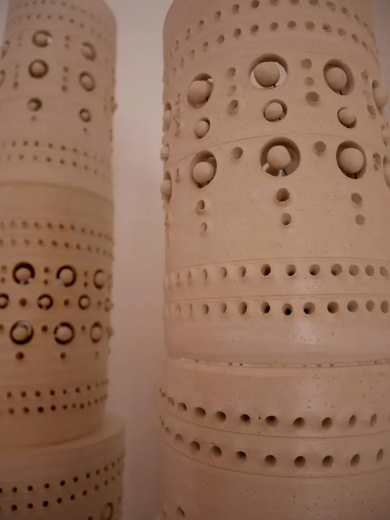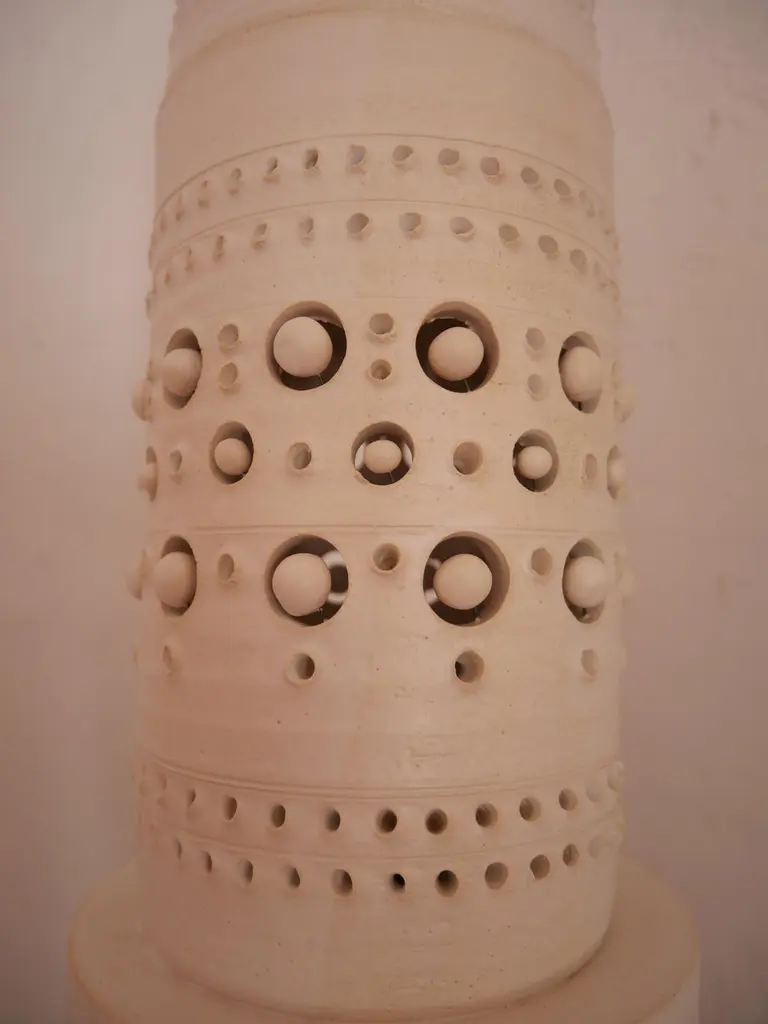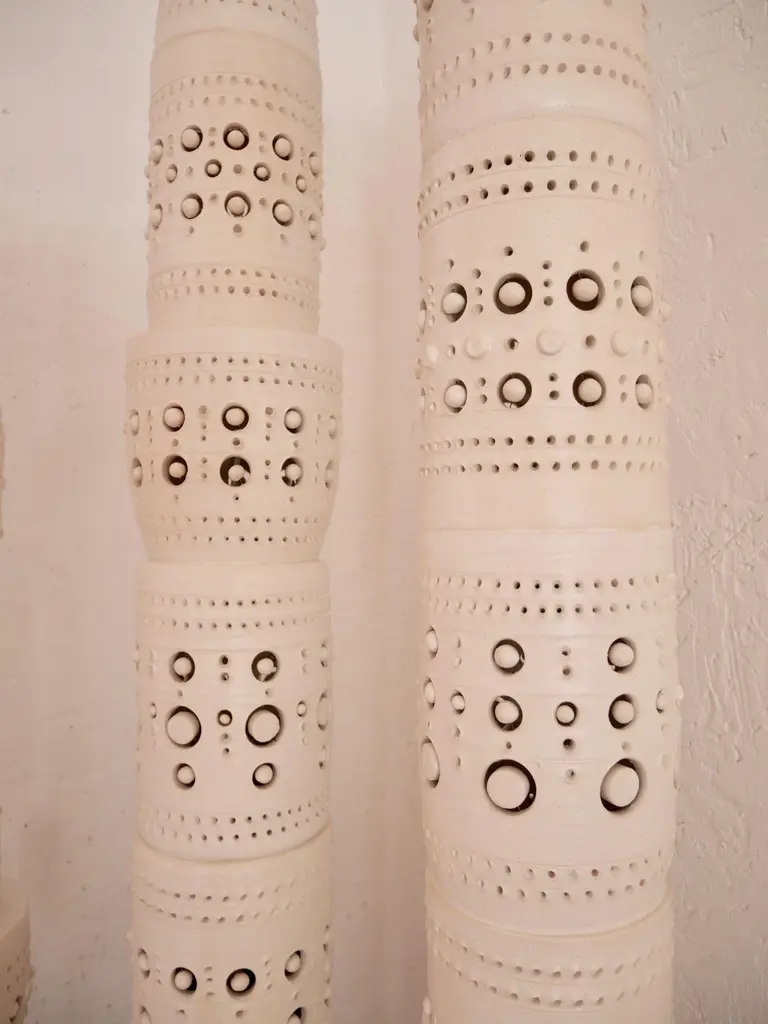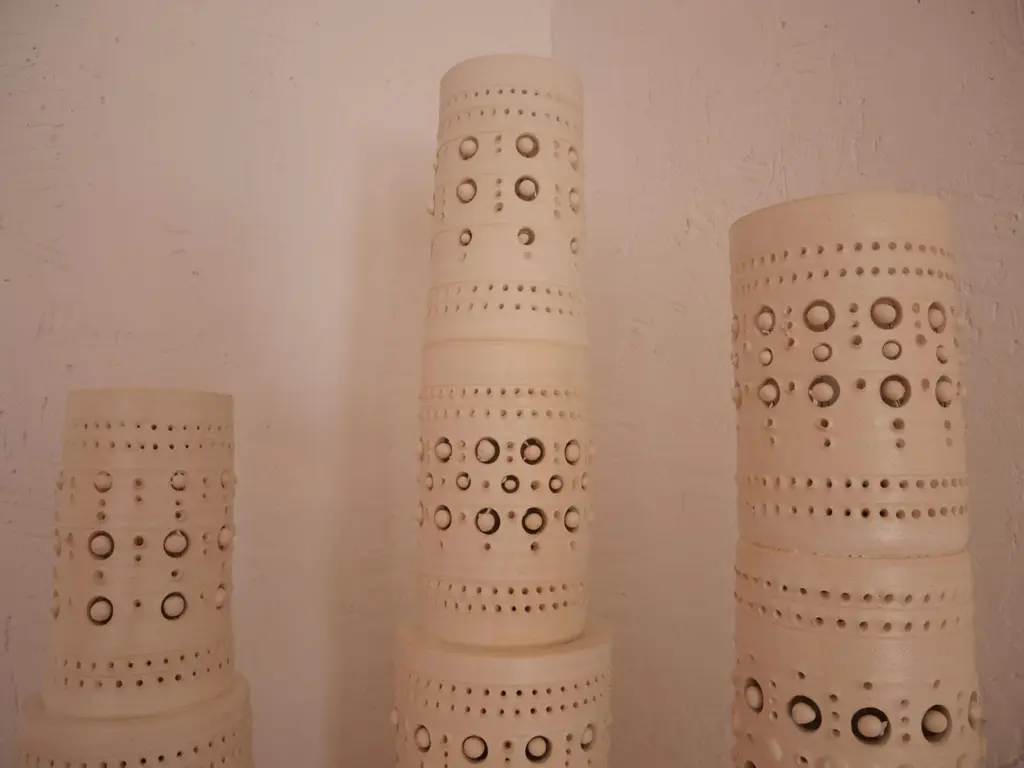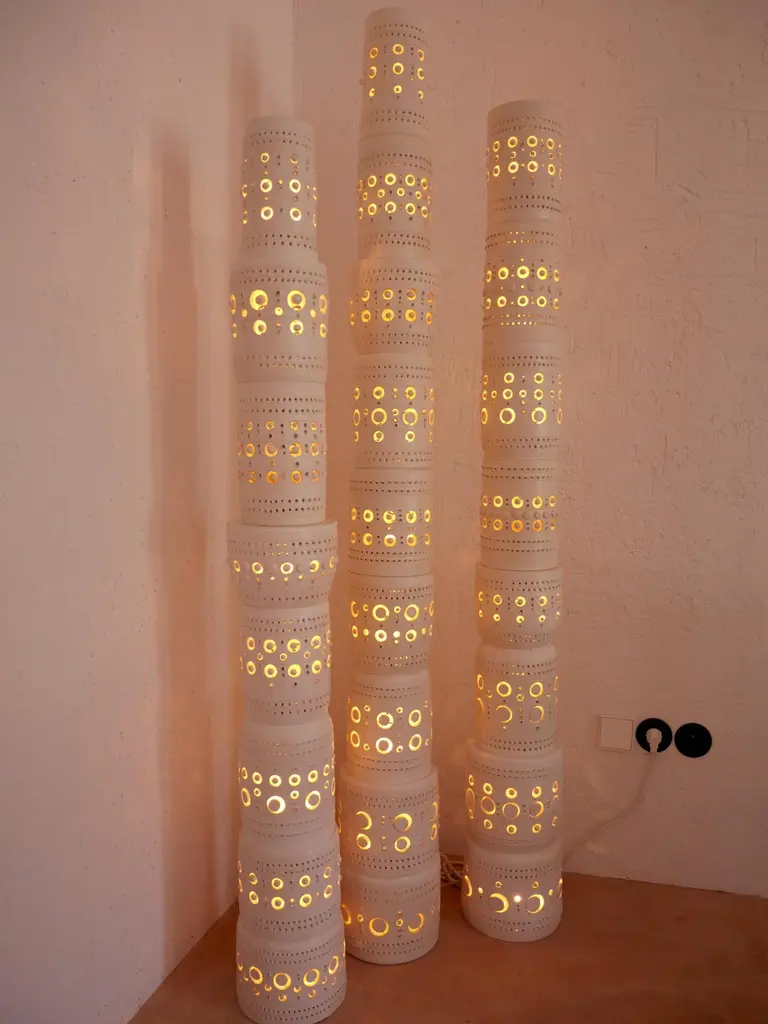 Set of 3 white TOTEM in enameled ceramic, floor lamps set bringing to your space an amazing light experience when the night falls, and a stunning sculptural presence during the day. Approximate dimensions height 155-165 -180 cm approximate.Georges Pelletier (1938) is a great contemporary artist exploring the fields of ceramics and lighting since the 1950s.Born in Brusels in 1938. At the tender age of 12 he enrolls in the École du Pioulier, founded by Célestin Freinet and located in Vence in the South of France. Here he learns free and modern art and discovers drawing and ceramics. During this period Pelletier starts showing solidarity and relief based on the principle of equality. This formation lends him a unique artistic identity. Georges Pelletier arrives to Paris in 1953 and continues with his drawing studies at l’Académie Charpentier meanwhile he still frequents Fernand Léger’s workshop. He enrolls the school of Métiers d’Art in 1955. Pelletier deepens into the world of ceramics during his time at Claude Pantzer’s workshop and the Potiers d’Accolay where he meets Raphael Giarusso with whom he will later share a work studio for over a year.“Drawing is the starting point of everything. I started design at the same time as ceramics at l’école Freinet. It’s an art that has allowed me to address my creations.” Pelletier opens his first studio in Paris in 1961. He is quickly signed up by Maison Bobois (now known as Roche Bobois), which spread and sold his light creations until 1973.Later on, Pelletier moves to Cannes where he continues his work on the conception of ceramic items, lamps, mirrors and other sculptures inspired in the 1960s. Besides, he also displays his work in the Consortium, Dijon Contemporary Art Centre in France.In the 1980s, he started to produce his famous TOTEMs and Suns, these pieces have allowed the rediscovery of this bold artist whose creative genius brings light to the world’s most beautiful homes.The work of Georges Pelletier is presented by Galeria Tambien, a gallery that focuses on art, ceramics and design from the 1950s to present days, it is located in the town of Santa Gertrudis de Fruitera right in the middle of Ibiza island.