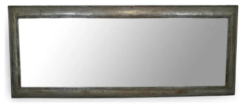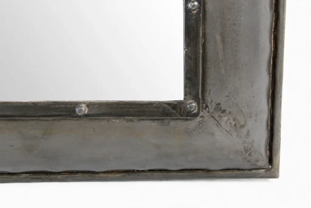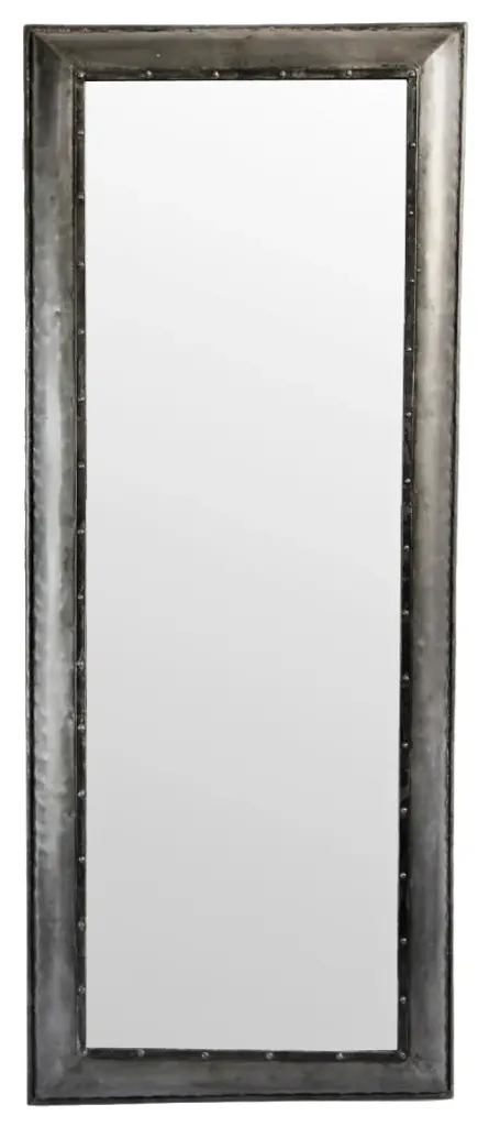 Industrial style full length mirror with gunmetal finish iron frame and rivet detail. Each may have slight variations in exact finish and distress of metal frame. This item is non-returnable - all sales are final.