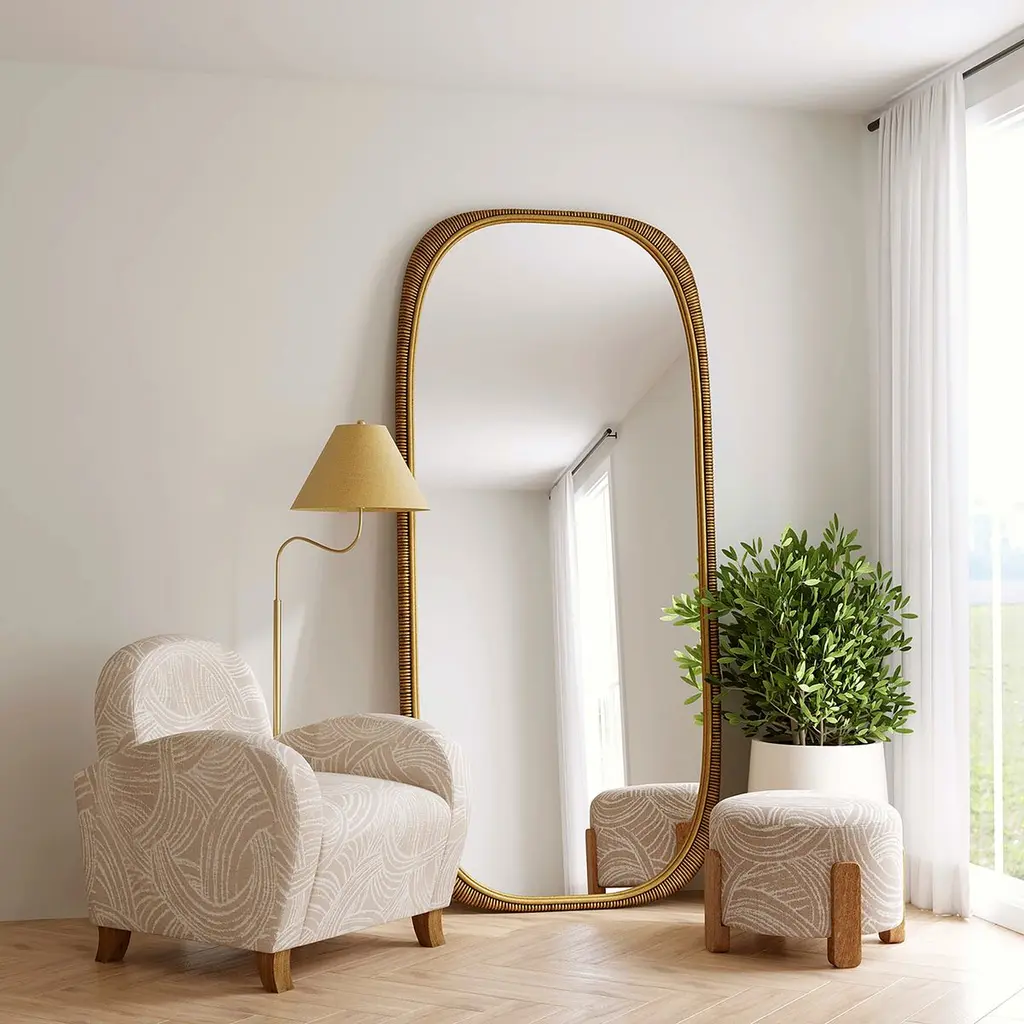 The Jamie Floor Mirror features a textured frame that adds a touch of glamour to any space. Its oversized design makes a bold statement, while the rounded corners soften the overall look. Perfect for modern interiors, this mirror enhances your room with both style and function. Whether placed in a living room, bedroom, or hallway, the Jamie Floor Mirror brings a luxurious, contemporary flair to your home decor.