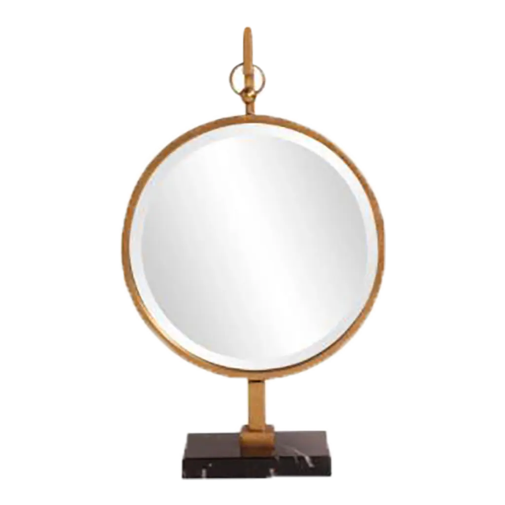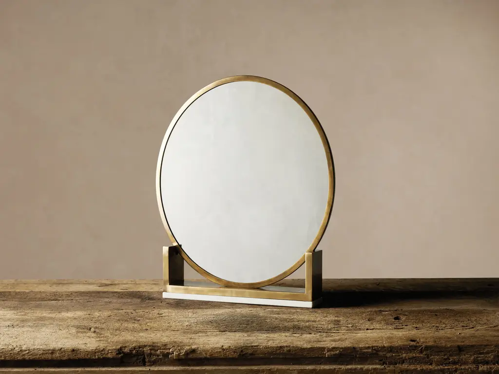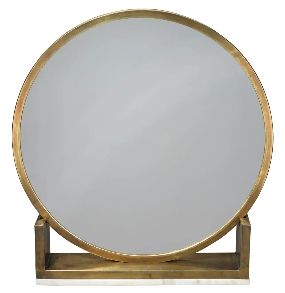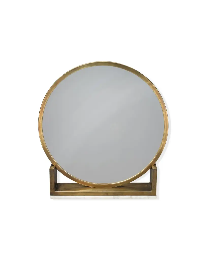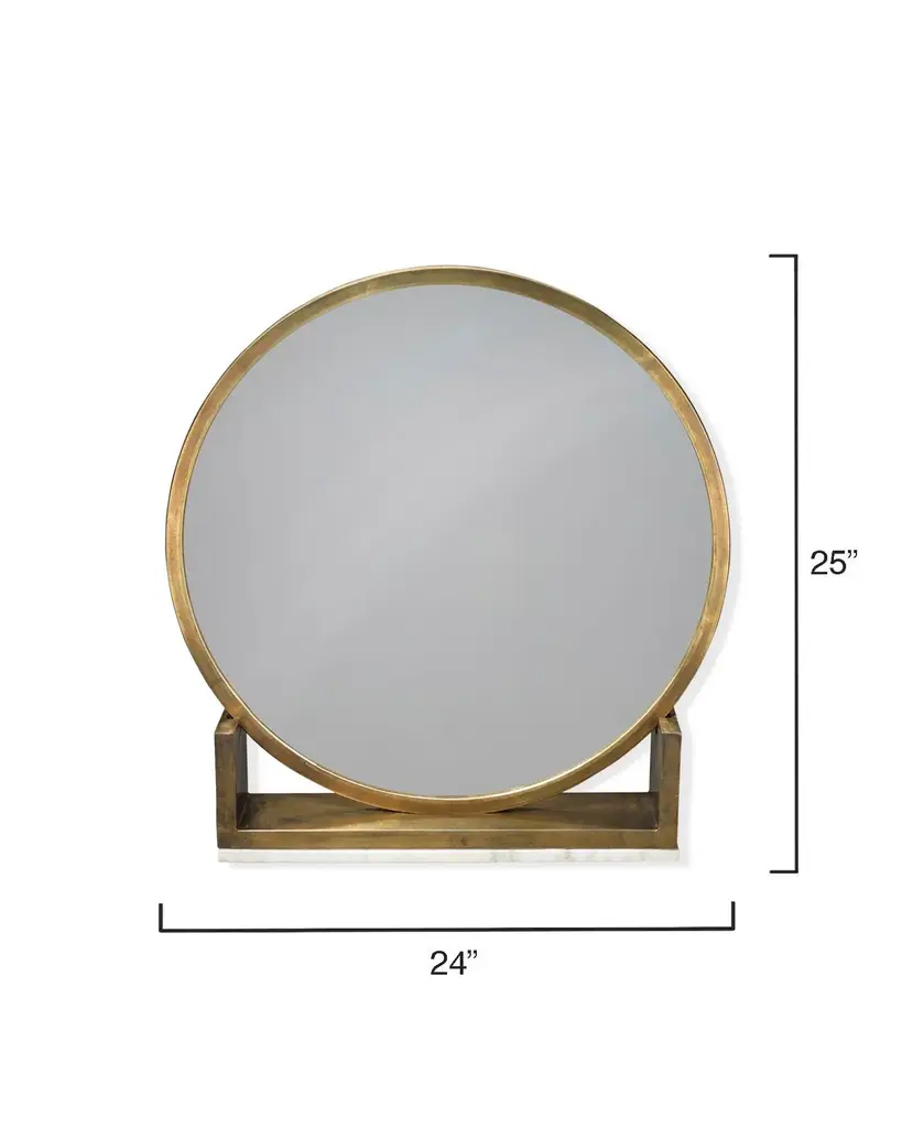 This modern twist on an elegant vanity mirror embraces simple lines in an antique brass finish and is delicately accented with a thin strip of white marble to ground this sophisticated design Handcrafted of Aluminum Metal in Antique Brass Patina Non beveled glass mirror Standing Mirror Accent Marble Base Mirror Surface: 22"H x 22"W Standing Mirror Frame: 1"W MDF Backing