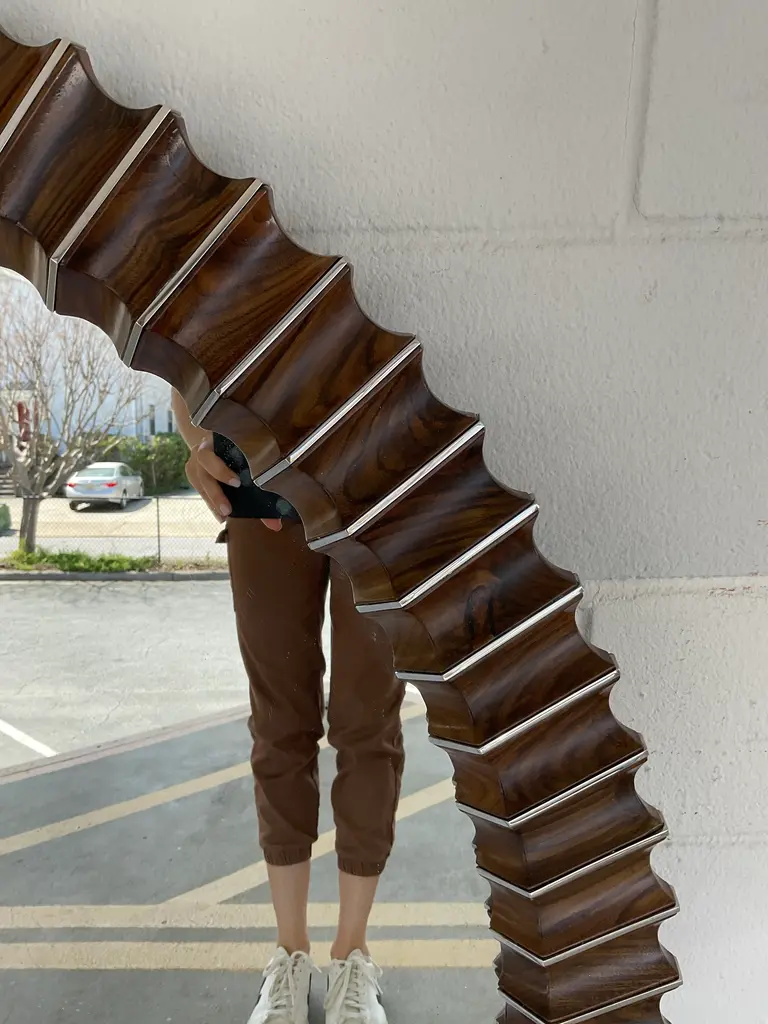 Original retail $4600, stylish Jonathan Charles Modern Nickel Gatsby Cosmo Wall Mirror, warm Reeded walnut frame with nickel design, showroom floor sample