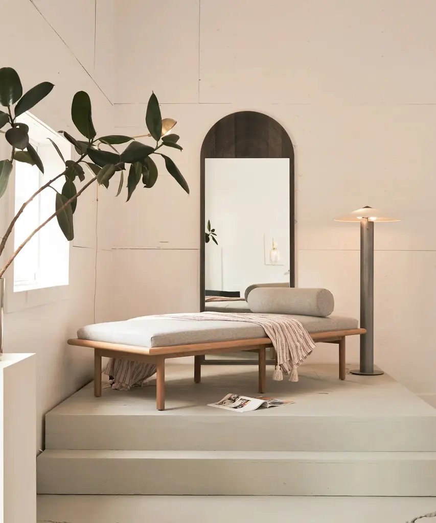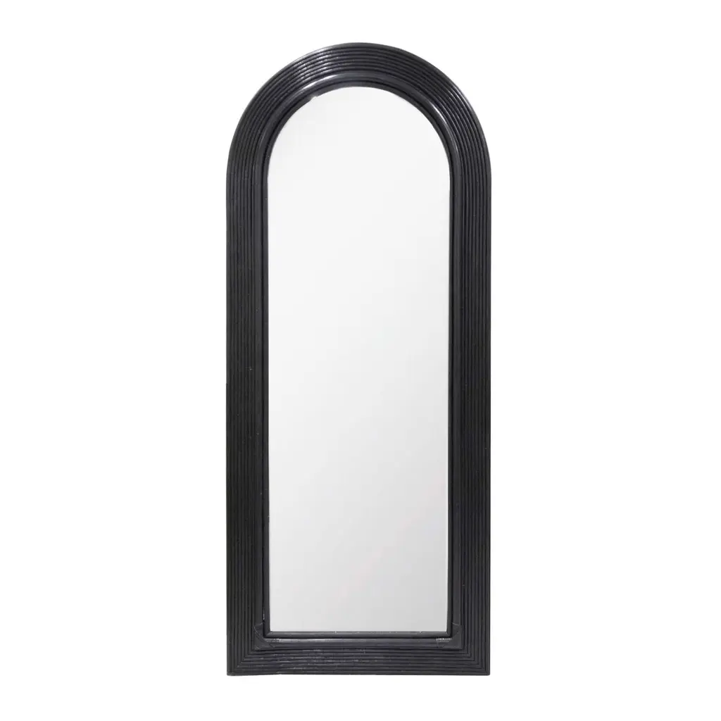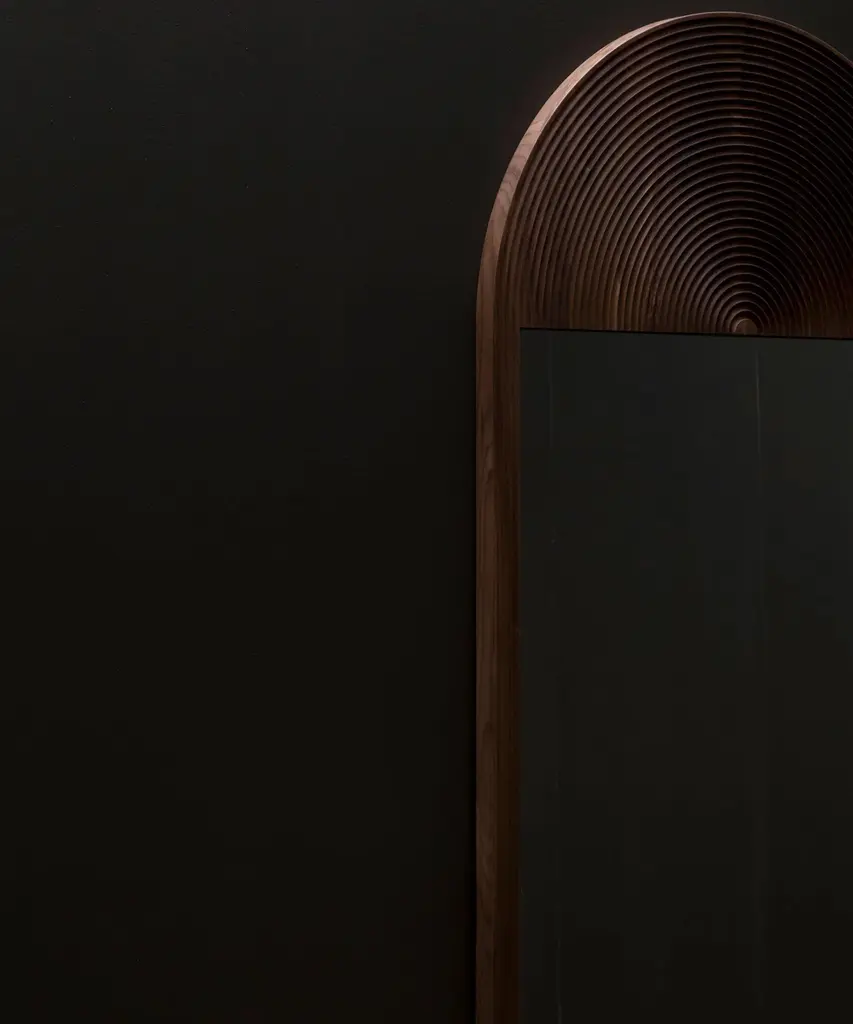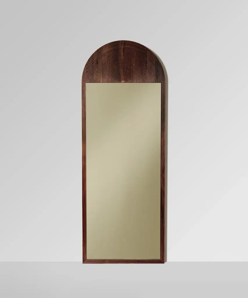 Concentric circles carved into the maple wood of the June Floor Mirror create a stunning sculptural pattern both modern and reminiscent of glamorous 1970s decor. This voluminous mirror reaches all the way to the floor and comes with mounting hardware. Each piece is designed and hand-produced by Coil + Drift, a lauded New York's Catskill Mountains based design studio known for its vividly three-dimensional and material-forward collections.