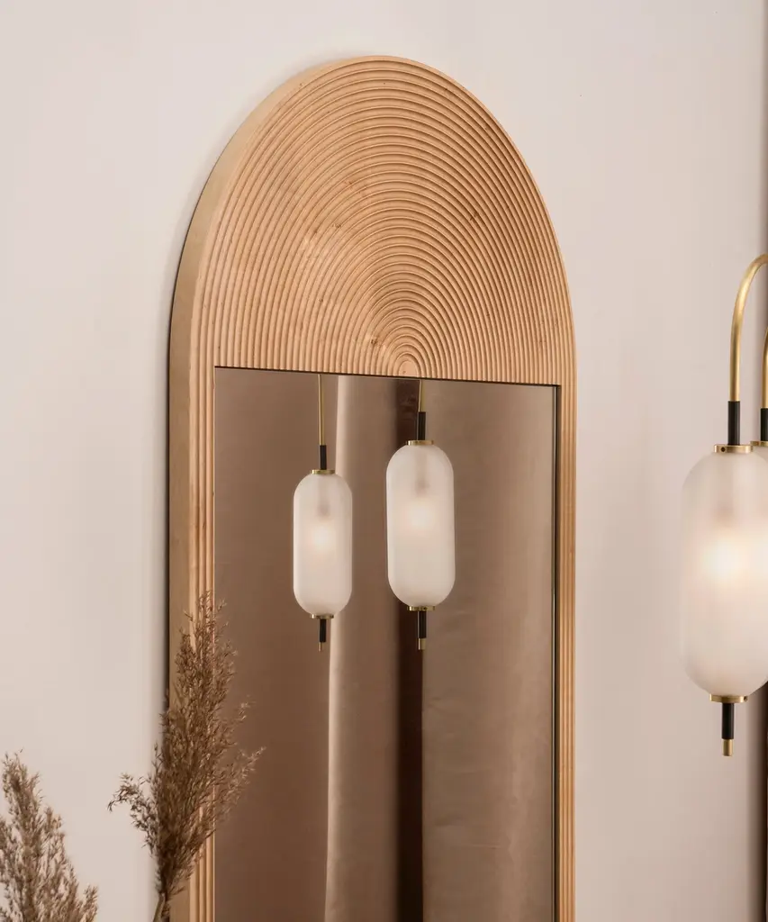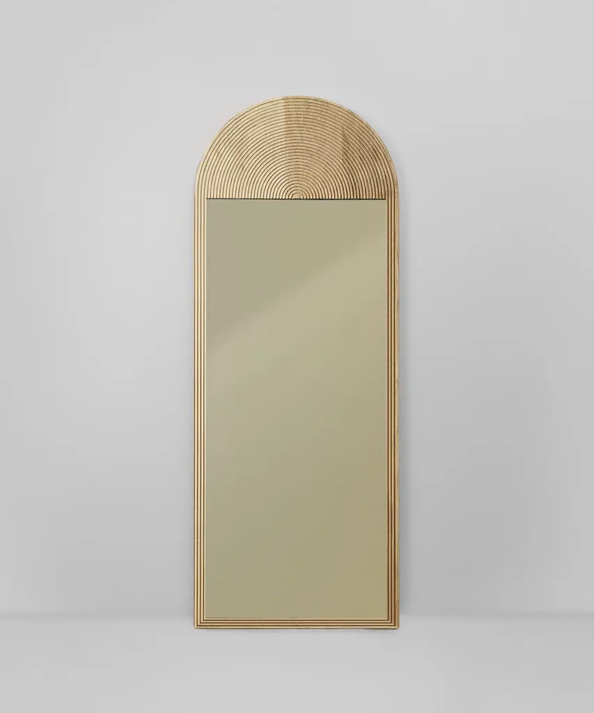 Concentric circles carved into the maple wood of the June Floor Mirror create a stunning sculptural pattern both modern and reminiscent of glamorous 1970s decor. This voluminous mirror reaches all the way to the floor and comes with mounting hardware. Each piece is designed and hand-produced by Coil + Drift, a lauded New York's Catskill Mountains based design studio known for its vividly three-dimensional and material-forward collections.