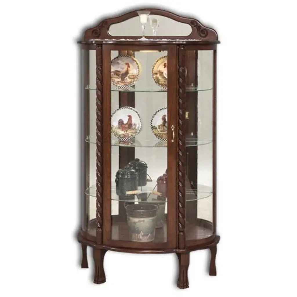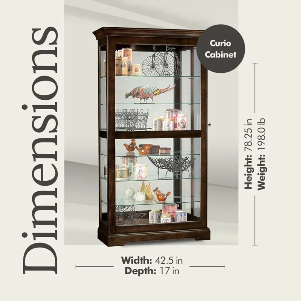 Select hardwoods and veneers locking the front door, with beveled glass slides in both directions for convenient access to the shelves. Two incandescent lights provided to illuminate your collectibles. No-reach roller light switch for interior lights is conveniently located on the back of the cabinet. A handy key holder is attached. A glass mirrored back enhances the view. Five adjustable glass shelves for six levels of display, with continuous holes for shelf adjustment. Plate grooves allow for vertical display of plates. Pad-lock cushioned metal shelf clips increase stability and safety. Adjustable levelers under each corner provide stability on uneven and carpeted floors.