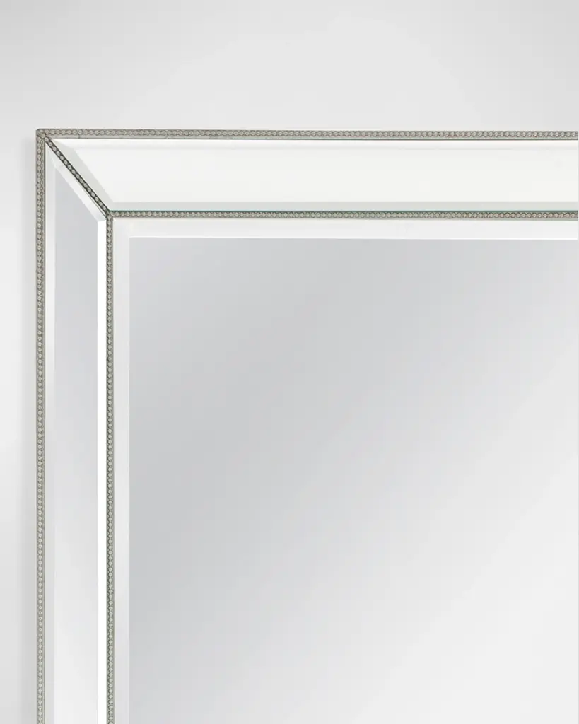 This floor mirror features a beveled glass frame with a beaded detail trim. The mirror continues into the frame, accented with the silver beading detail along the angled edges. Handcrafted of engineered hardwood, wood composite, and mirrored glass Overall, approx. 43"W x 3.35"D x 79"T Anti-tip kit included Wipe clean Weight, 108.0 lbs Imported Boxed weight, approximately 118.0 lbs Shipping Direct from Vendor, usually ships within 10 business days. undefined